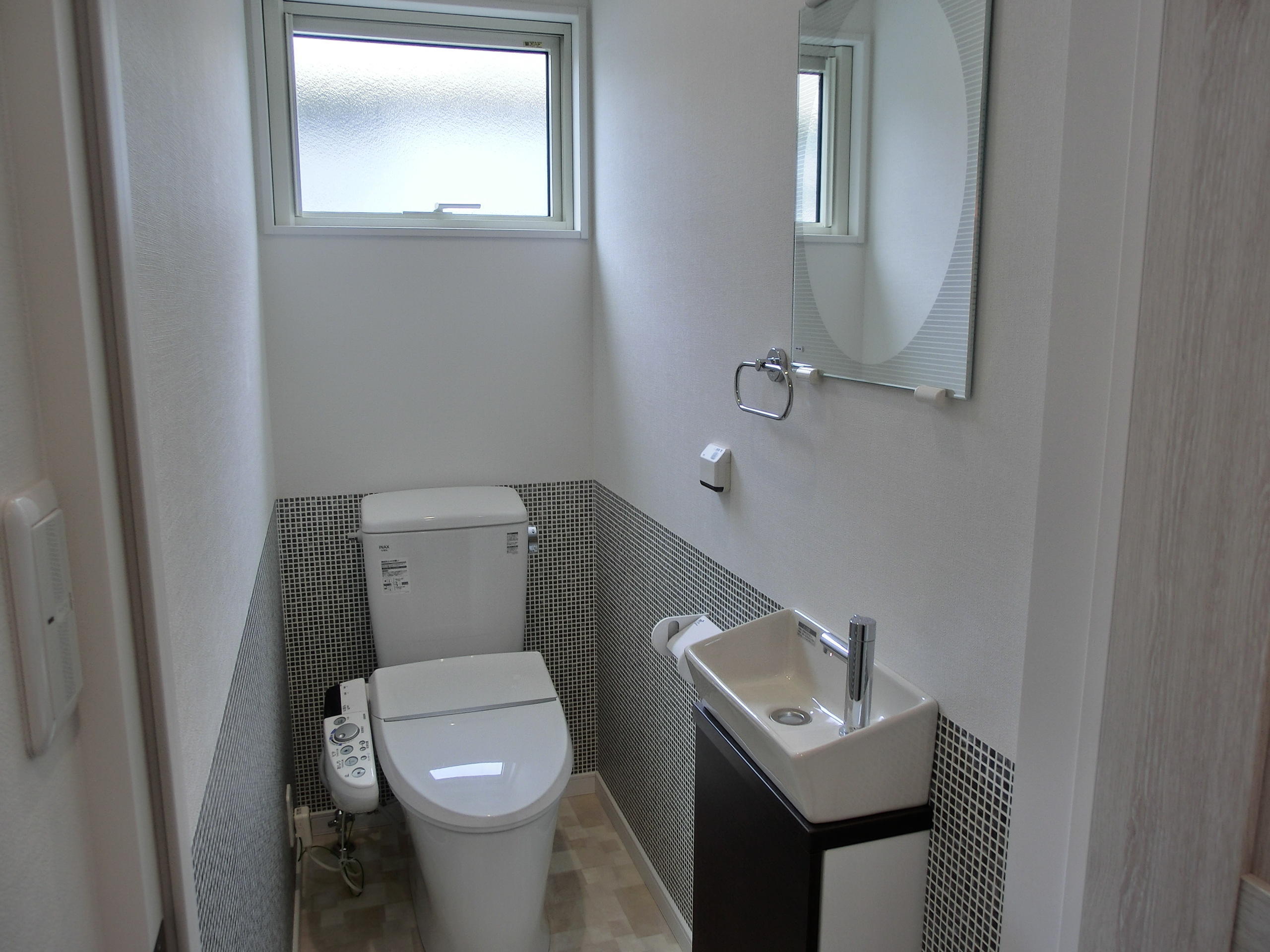 トイレの位置を変えました。便器はフチを丸ごとなくしたフチレス形状でお掃除もらくらくです。