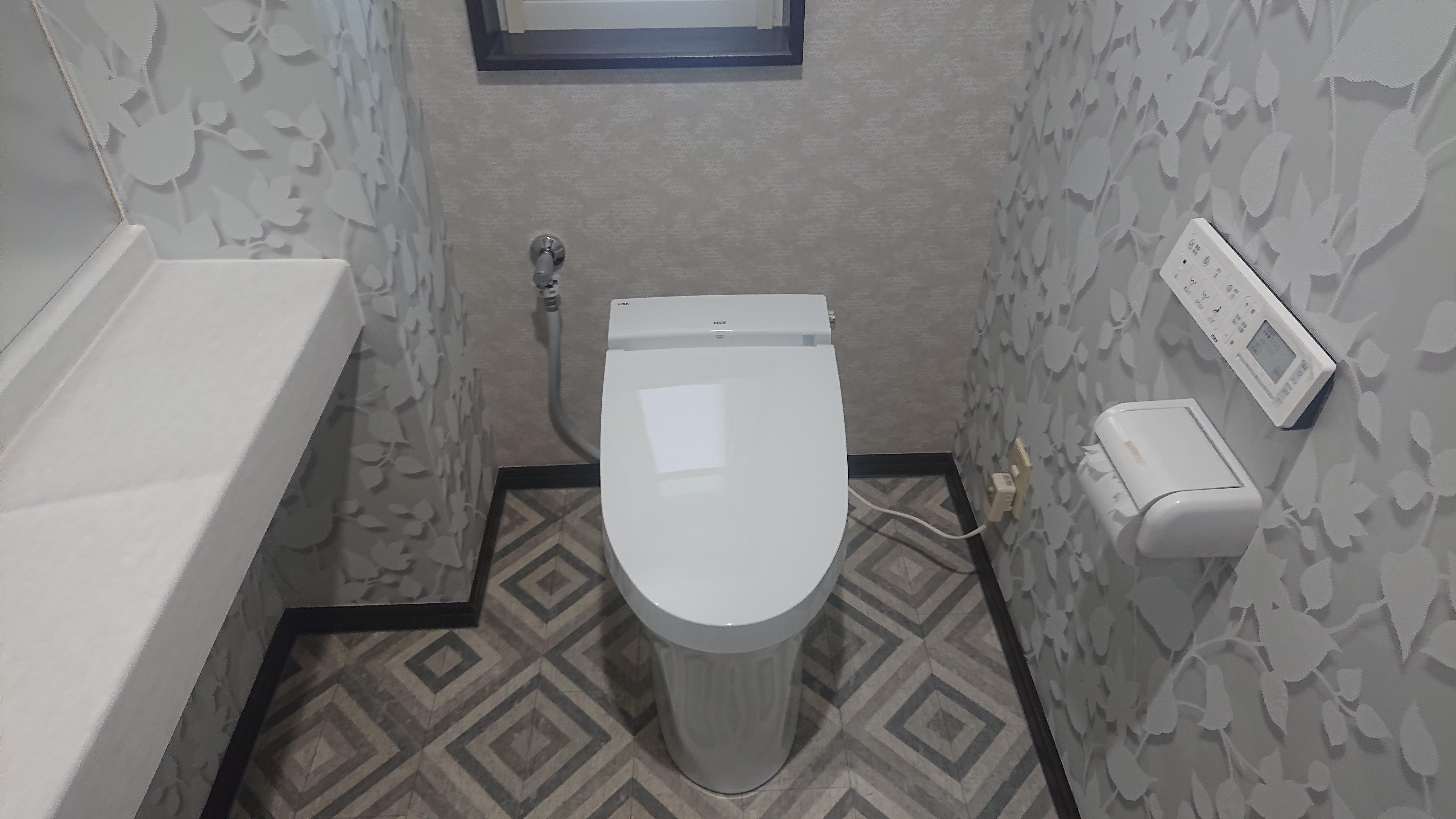 フロアとクロスの色合いや柄が高級感を感じさせます。また、タンクレスにしたことでスッキリ空間となりました。 汚れが落ちやすく、キズや細菌にも強いアクアセラミックで陶器の美しさを長く保ちます。便座が真上に上がる「お掃除リフトアップ」ですき間汚れの掃除もラクラクです。掃除がラクで、節水節電などいろいろな機能で、キレイと快適を備えたトイレです。