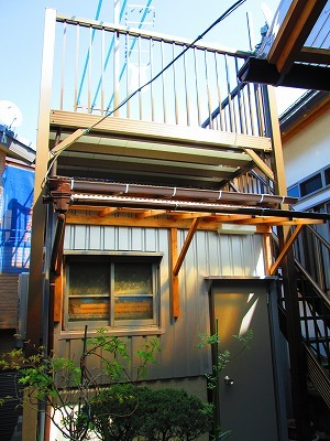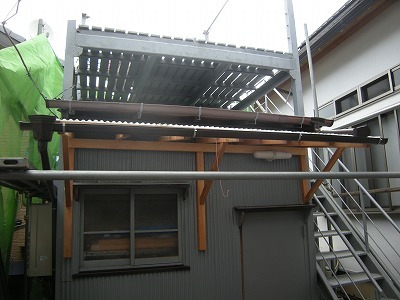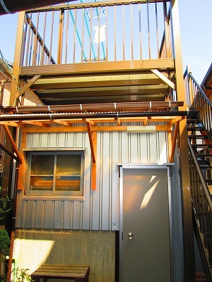 長年、使い続けた愛着のある物干し台をリフォーム。スカイポート・バルコニーを設置。ドア交換に加えガルバニウム鋼板で外壁を張り替えました。