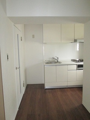 真っ白なキッチン。クリエモカのカラーのフローリングと相性抜群です。