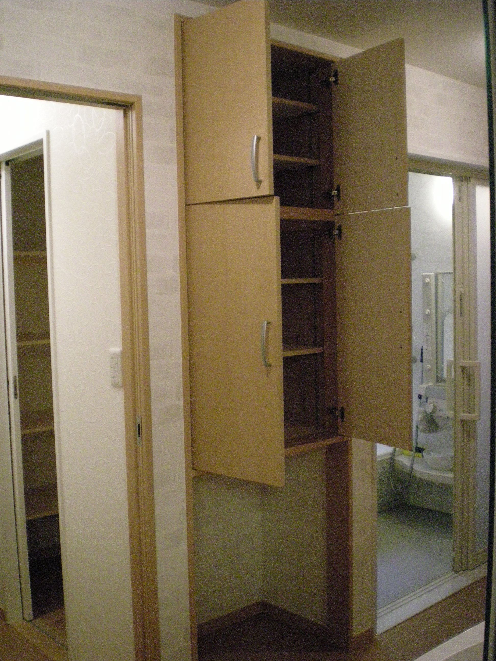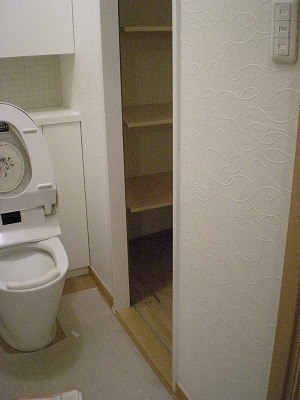 浴室リフォームの際、浴室の壁とトイレの間に空間ができたので、施主様ご希望により、収納庫を