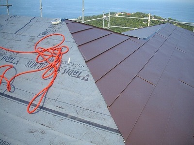 相模湾を一望する素晴らしい眺望を持つT様邸。 しかし、眺望が良いということは絶えず強風との戦いです。 既存の古い屋根材の上にガムロン(左側)という、粘着テープ付の防水紙を貼り ガルバリュウム鋼板(右側)を貼って劣化や強風に強い 屋根に生まれ変わりました。