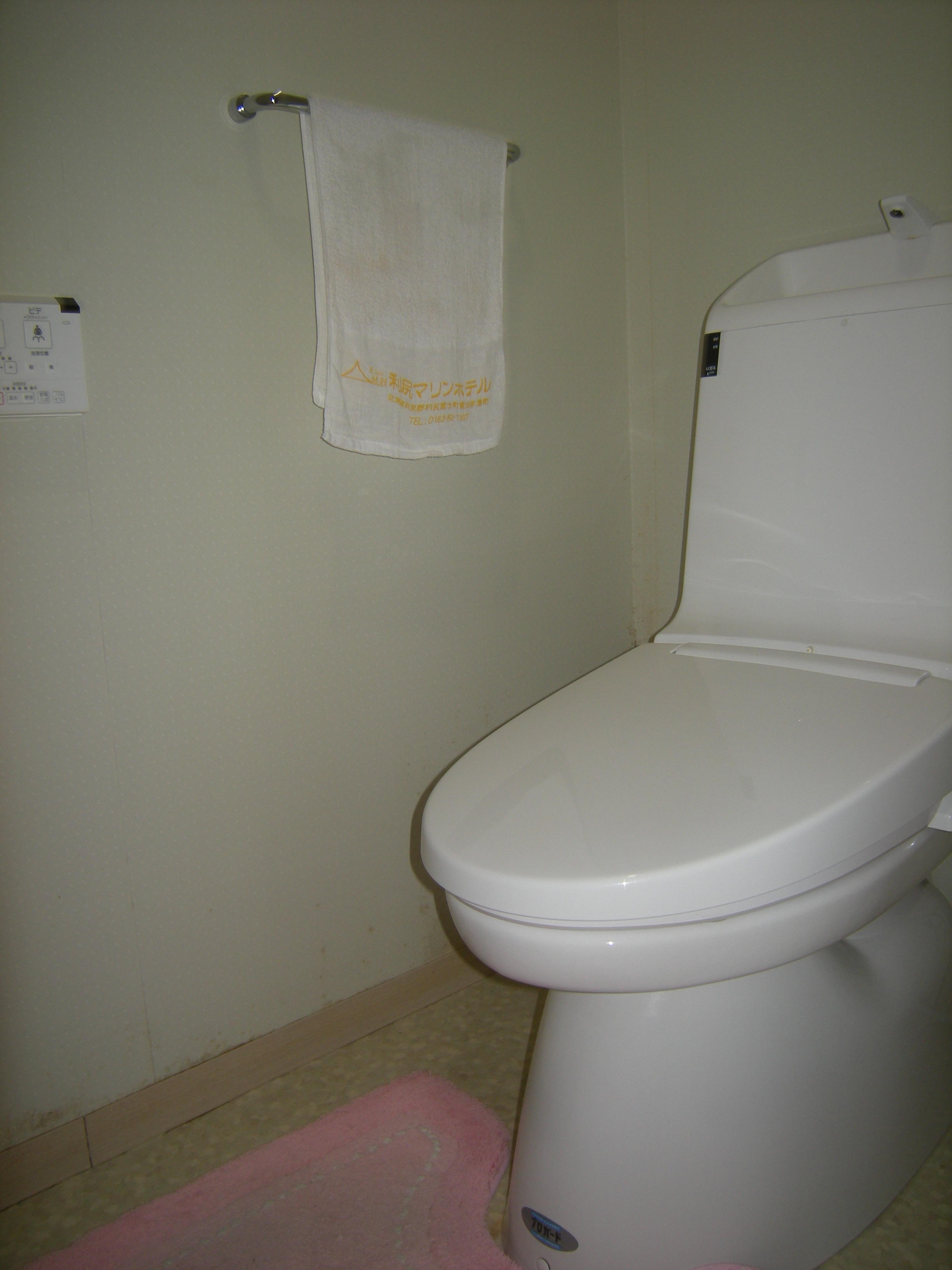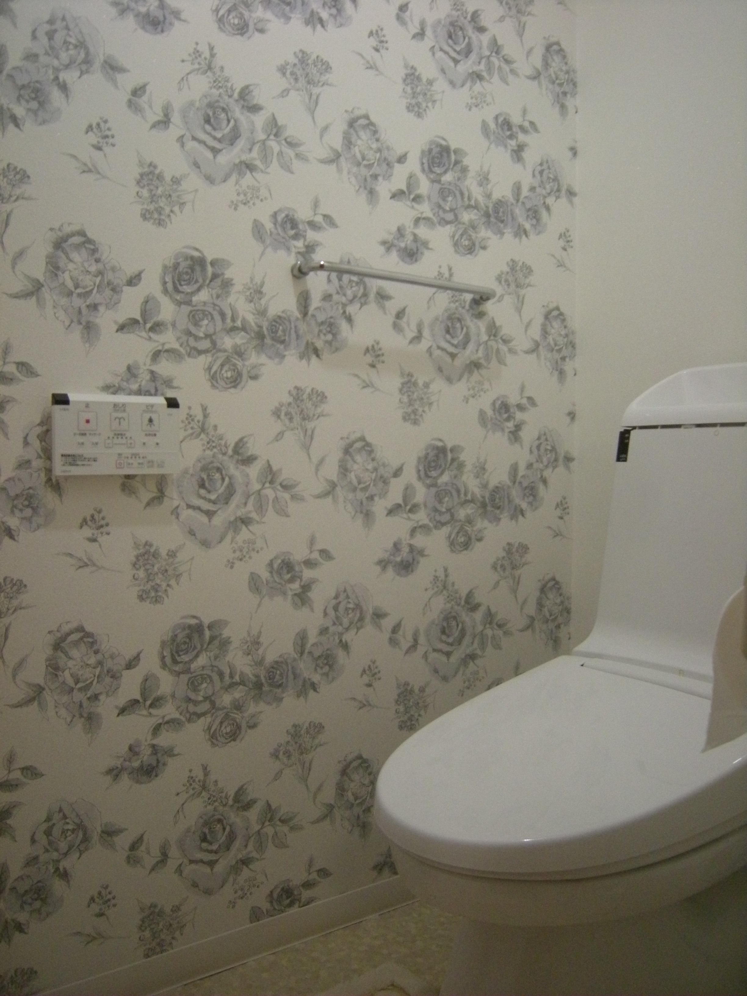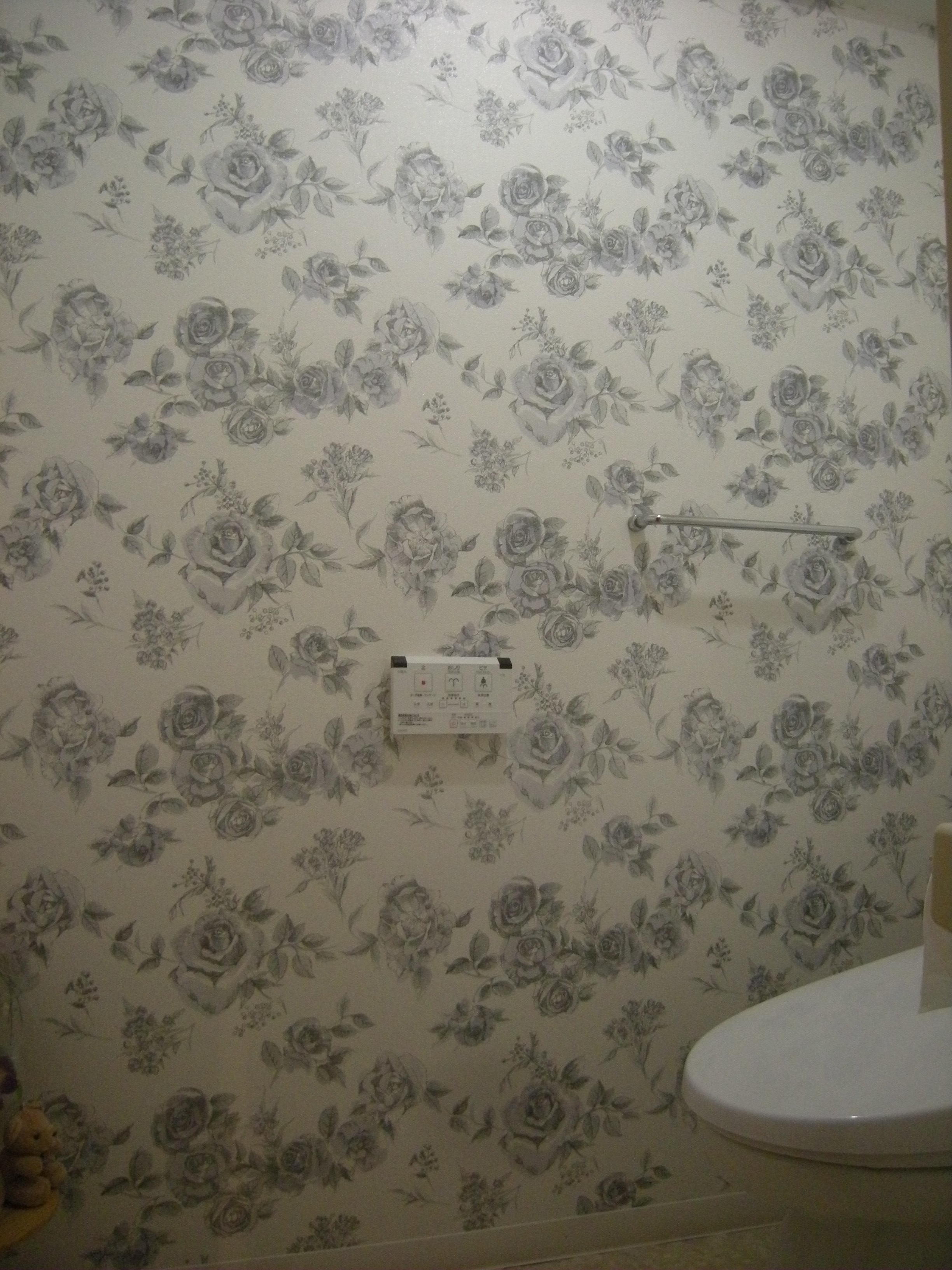 殺風景なトイレを、インパクトのある大柄のクロスを側面のみに貼るだけで全くちがう雰囲気になりました。
