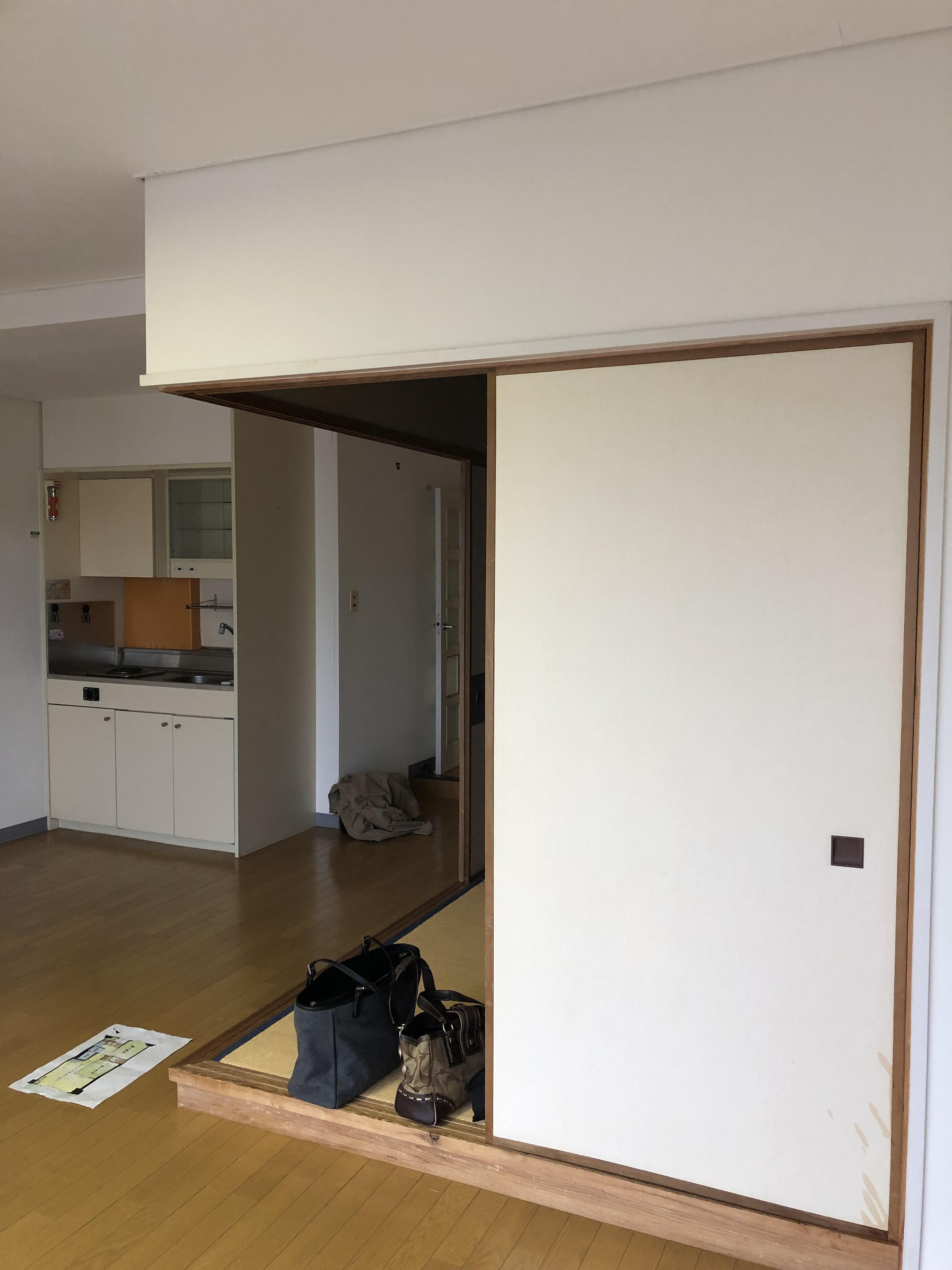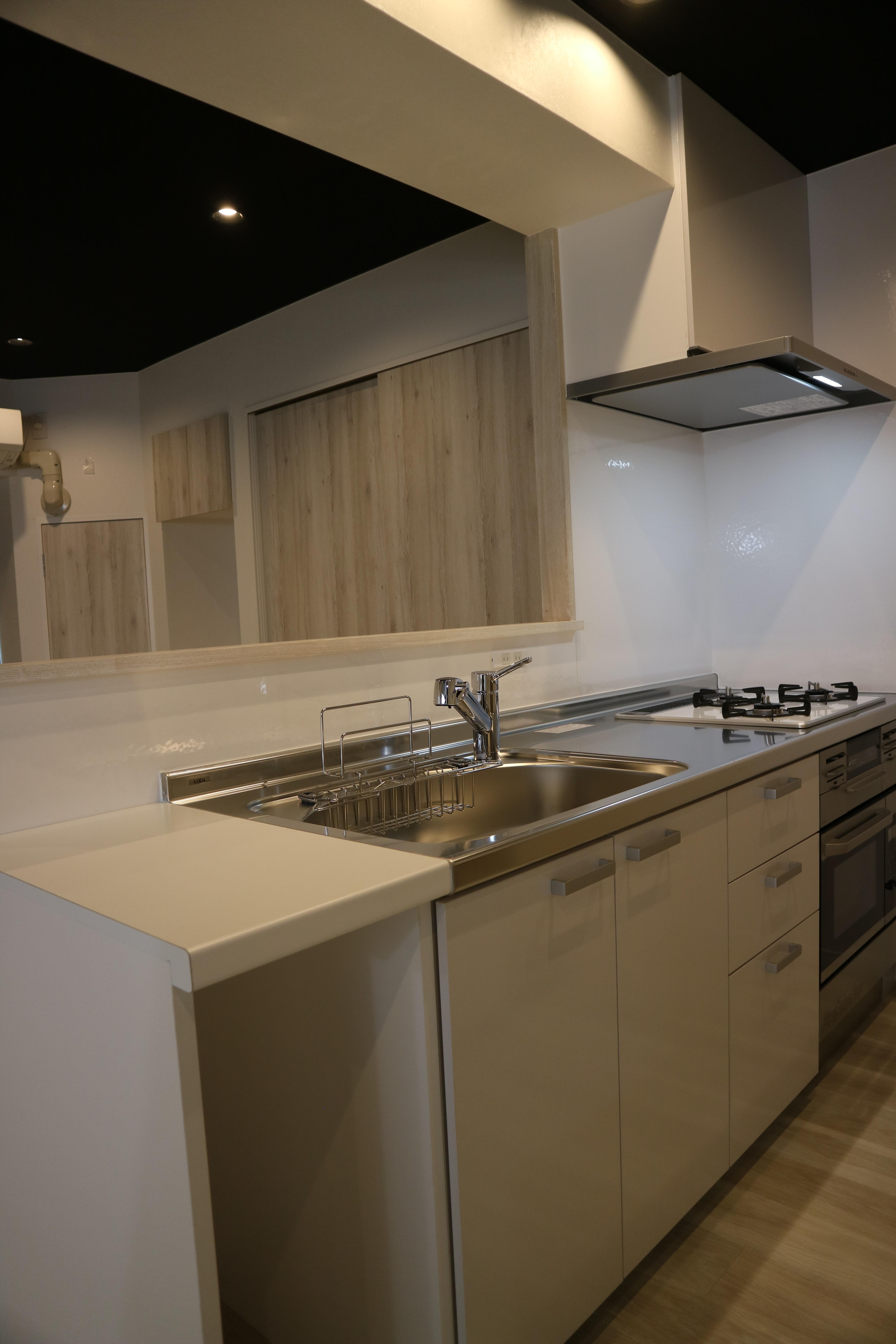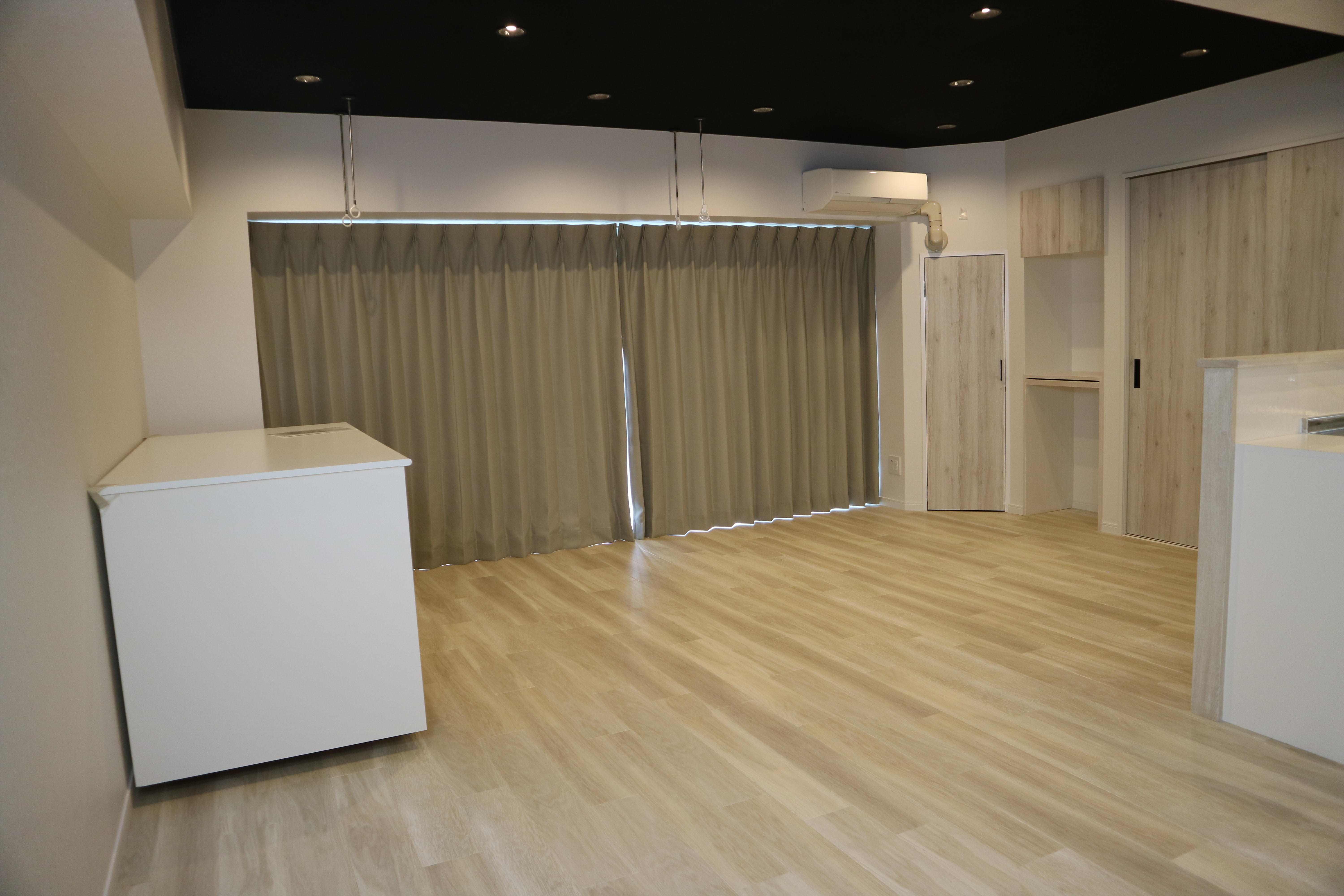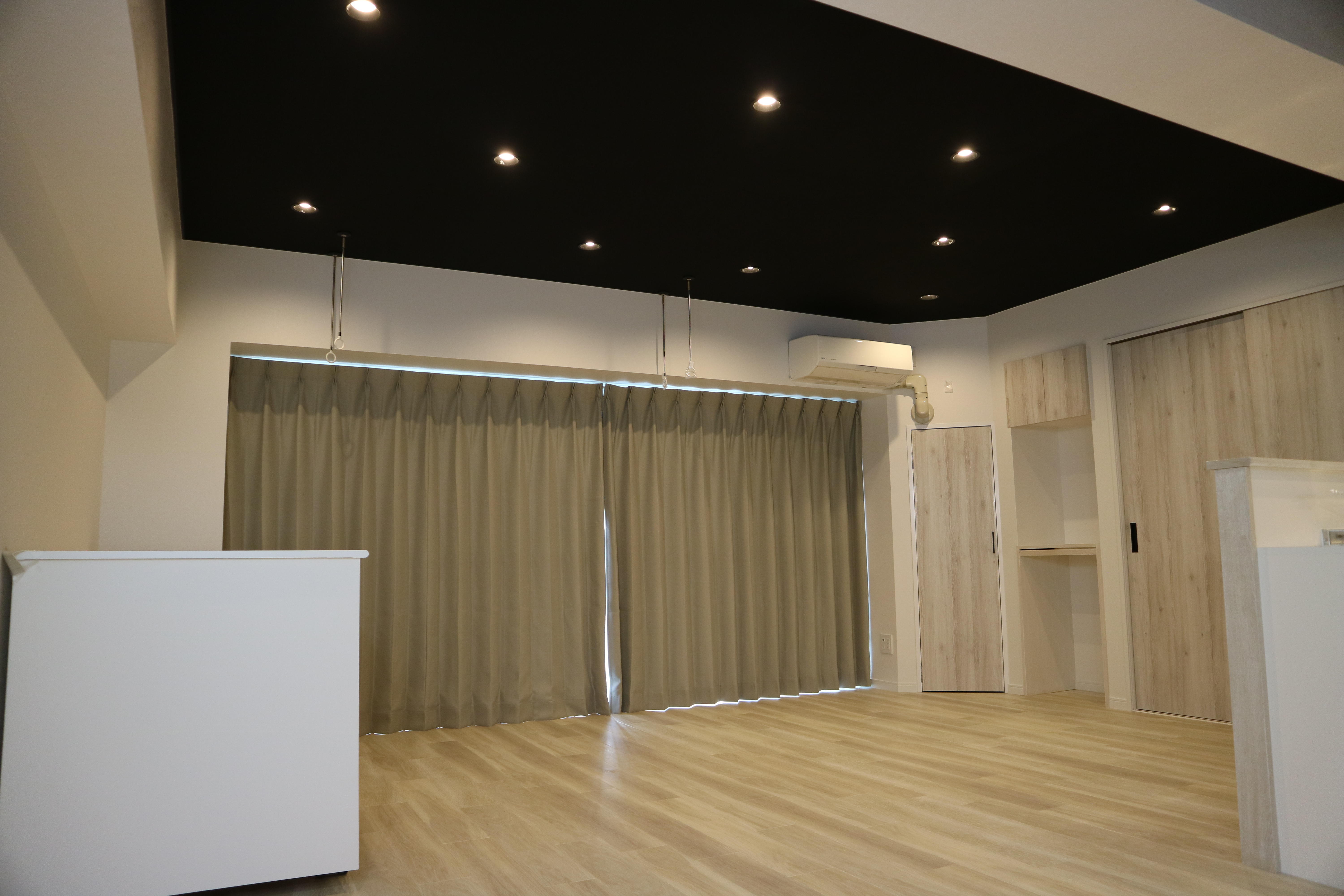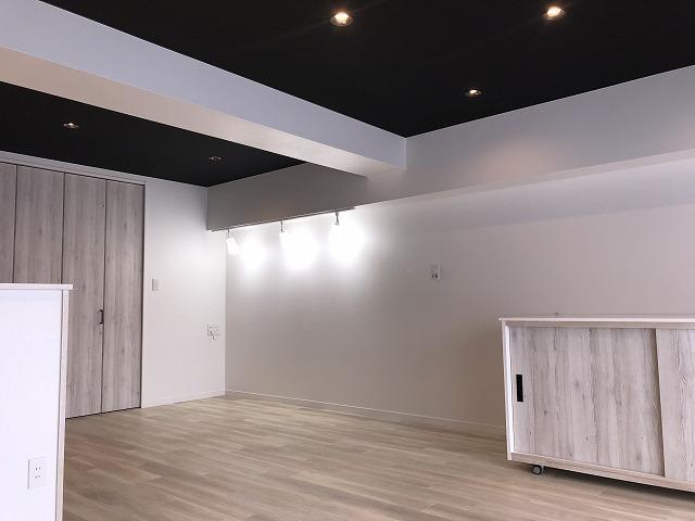 和室を撤去してワンフロアに。天井はヘルスコートの炭の黒とダウンライトがデザイン性をアップさせます。フローリングのホワイトブラシオークがお部屋全体を明るくします。