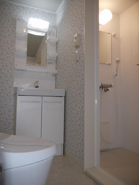 明るい雰囲気の花模様の壁紙にコンパクトなリクシルシャワートイレ。清潔感のある洗面化粧台。こちらのリゾートマンションは大浴場完備。過去3部屋の弊社でのリフォームにも浴室を設けませんでしたが、「お孫様が海遊びのあとにちょこっと浴びる程度のシャワーユニットは必要」のご提案をさせて頂き今回初めてとなるシャワーユニット。S様の「なんとかしたい!」にお応えしました!