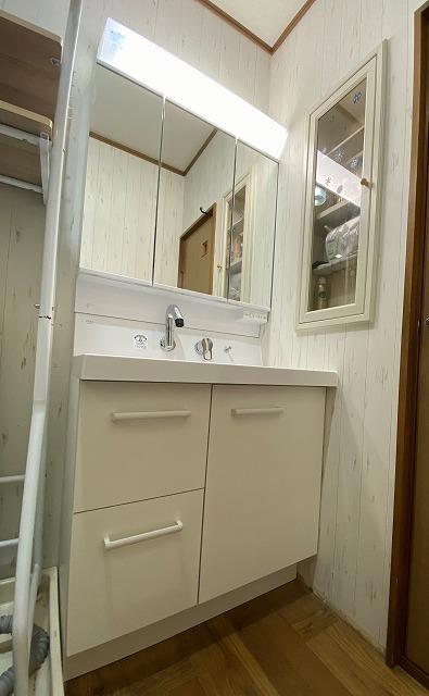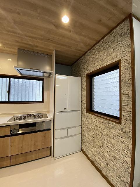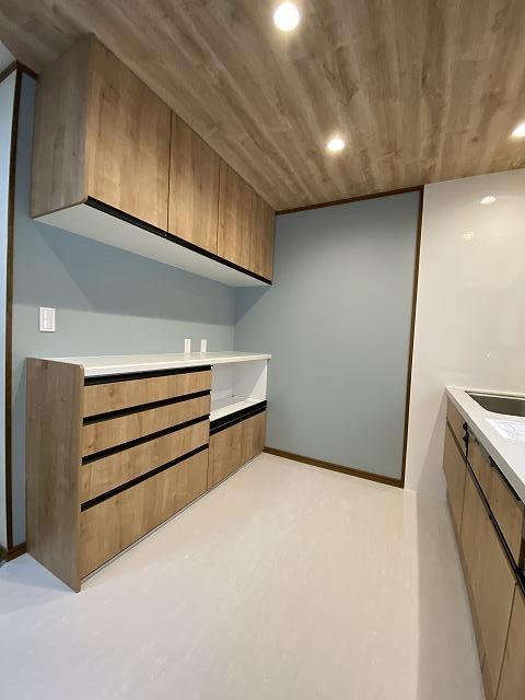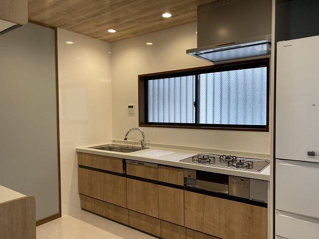 弊社での、外部塗装工事が無事に終了のN様邸。今回は、念願だったキッチンと洗面化粧台のリフォームです。娘様が選んだ壁紙もとってもお洒落でここだけショールームの雰囲気に仕上がり皆様大満足です。