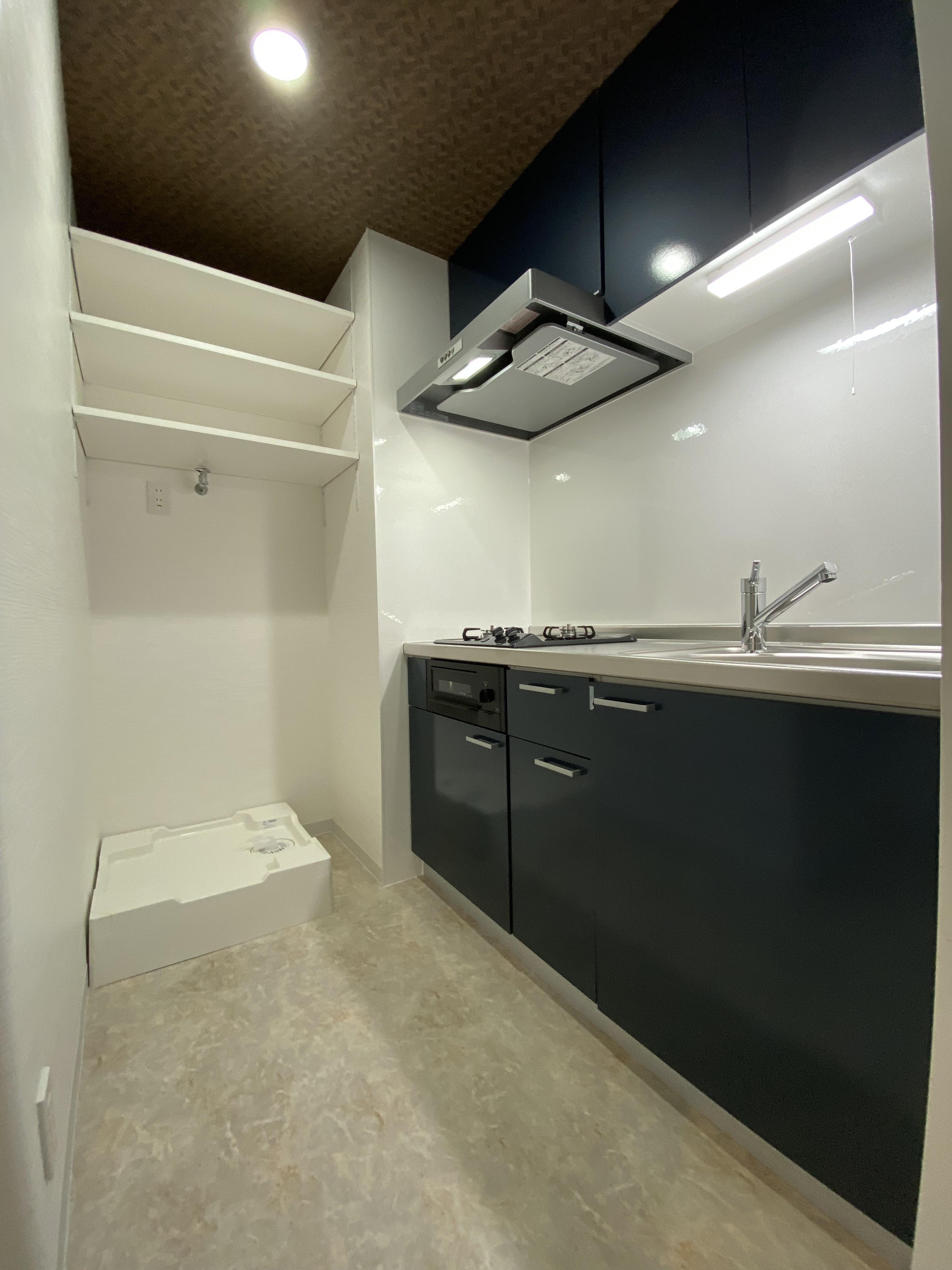 使い勝手の良いキッチンはリクシル・コンパクトキッチン・ティオ。奥は洗濯機置き場とその上に嬉しい可動棚。収納力抜群!