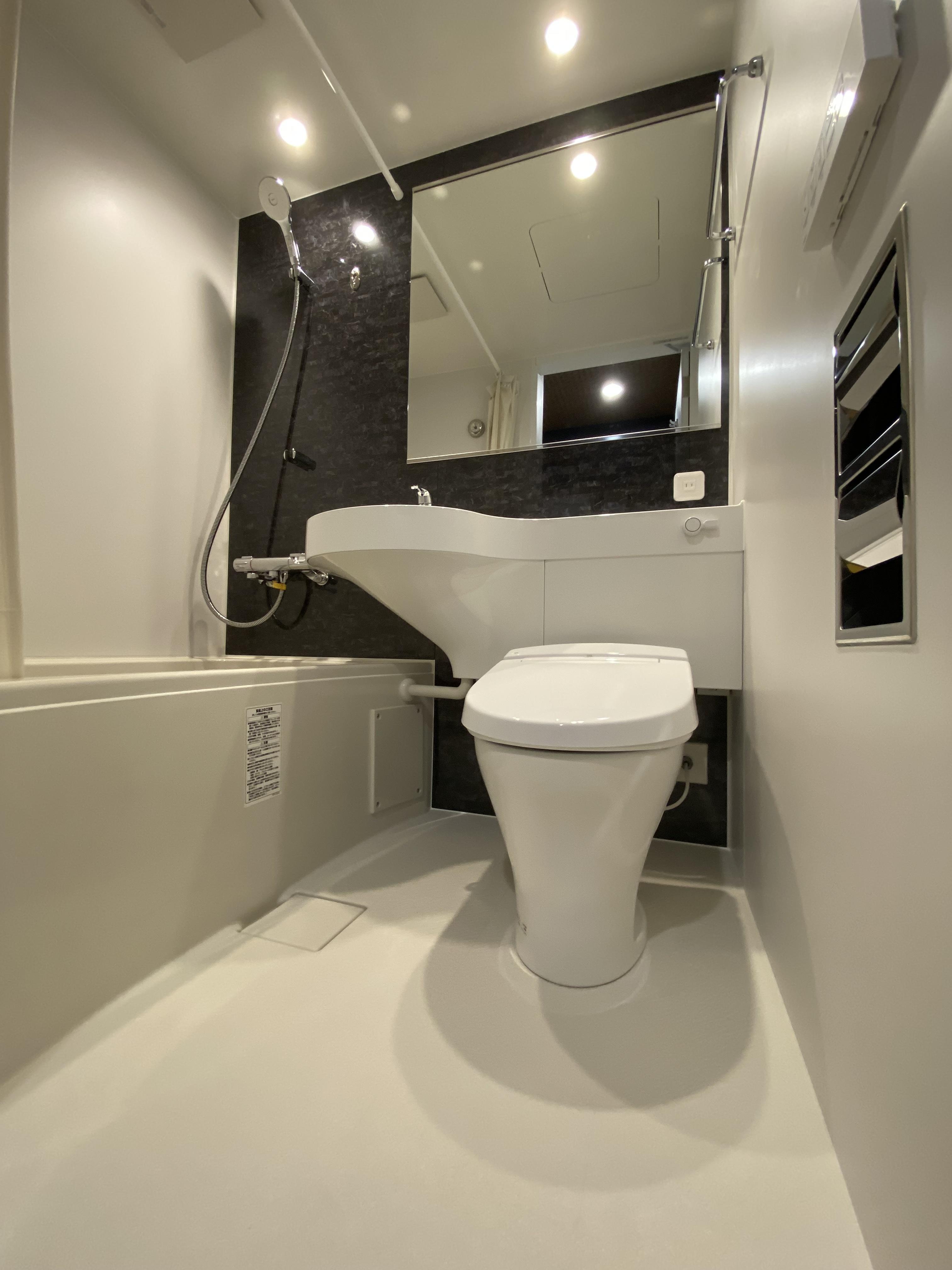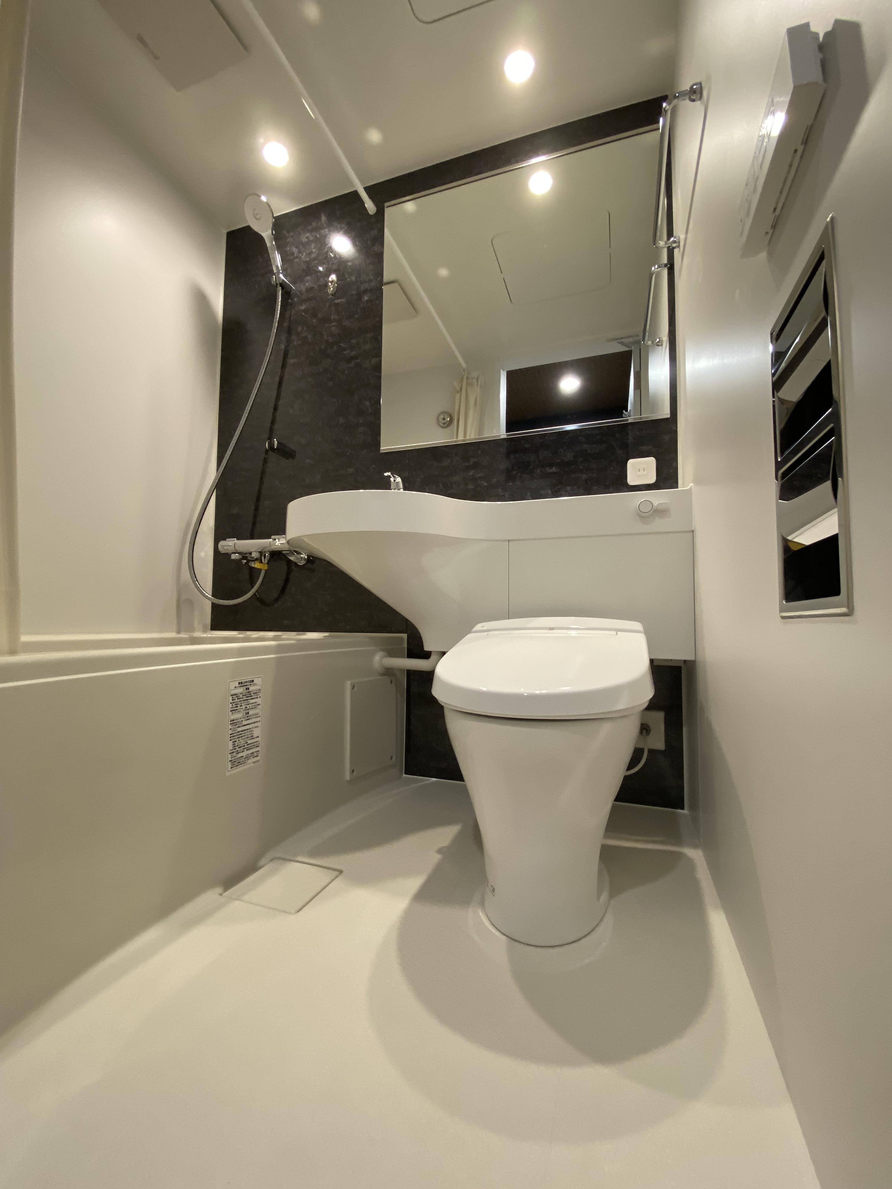 ツヤのあるアクセントパネルとスタイリッシュなトイレ。このユニットバスで部屋のクラス感をアップさせます。ワイドなミラーがゴージャス!