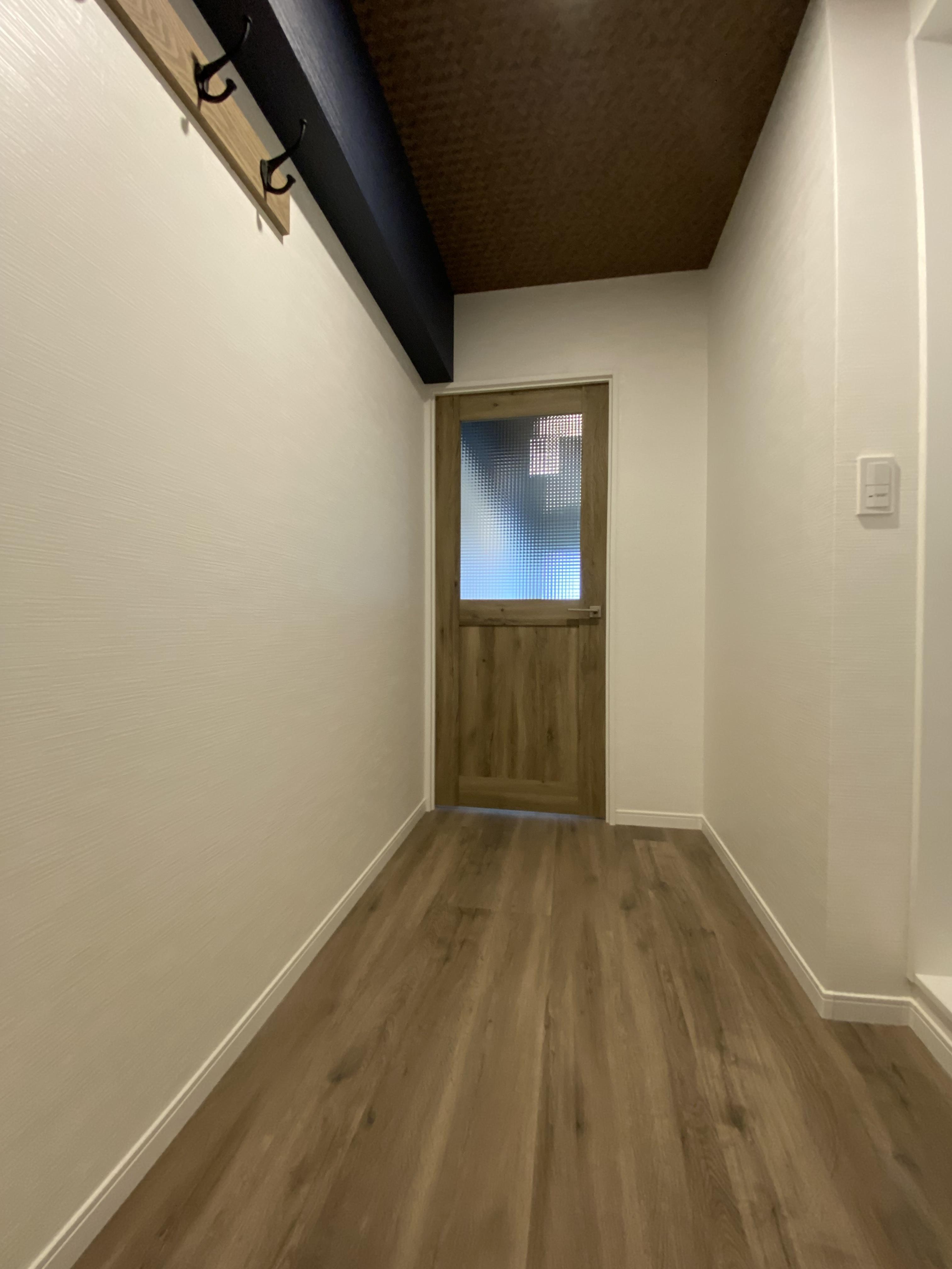 フローリング・クローゼット扉・ドアもリクシル・ラシッサ・ラフオークで統一。フローリングの足触りの良さとヴィンテージ風の雰囲気をさりげなく印象付けるデザイン。チェッカーガラスもお洒落。