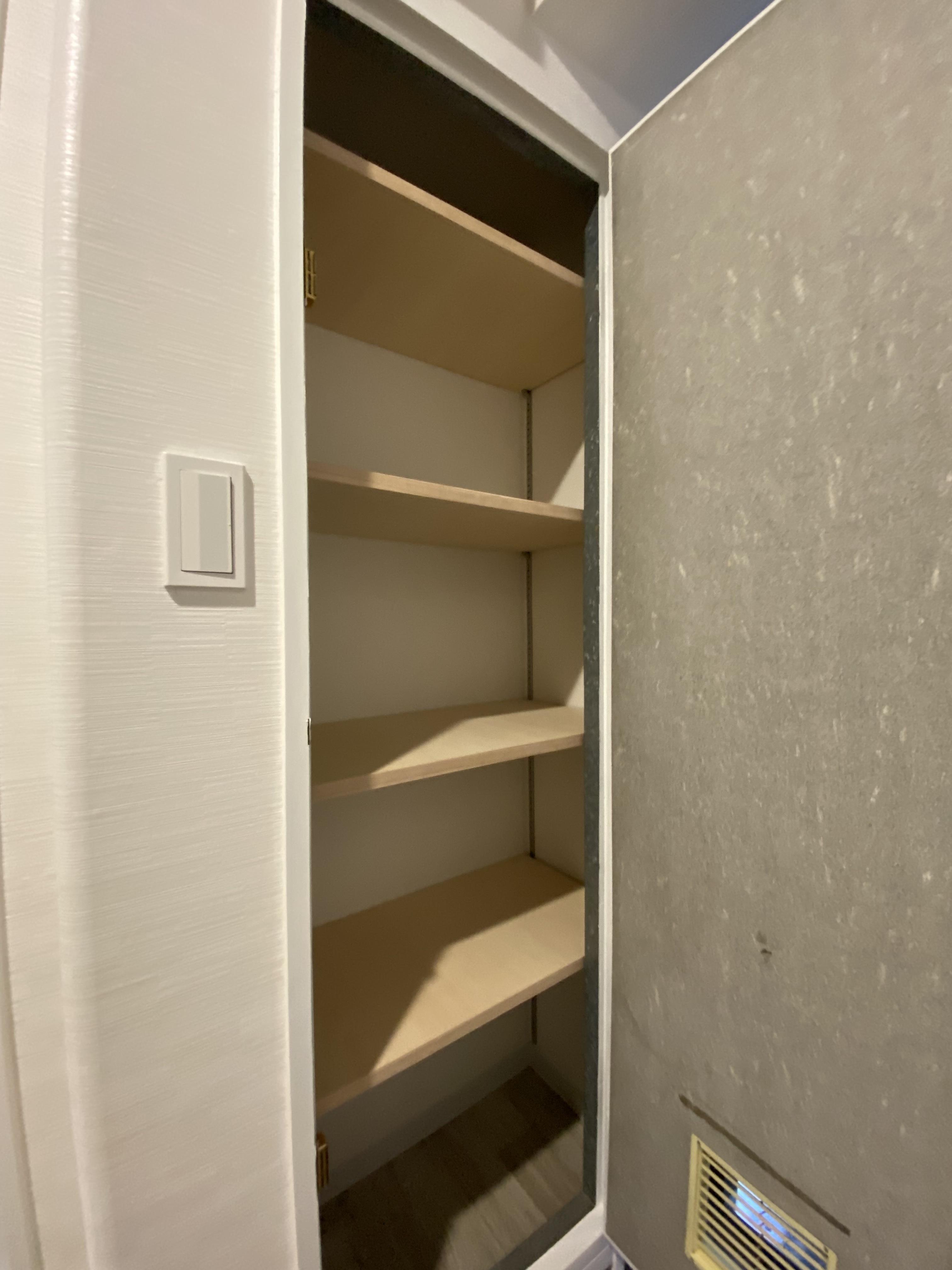 玄関を入ってすぐの機器置き場。機器を移動させ、そこに可動棚付き収納庫を作りました。