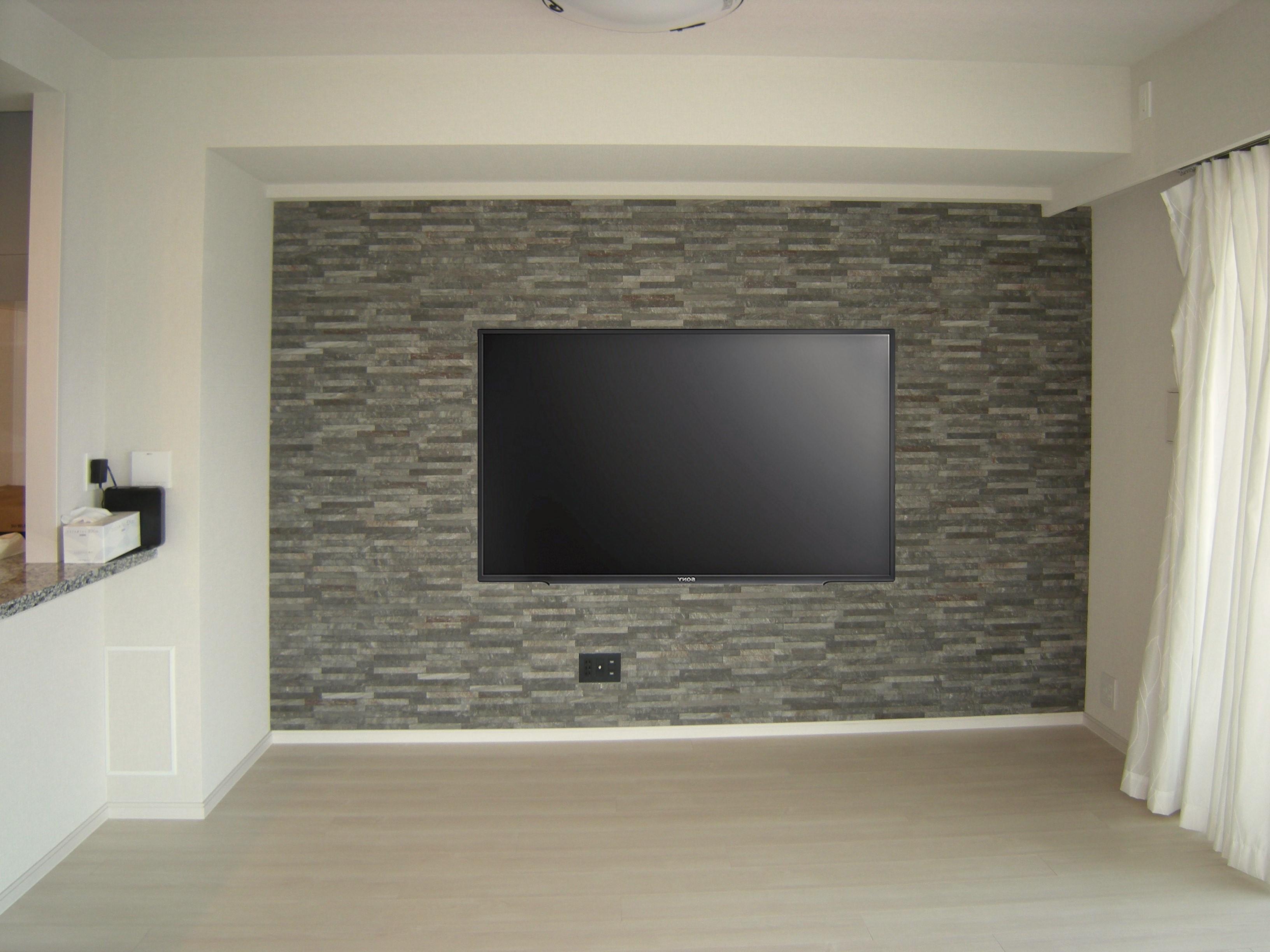 壁一面にエコカラット・ディ二タ。75インチの壁掛けテレビを設置。相性抜群でリビングのクオリテイーを高めてくれます。
