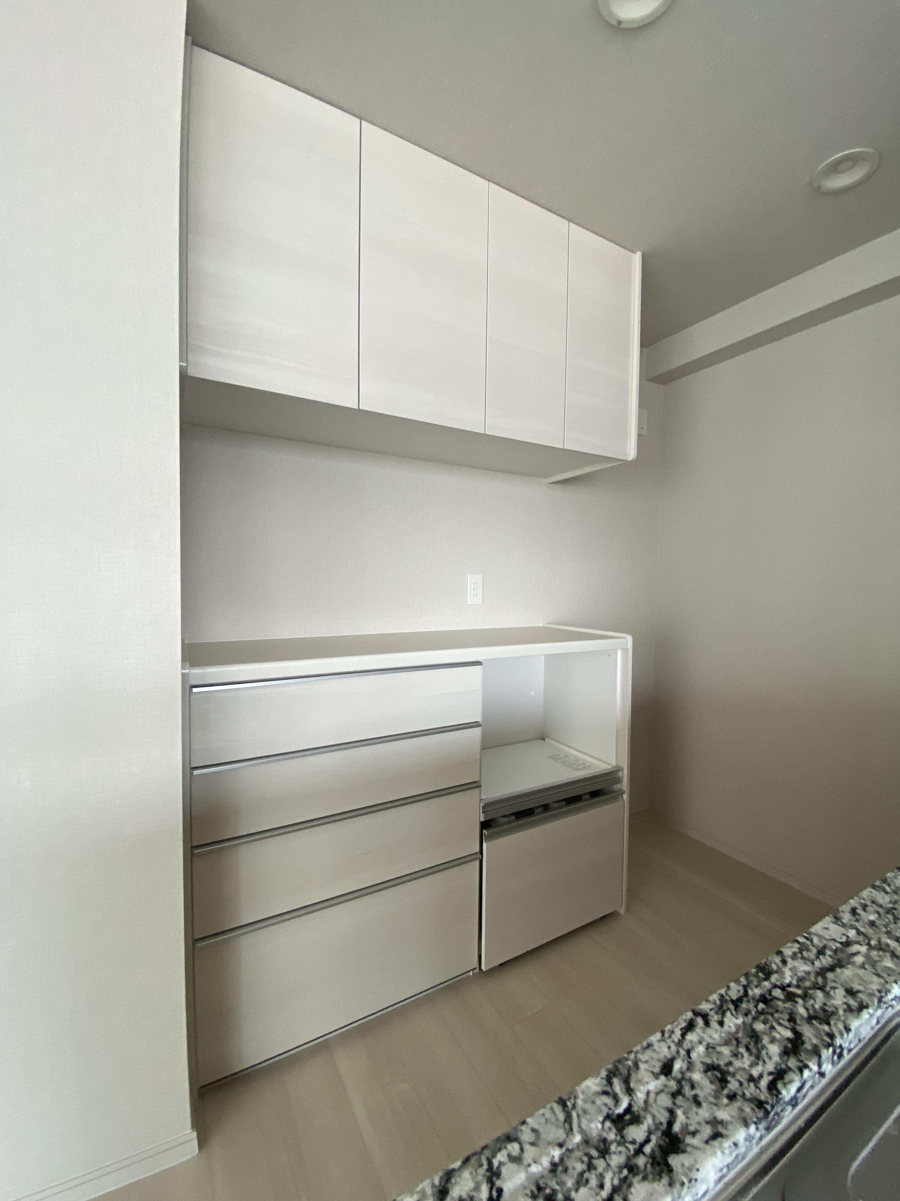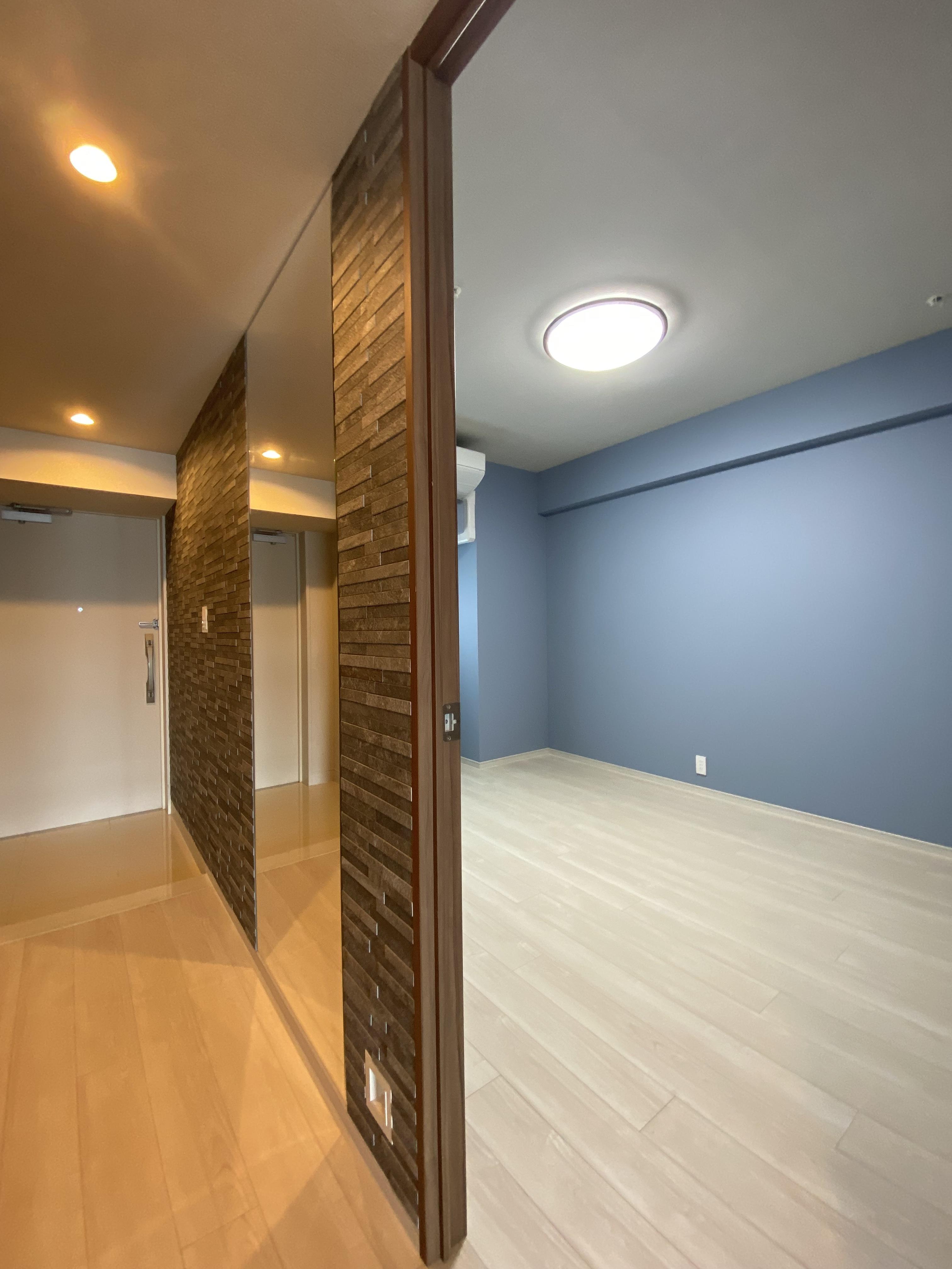 殺風景な白壁をスモーキーカラーのブルーに。やわらかな雰囲気をつくります。