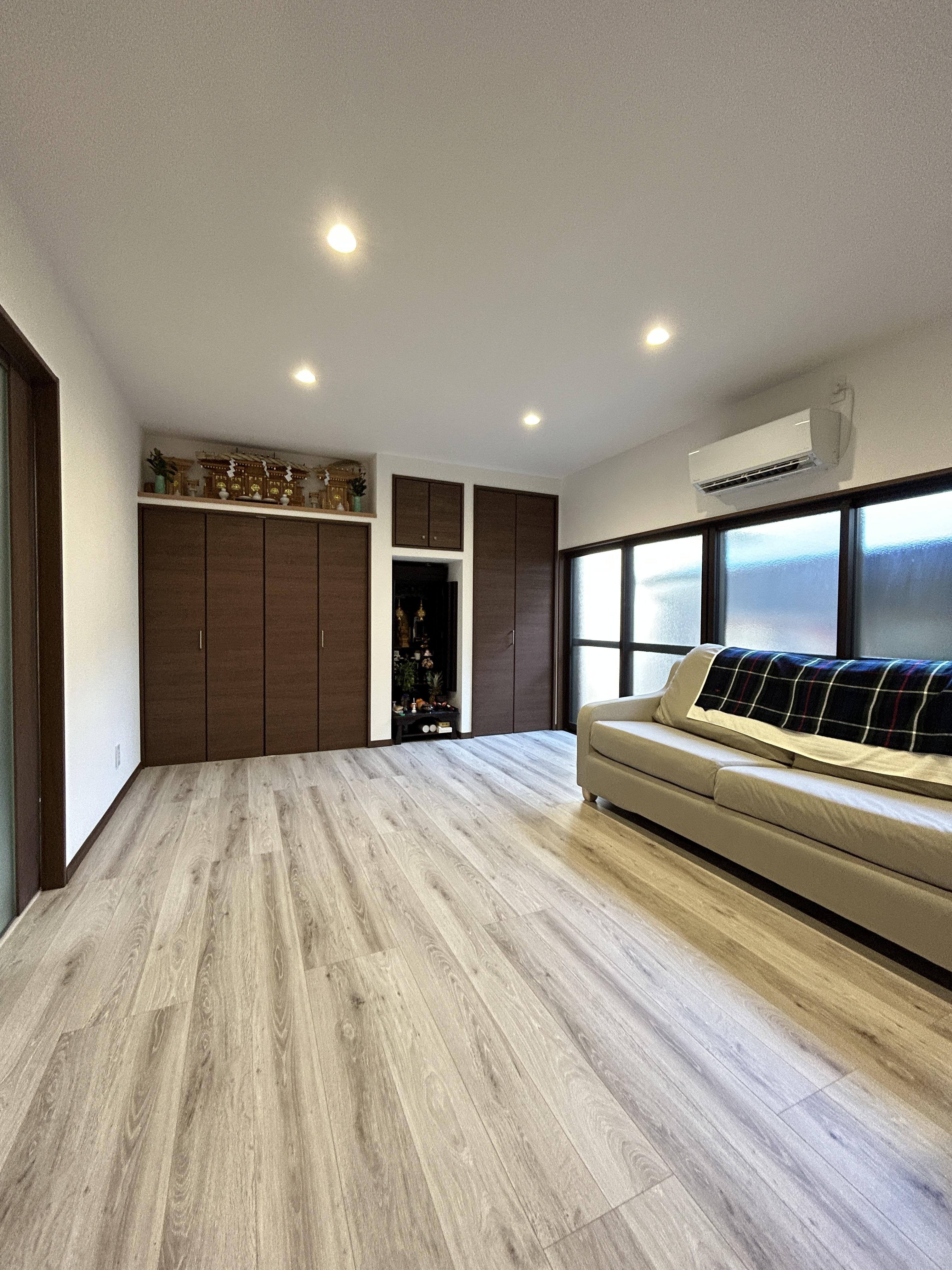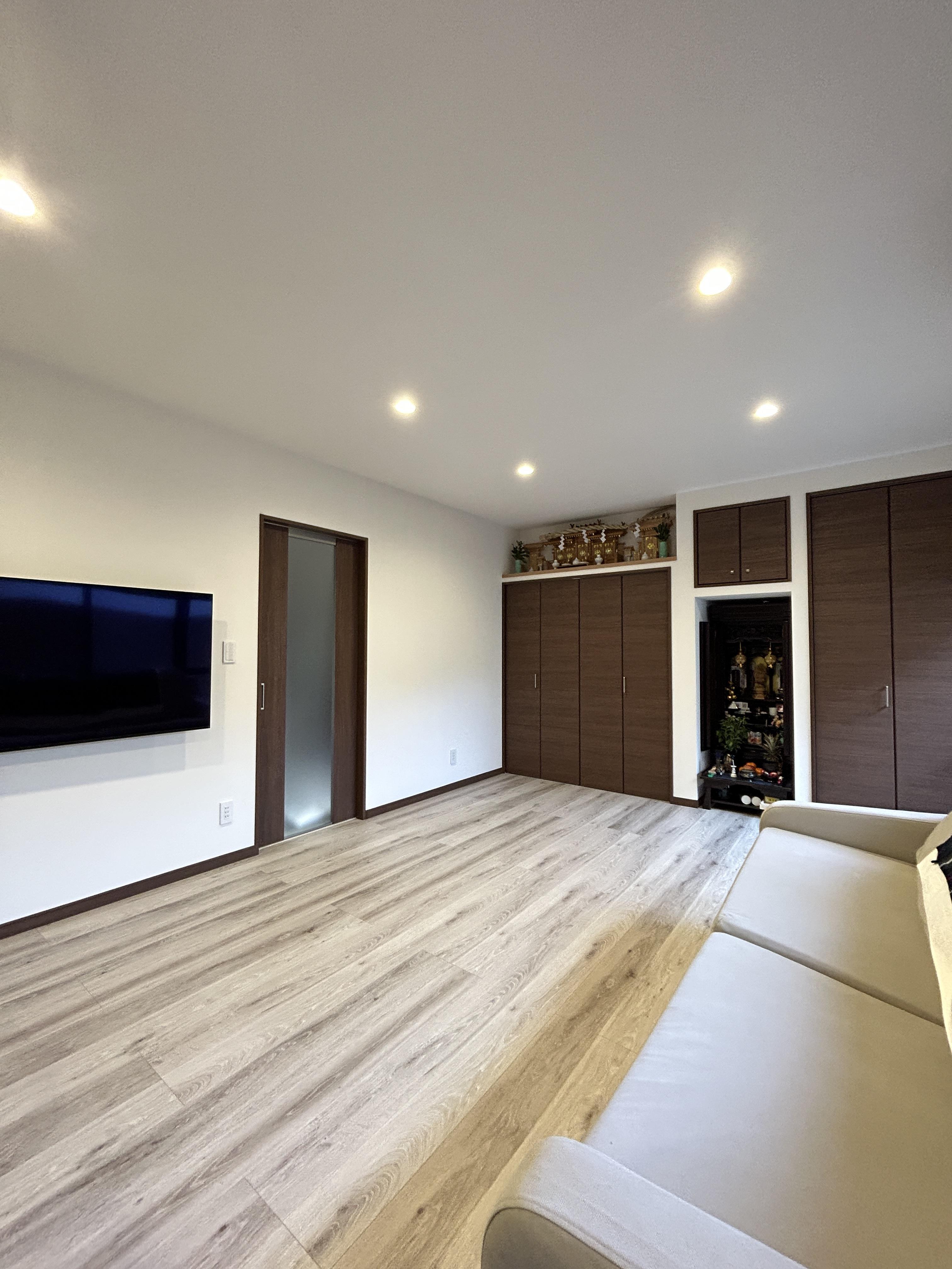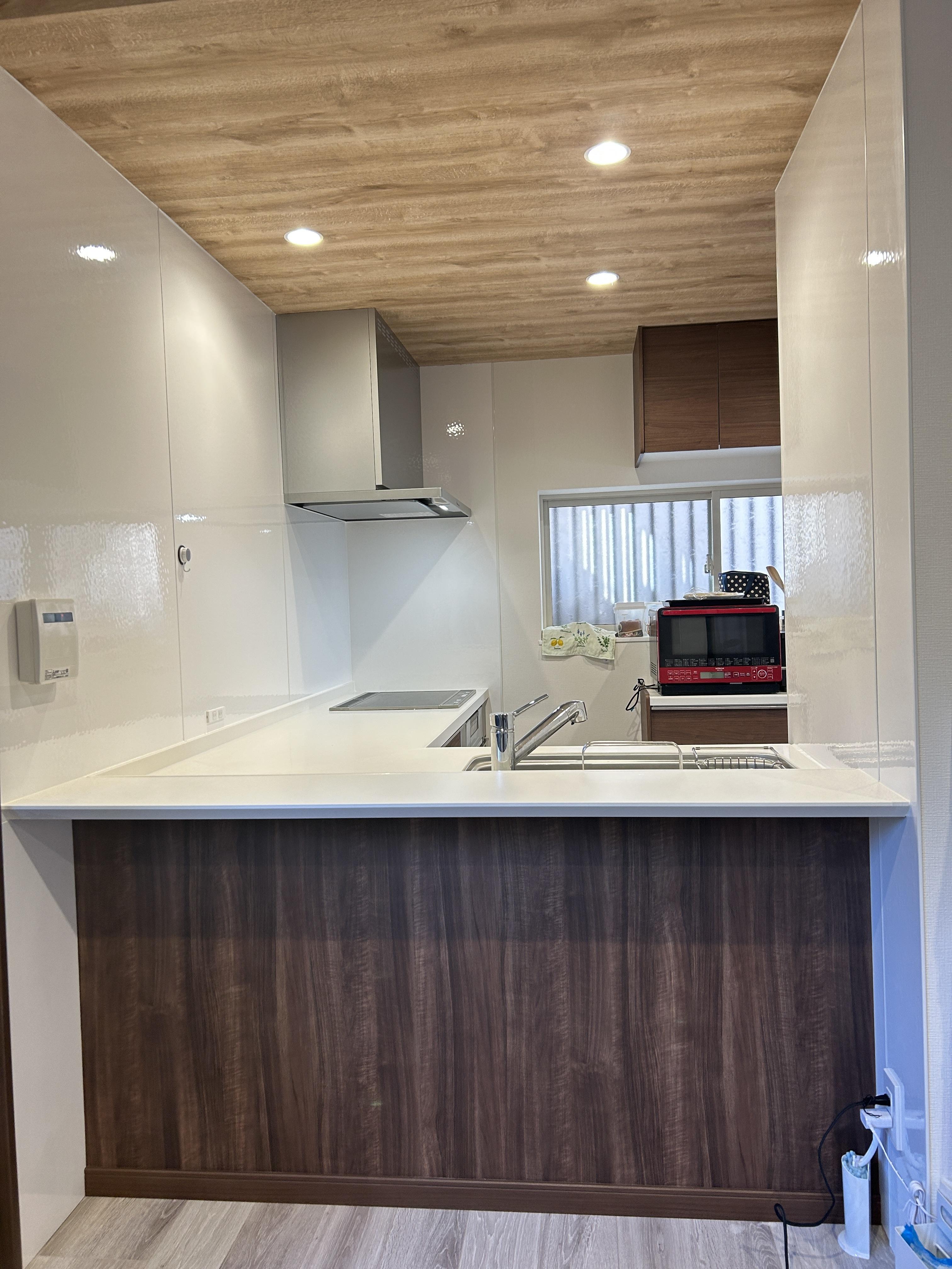 既存は壁付けのキッチンでした。狭い!暗い!収納力がない!がお悩みでした。そのお悩みにお応えします!隣の和室の押入れと壁を撤去してリクシルシステムキッチン・シエラをL字型に設置して対面化とスペースの確保が実現!キッチン内には家電収納棚をクリエモカで統一。清潔感のあるベーシックホワイトのワークトップの作業スペースも十分にあり、奥様のお料理好きを、さらに後押しします!壁紙のチョイスもオシャレ!
