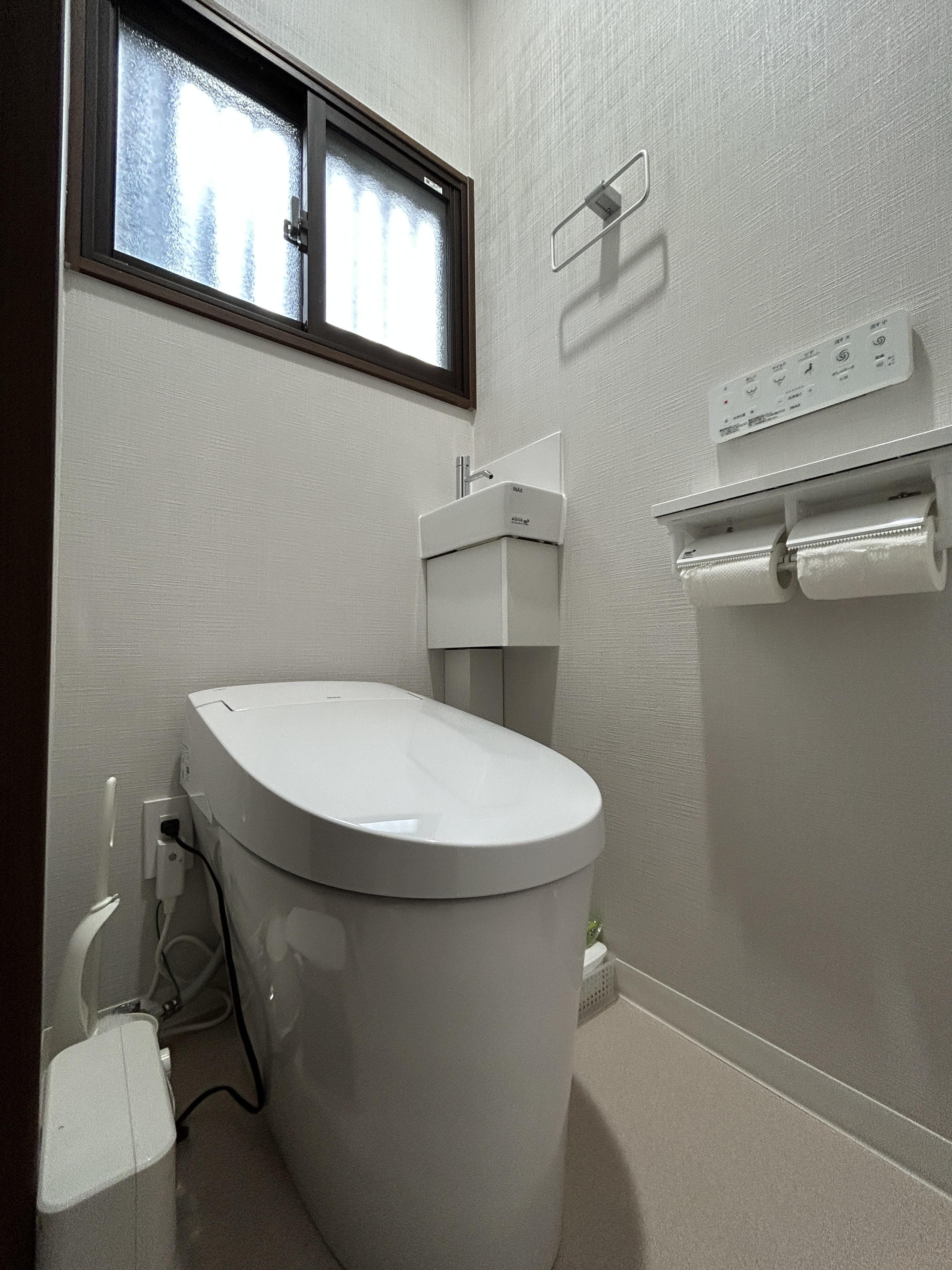 とても狭かったトイレもこの機会にリフォーム。リクシルタンクレスシャワートイレ・サティス。スタイリッシュなシルエットで広々!