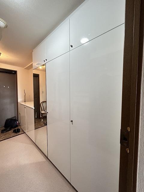 ご夫妻揃ってオシャレ!既存の下駄箱とクローゼットのカラー重く感じる・・・とのご相談。 そのお悩みにお応えします。リアテックの光沢のあるホワイトを貼りました。光沢のあるホワイトを チョイスされまるで別のお部屋になったようです!オシャレでゴージャス!