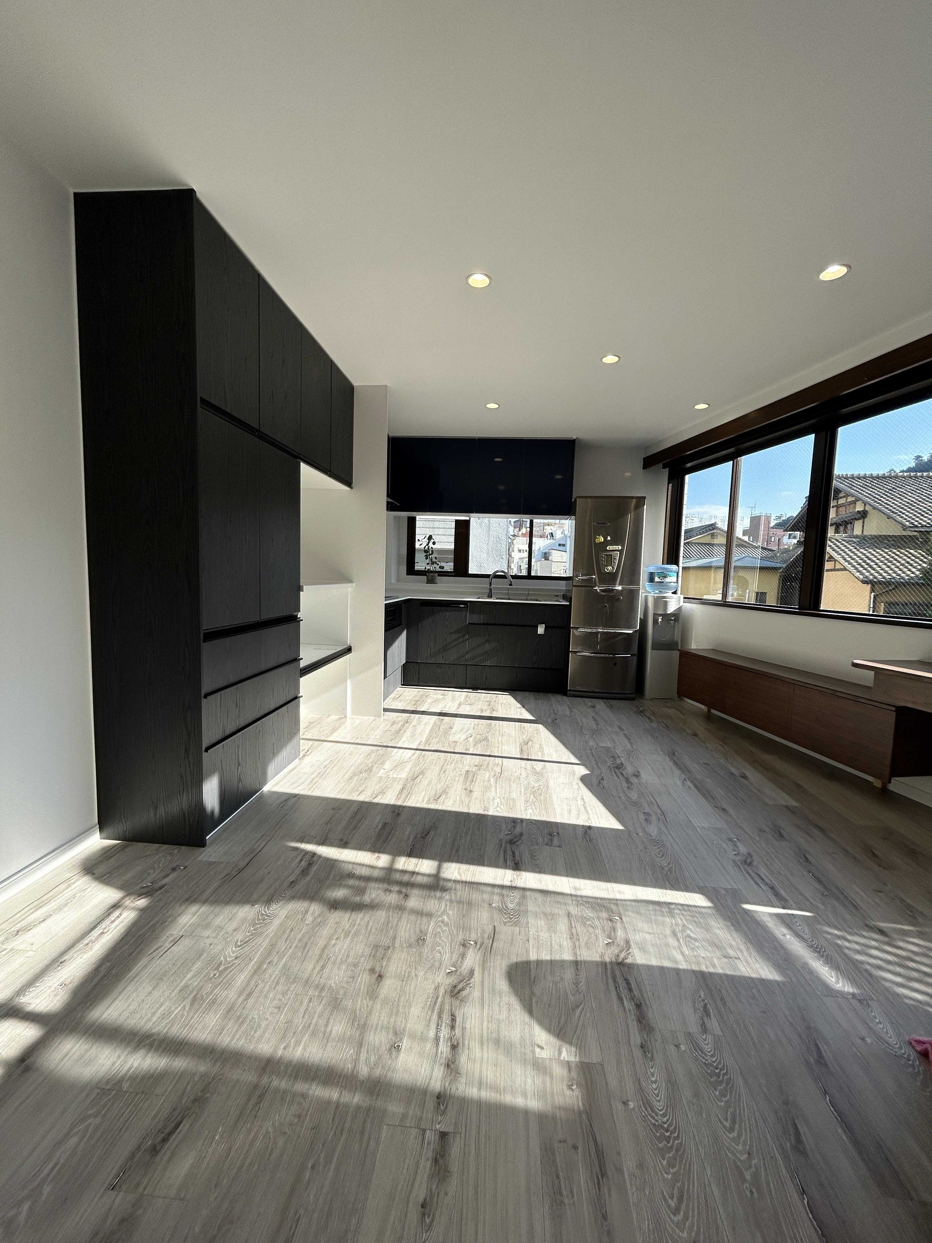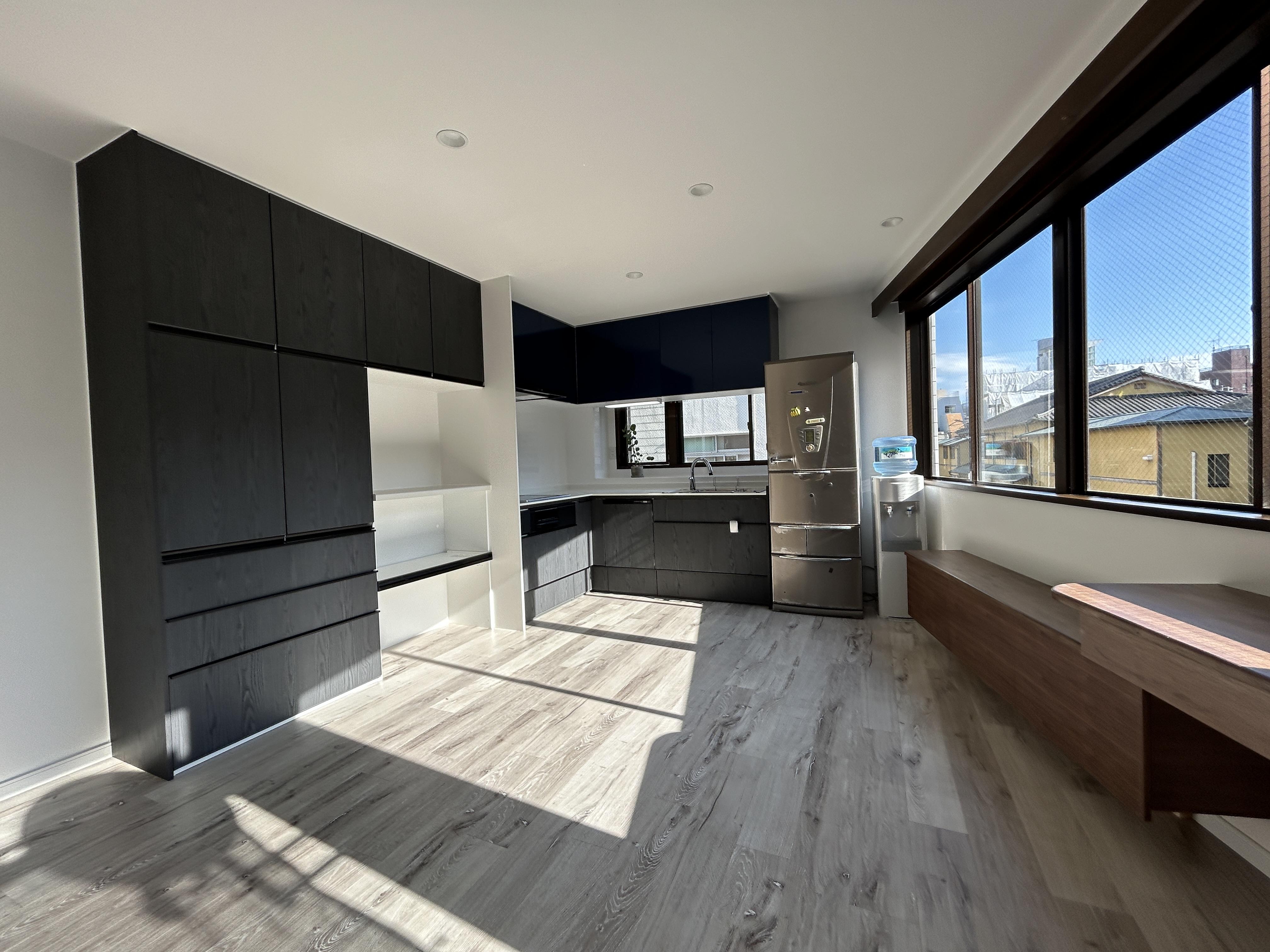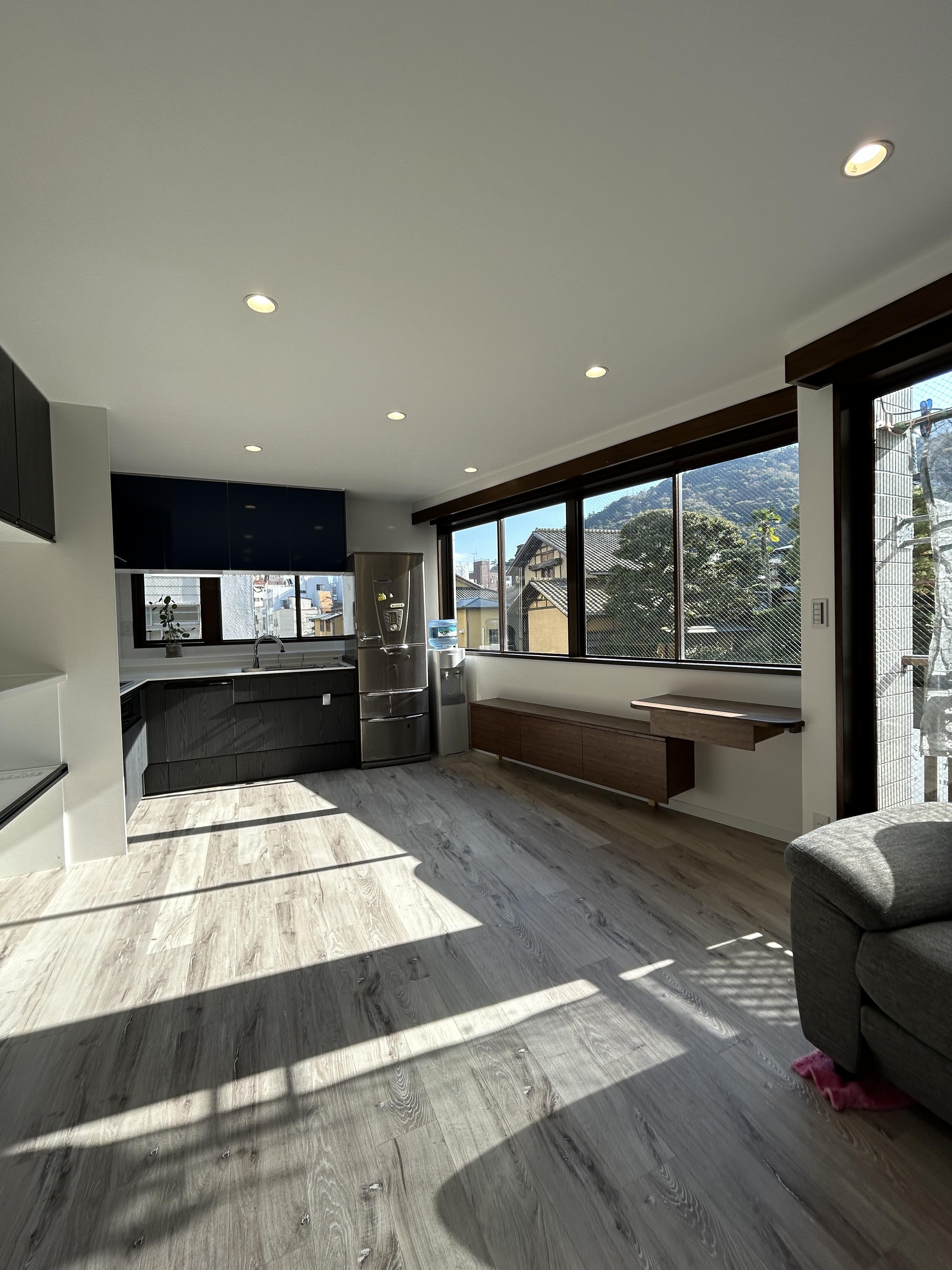 床材のホワイトオーク柄が日差しいっぱいのリビングをより明るく軽やかに演出します。