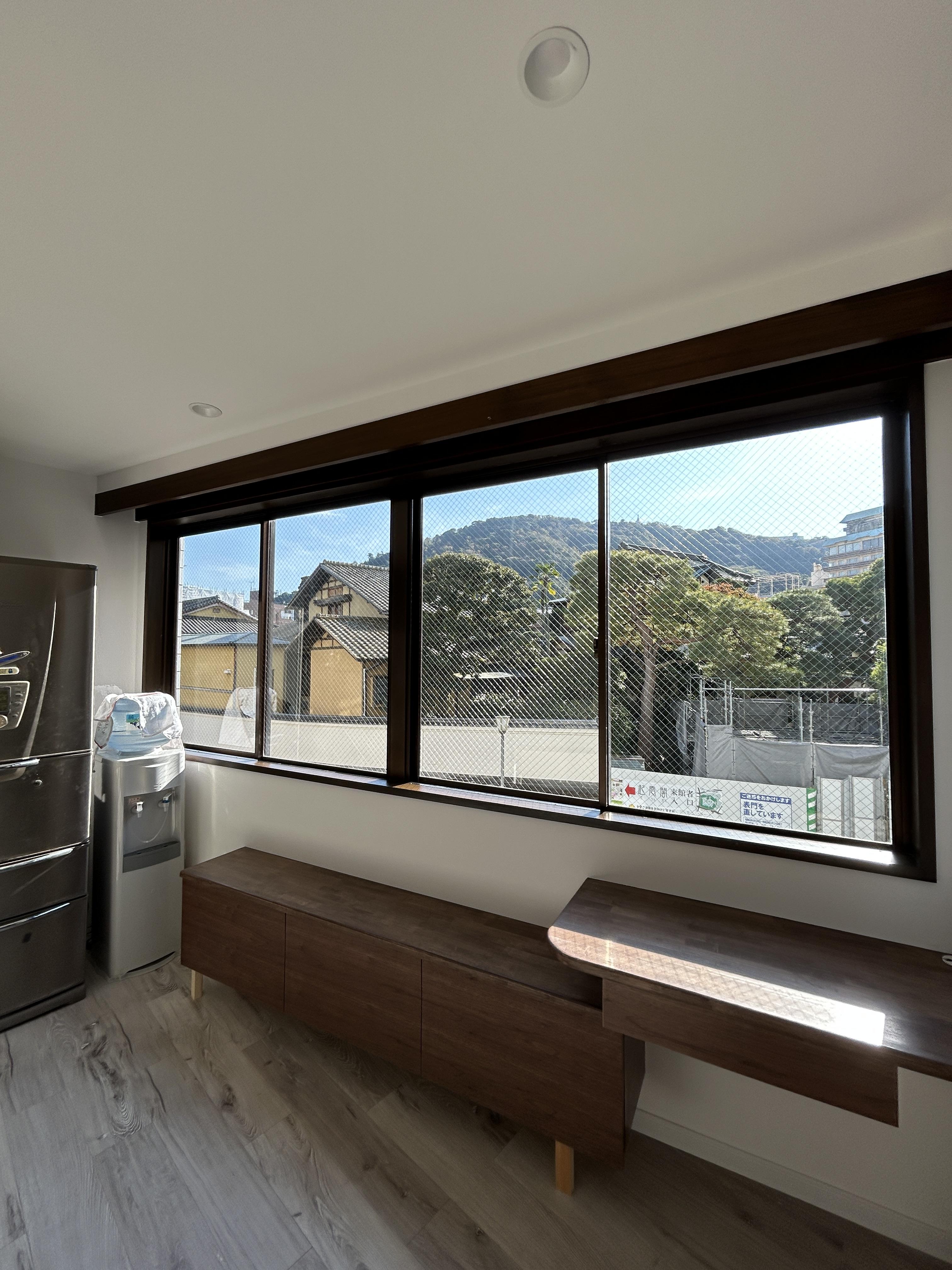 ちょっとした作業ができるように、壁付けの引き出し付の机と収納と腰かけが併用できる家具を造作しました。