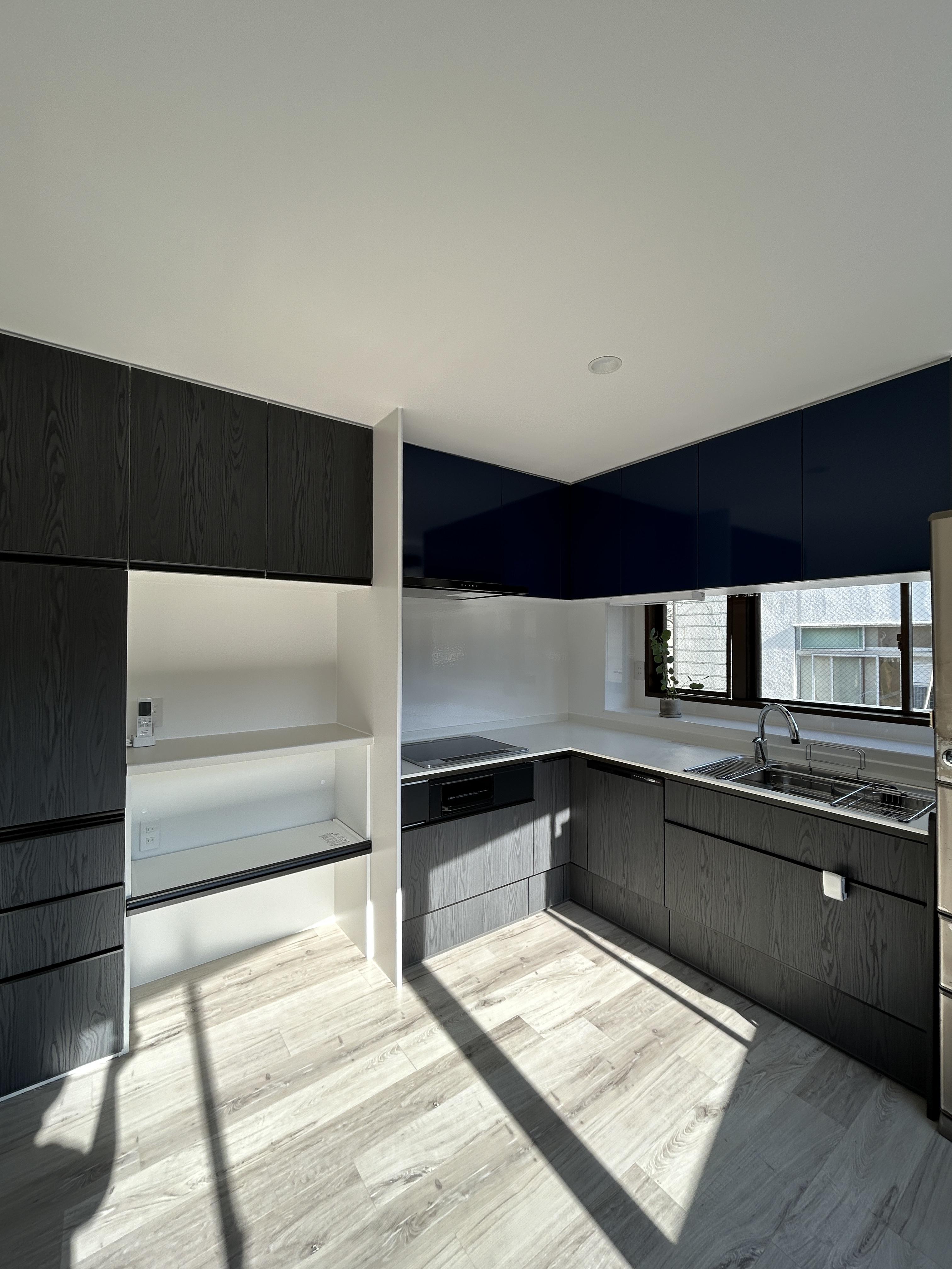 リクシル・システムキッチン・ノクト。質感違いの扉面材を組み合わせたキッチンは何気ない空間をワクワクするようなインテリアのひとつになりました。吊り戸は華やかな色彩をグレイッシュに仕上げたトレンドカラー・クラシックブルー。漆喰をイメージにマットなシンクと食器家電収納に。相性抜群です。ダブルサポートシンク・お掃除しやすい換気扇・ビルトイン食洗機・・・とお料理が大好きな奥様をサポートする強い味方です!