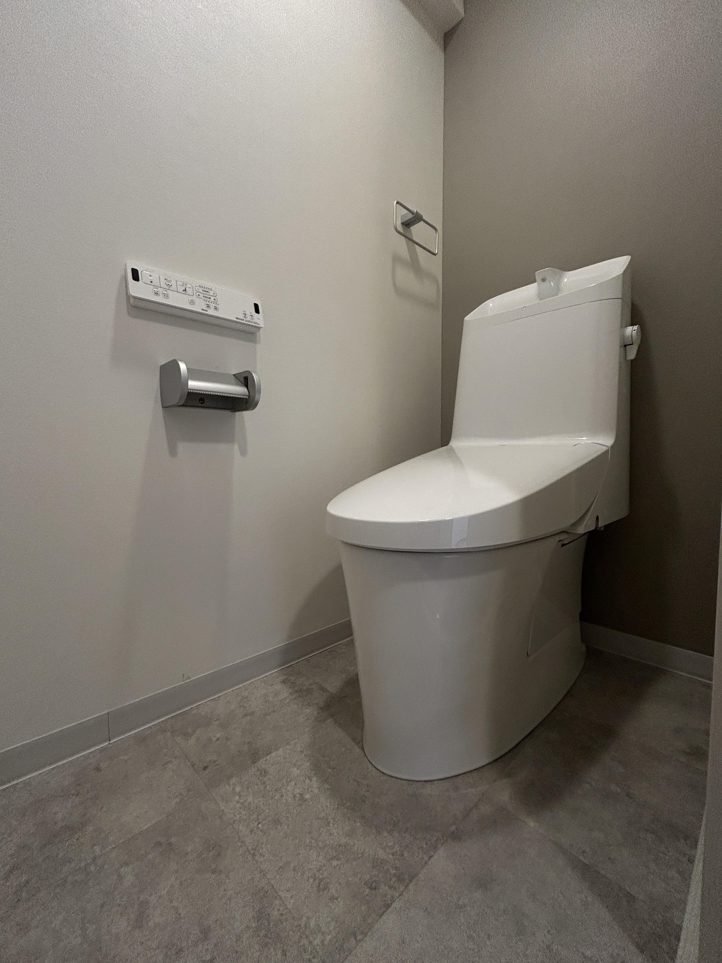 リクシルシャワートイレ・清潔感のある白と壁と床にはモダンなグレー系のアクセントをチョイス!オシャレ!