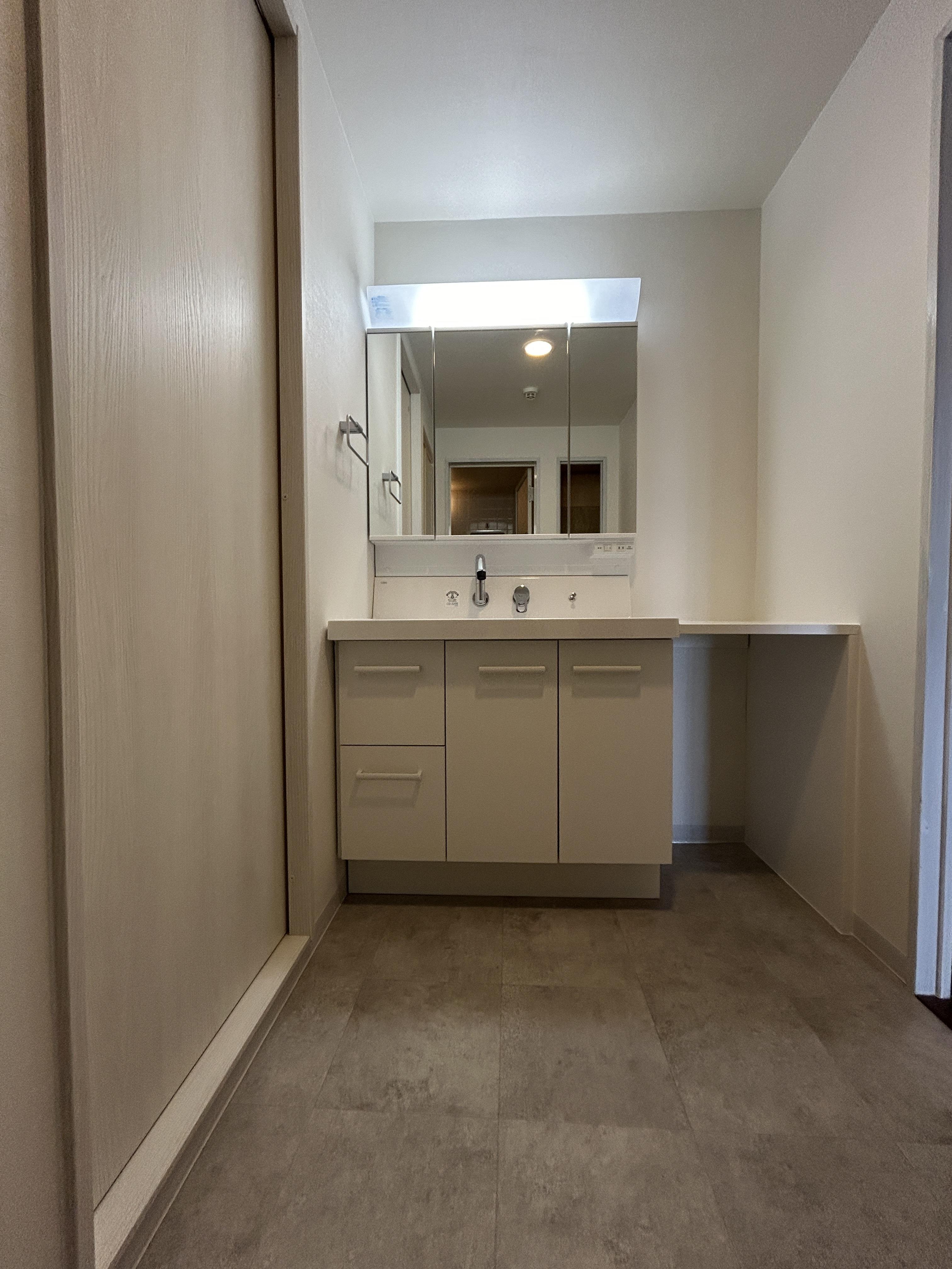 使い勝手の良い、リクシル洗面化粧台・ピアラ。洗濯物を畳んだりできるランドリーカウンターも設置!