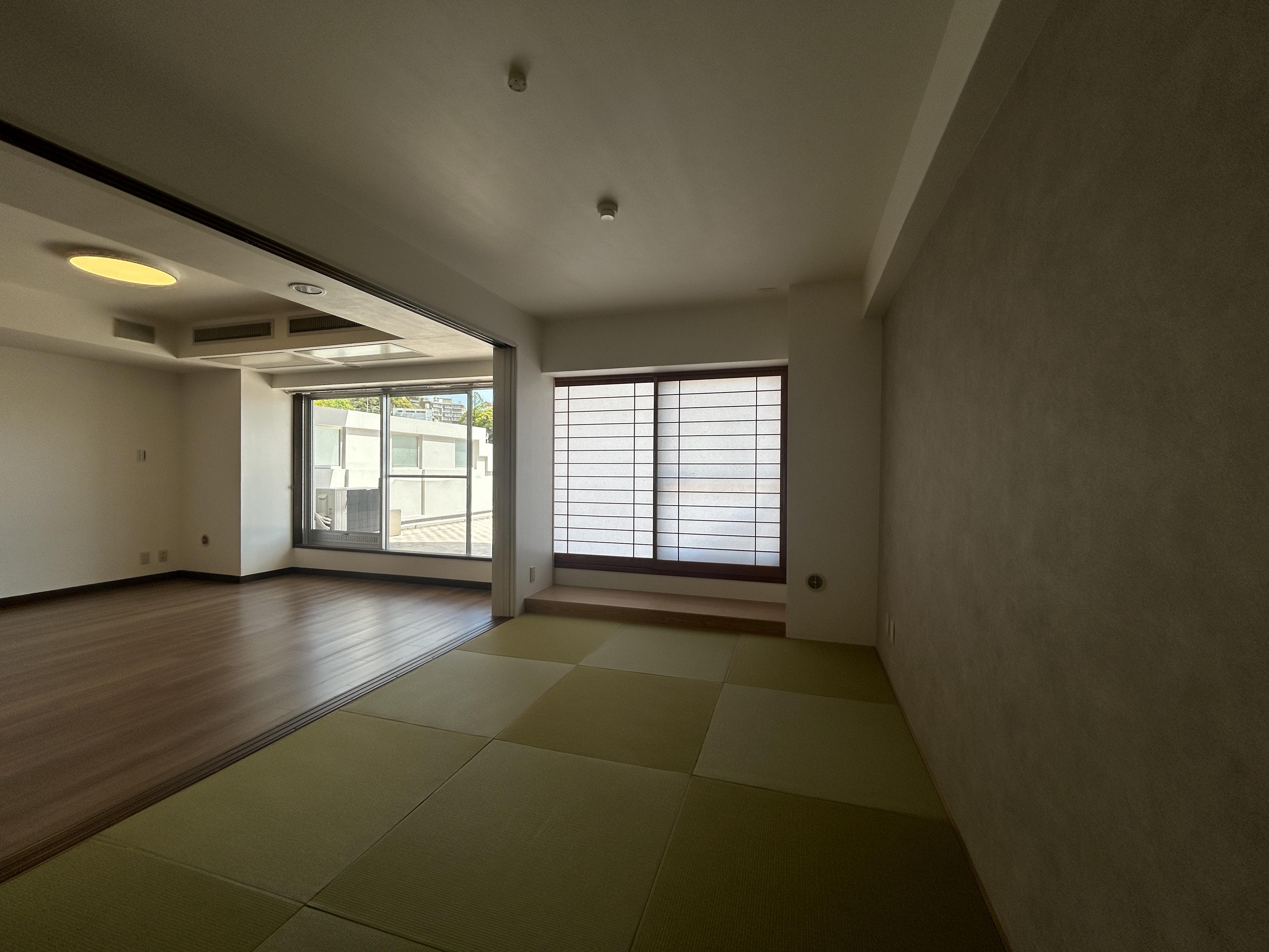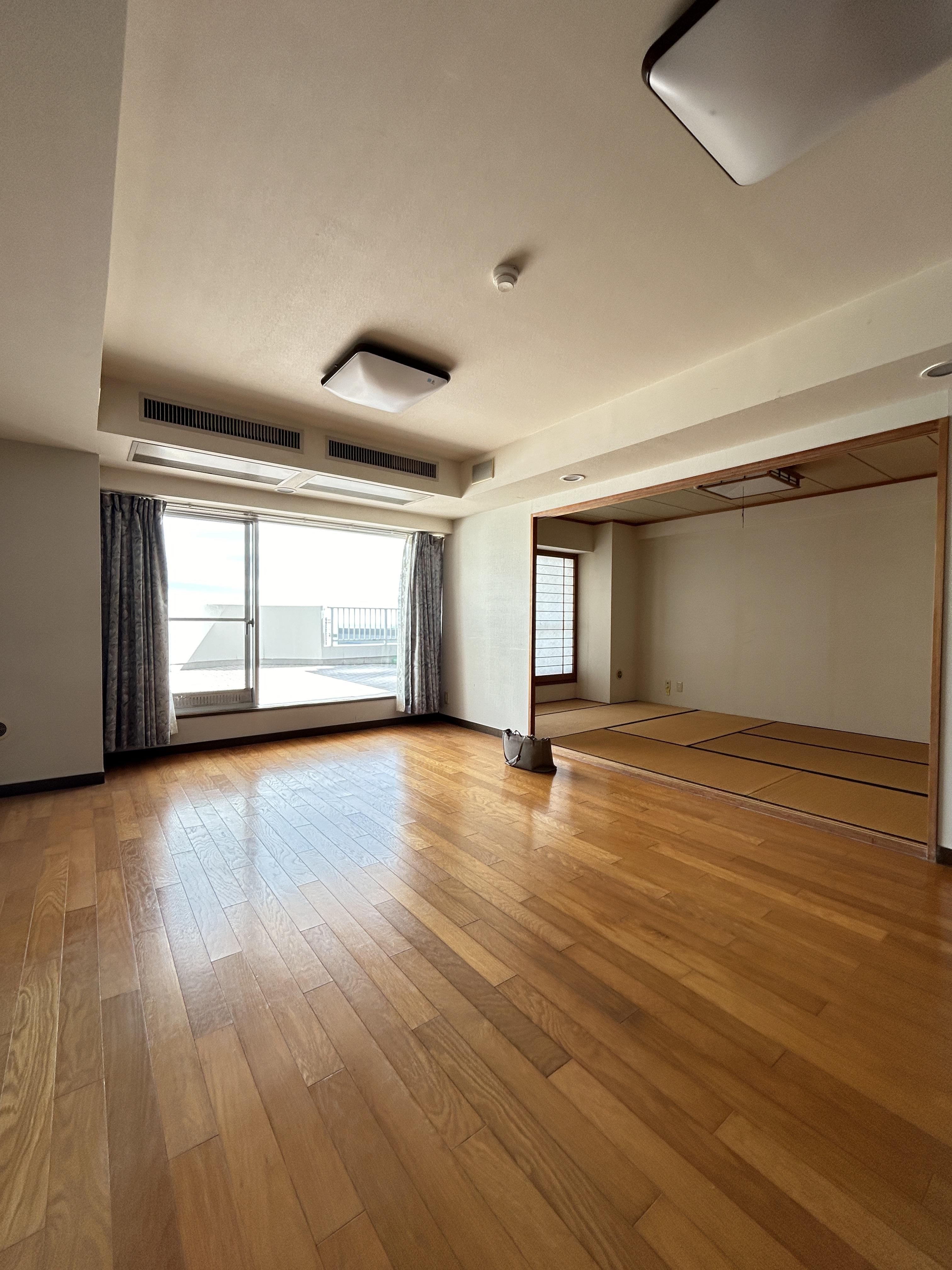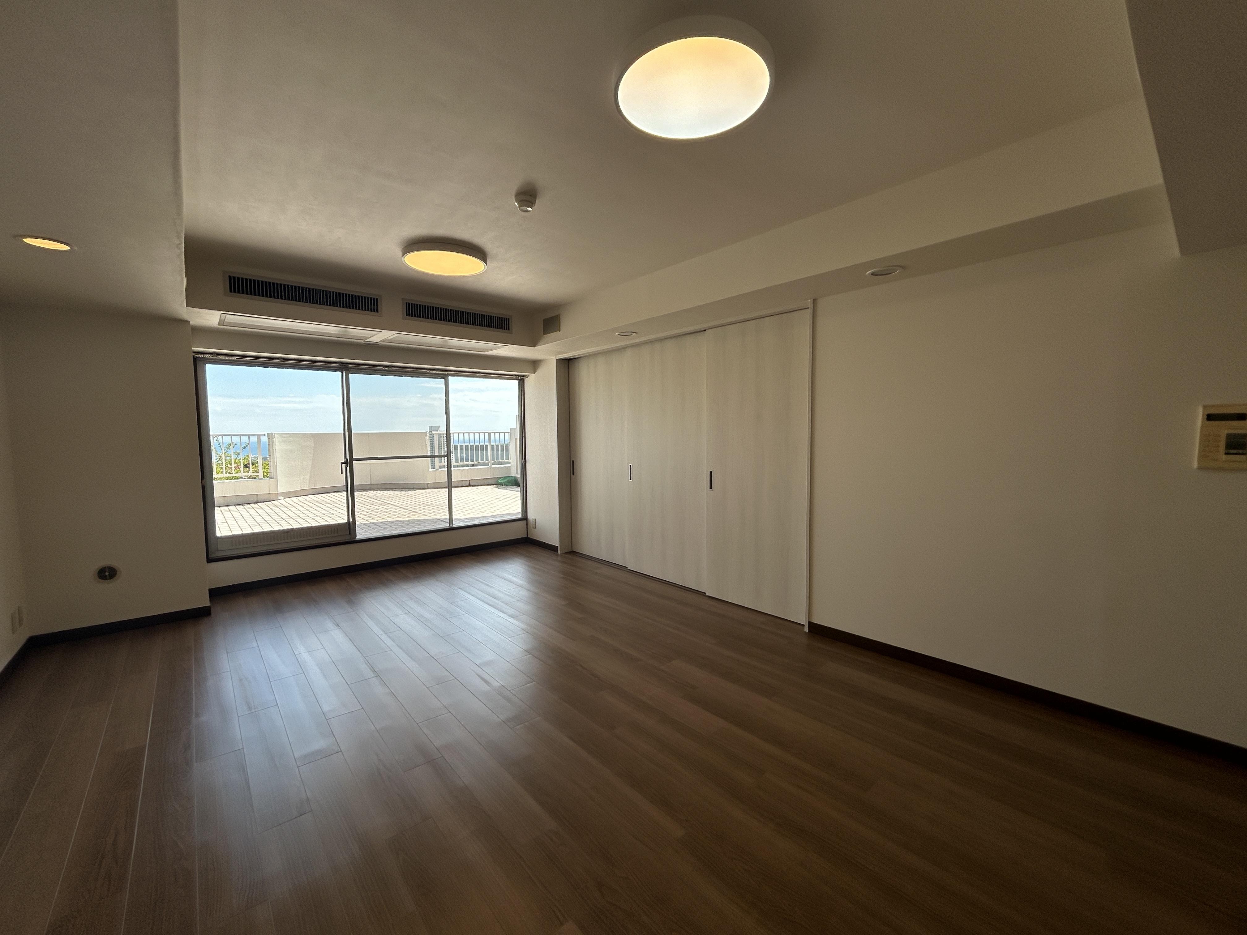 ウォ―ルナットのフローリングがモダンで落ち着いた雰囲気に。熱海を一望するバルコニーはちょっとしたお部屋の広さがあり、開放感・眺望抜群! 間仕切りの建具を閉めればゲストがいらしてもプライシーも確保できます!