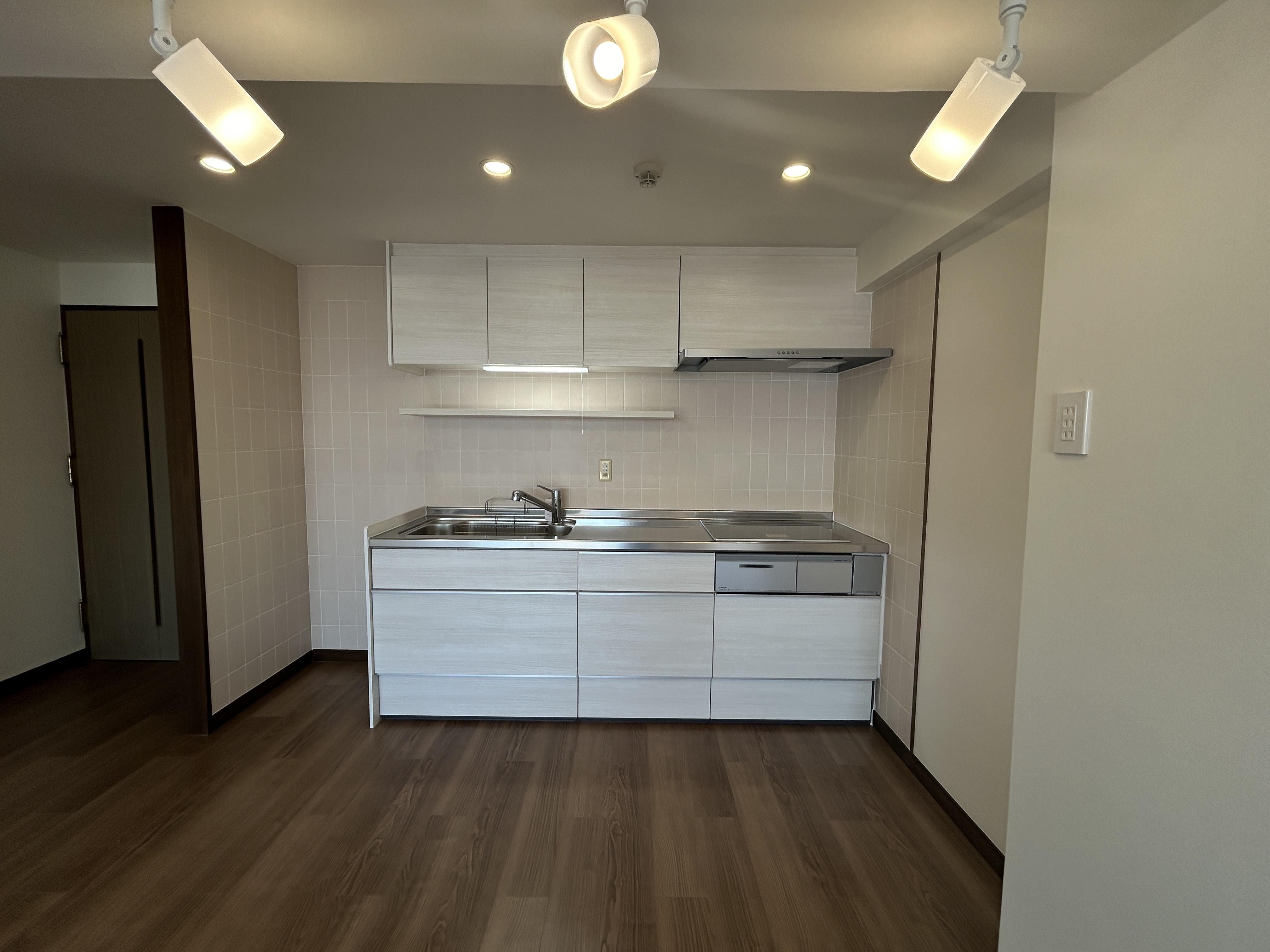 リクシルシステムキッチン・シエラ 扉カラーをクリエアイボリーにして明るく、スタイリッシュな演出のキッチンに生まれ変わりました。また、キッチンスペースを狭くしていたカウンターを撤去して開放的に!充実した照明によってインテリアの選択が広がりました!