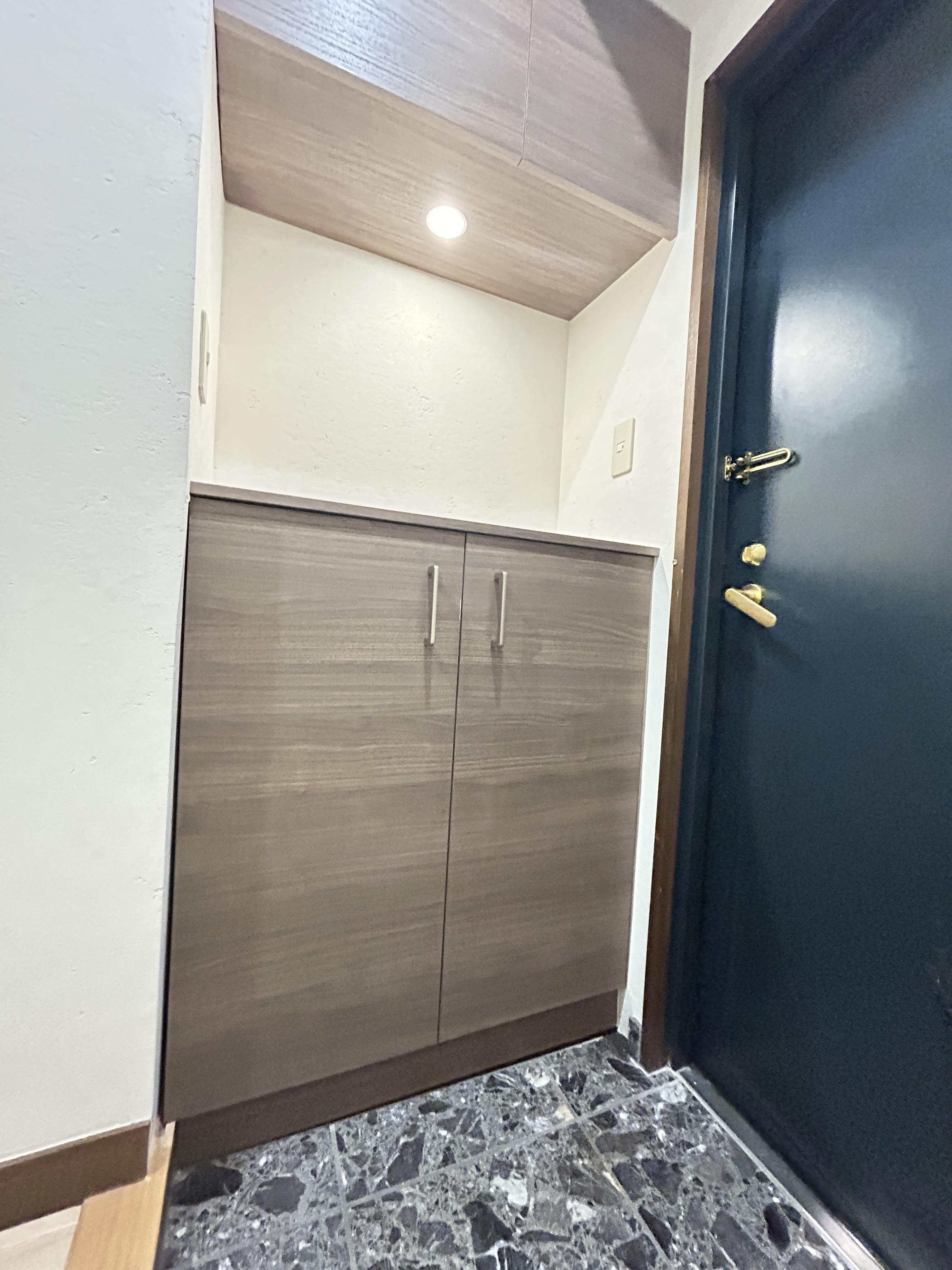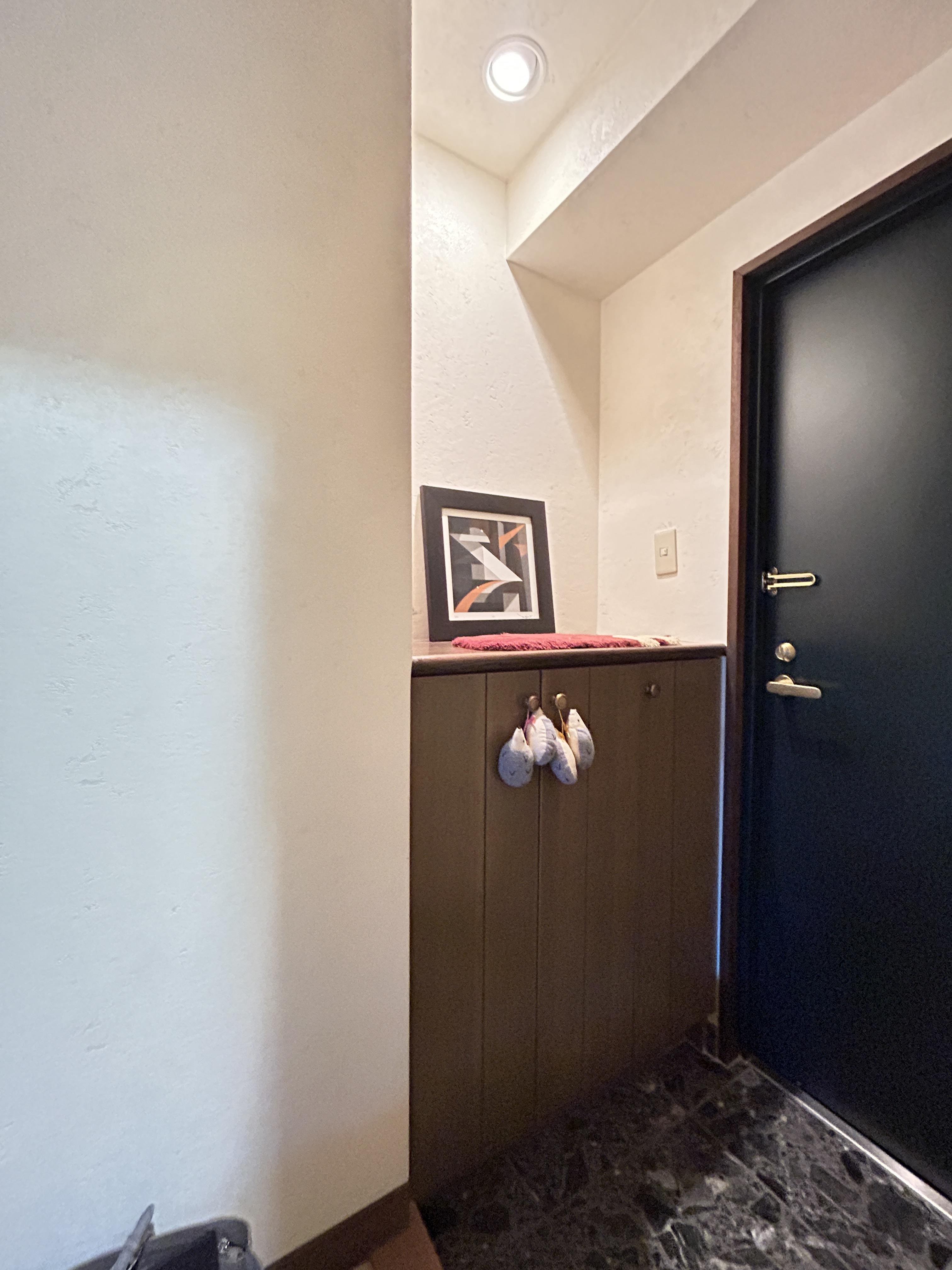 下駄箱の上部に収納棚を造作。LDKのフォローリングと同じウォールナットカラー。 意外ですが、ドアを開けて一番最初に「キレイ!ステキ!」の印象になるスペースです!!