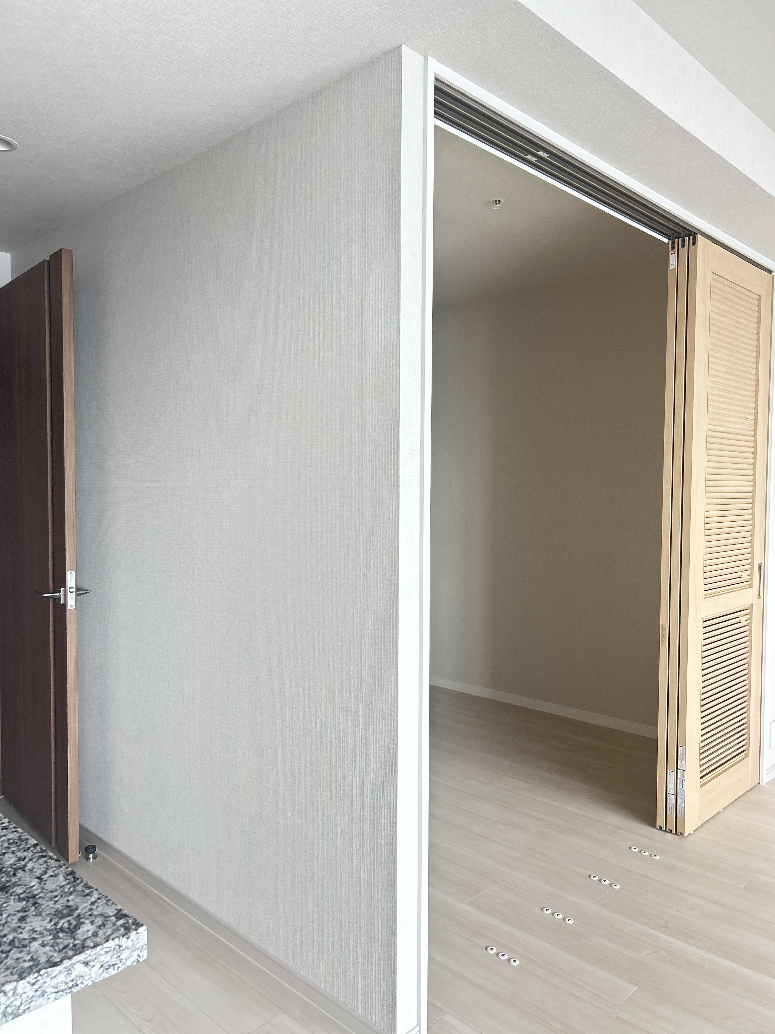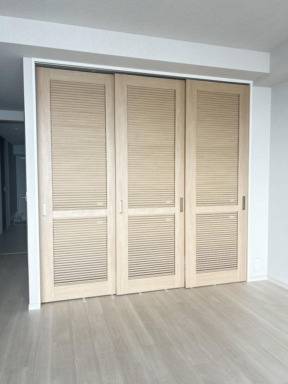 リクシル建材・ラシッサ・通風タイプをご提案。ルーバーで通風量と視線をコントロールすることができ、エアコンの効率もアップ!そのために開口部だった壁を造作して通風タイプの3枚引戸を設置!同時にドア・クローゼットドアもお取替え。明るいカラーのクリエペールで圧迫感も解消されて心地良い空間になりました。