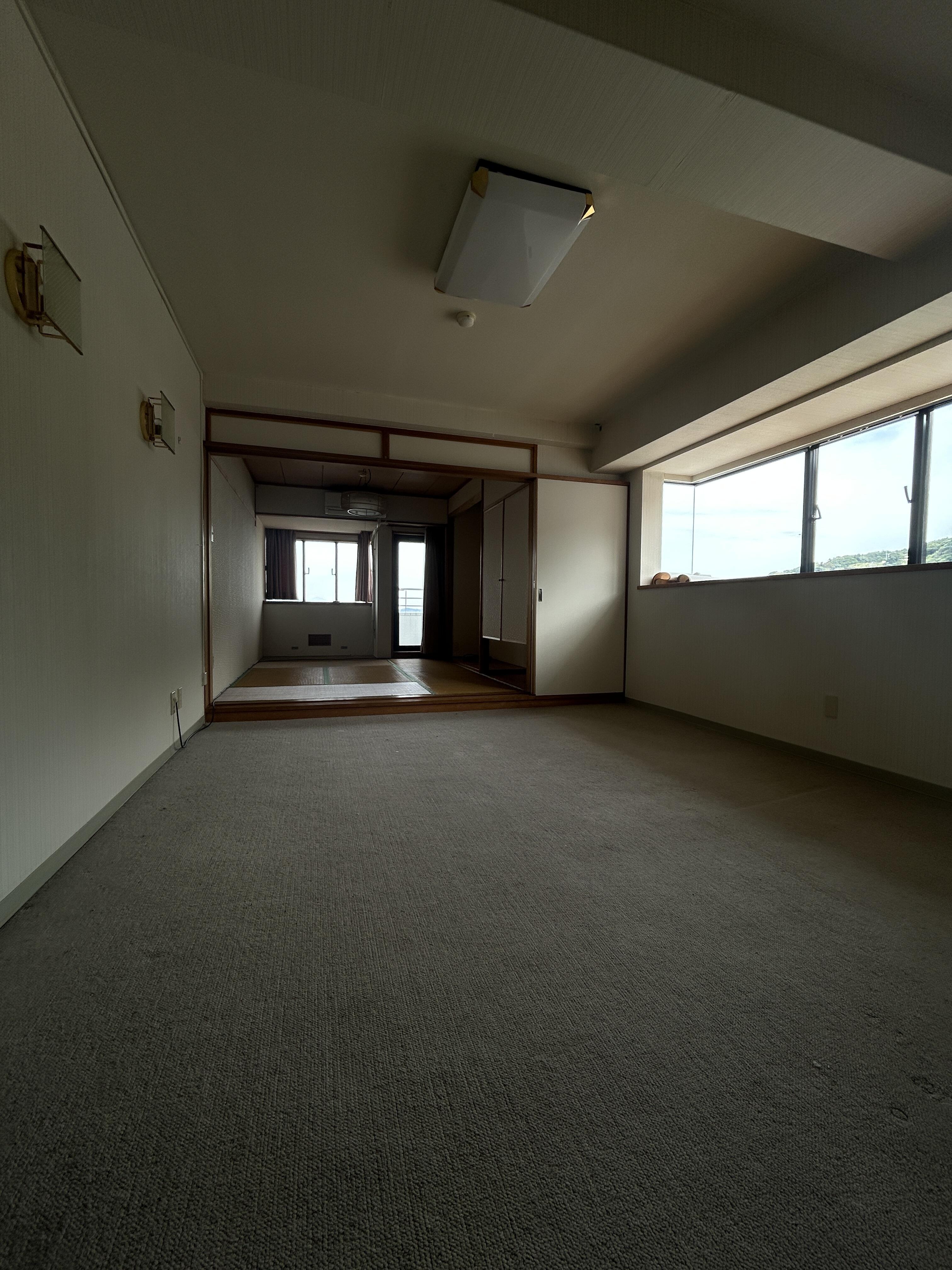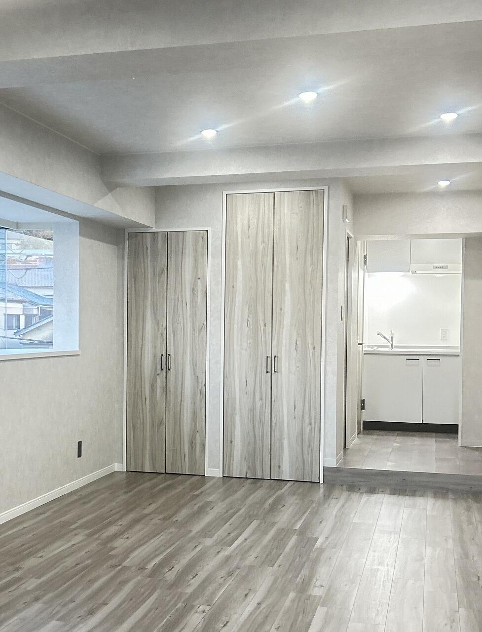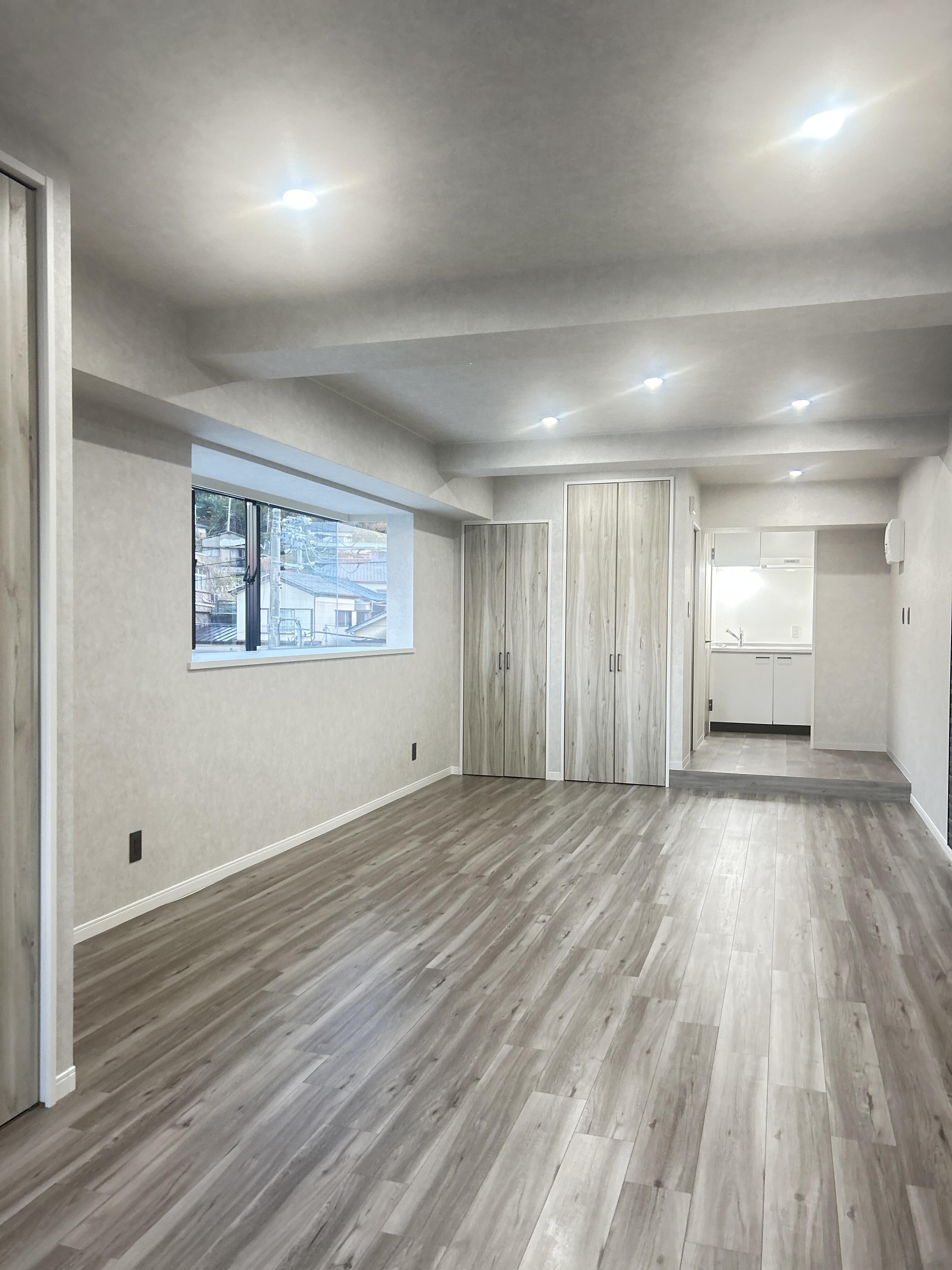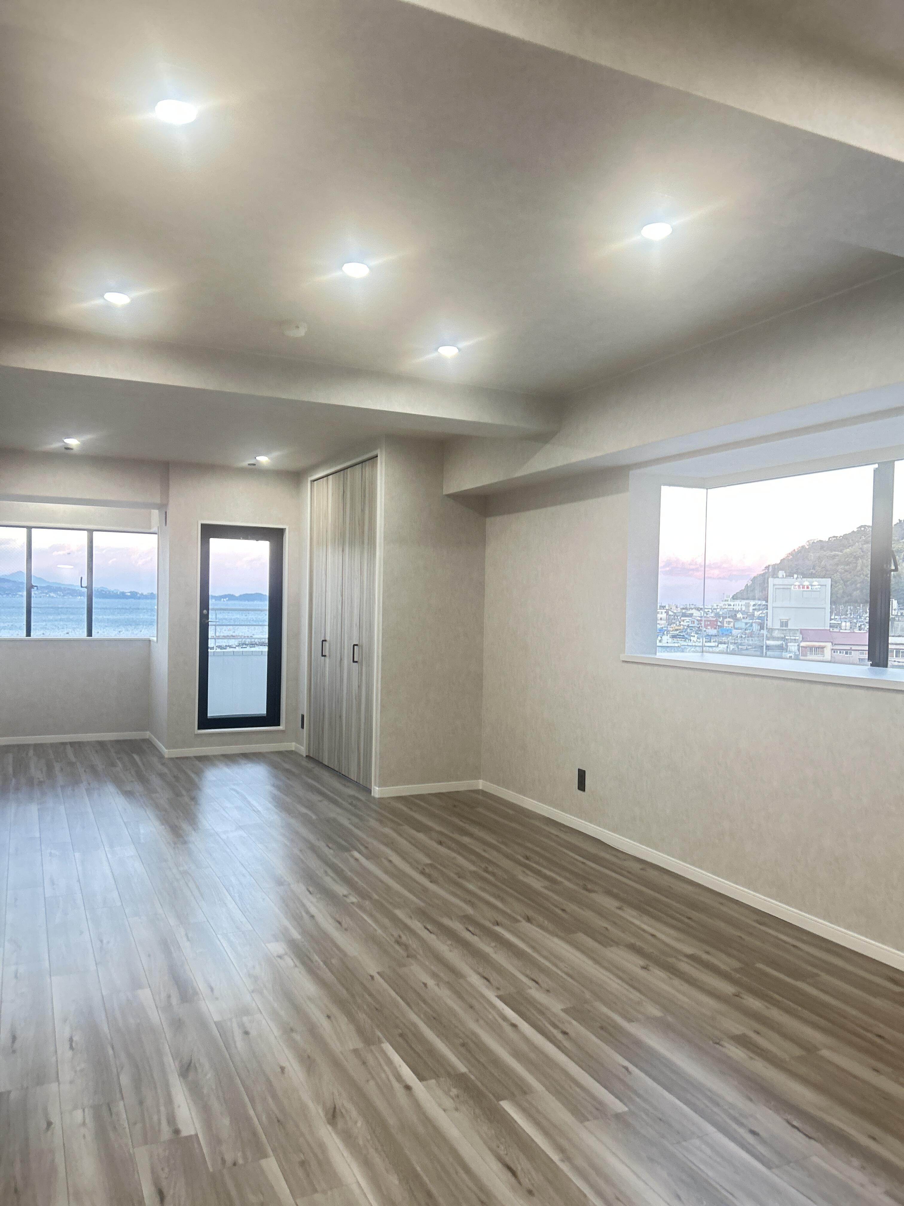 リゾートマンションの規約に則りリクシル防音フローリング。フローリング・建具のカラーを統一して、窓からの海原に溶け込むような空間をイメージし、ご提案。カラーはどちらも、グレージュエルムで統一。