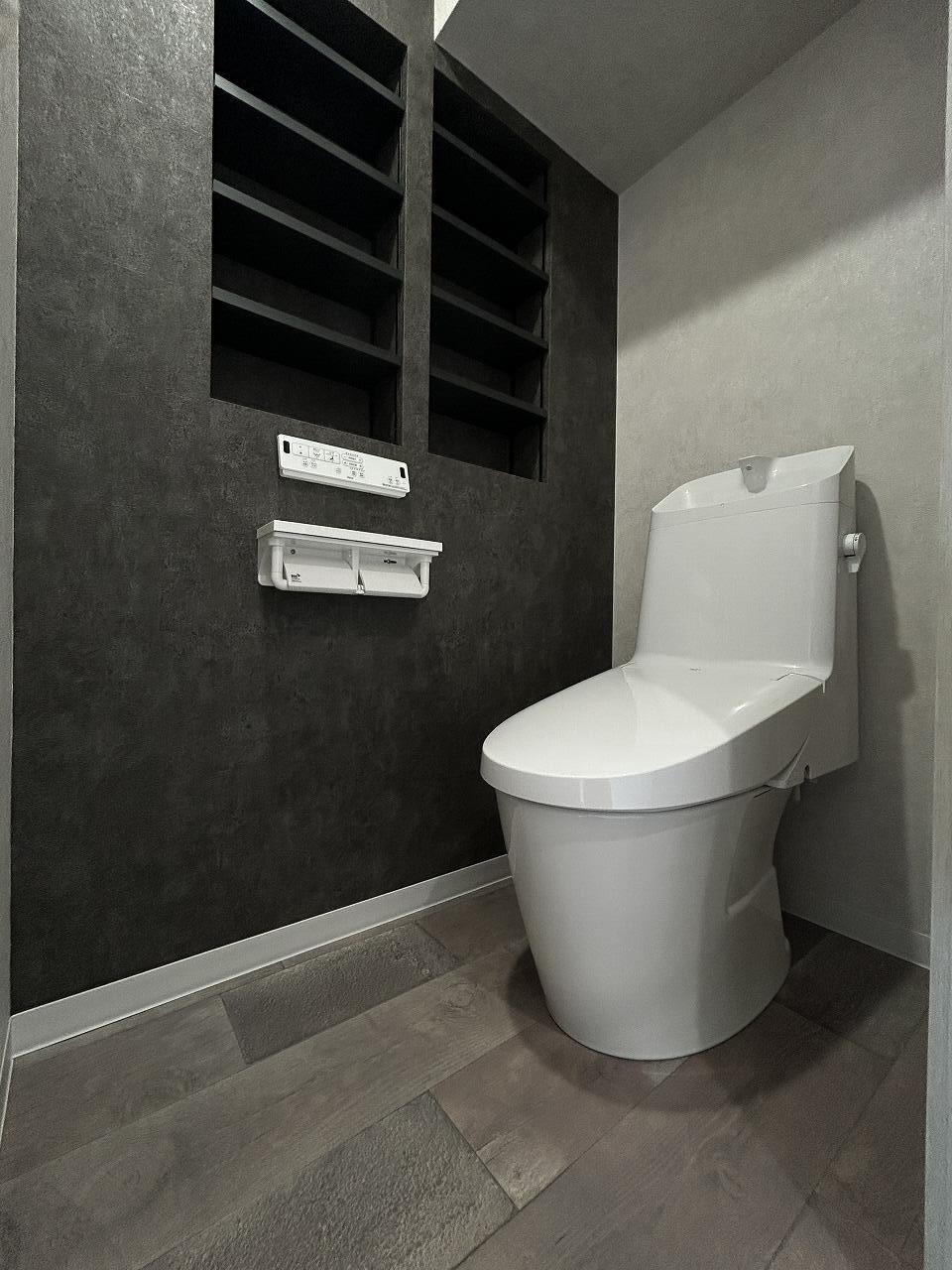 リクシルシャワートイレ・アメージュ。 突然のゲストがいらしてもちょっと自慢したくなるトイレです。飾り棚として、可動棚を造作しました。