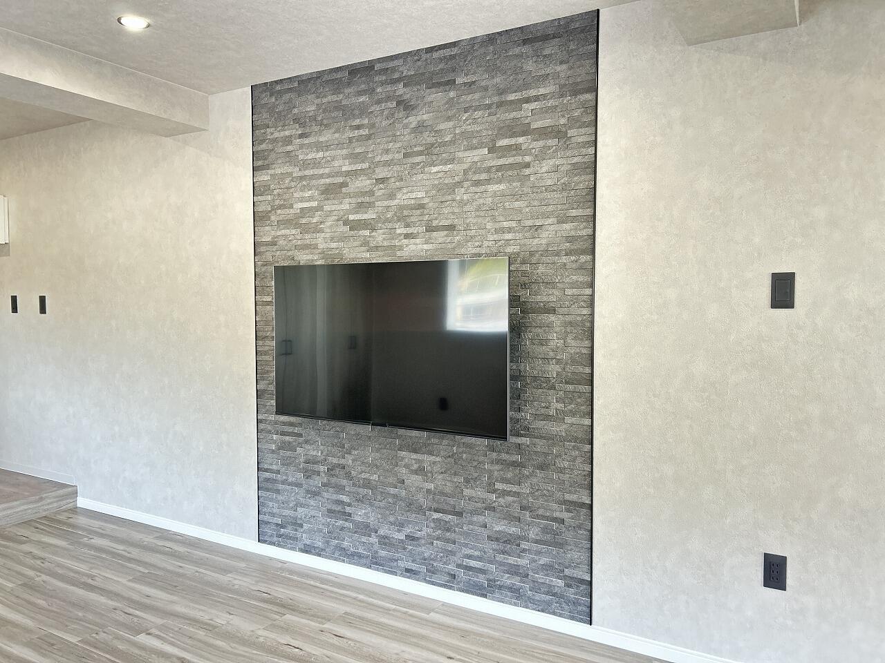 壁掛けテレビ、エコカラット!ハイクラス感いっぱいのご提案にご賛同していただき叶った壁一面!グラナスルドラを選ばれるところは、センスの良さがうかがえます。きっとご自宅もセンスのよい佇まいのはず・・・。リクシルのエコカラットは意匠性も機能性(調湿効果)も抜群です。