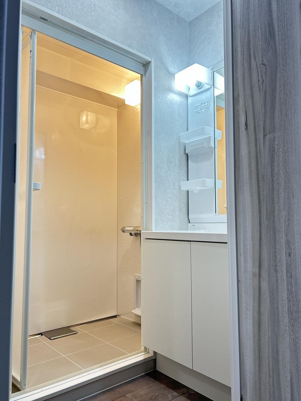 泉質の良い温泉の大浴場完備なので、ピッタリサイズのシャワーユニットで十分!脱衣室も兼ねるこの空間には収納力抜群のリクシル洗面化粧台エスタ。洗面周りのゴチャゴチャ感も解消!