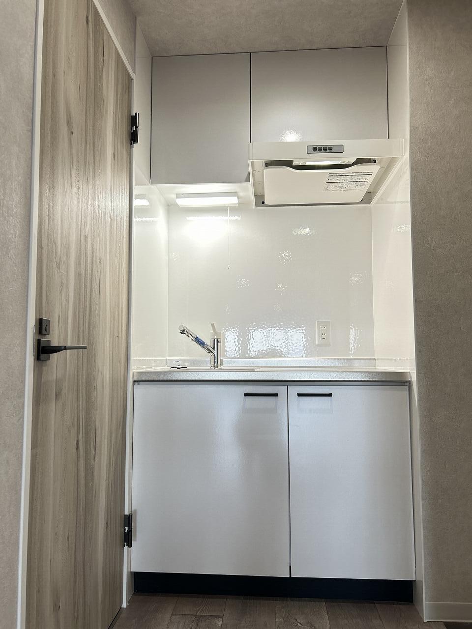 室内に入ってすぐのキッチンスペース。清潔感のあるホワイトがパッと目に留まるかわいいキッチン!