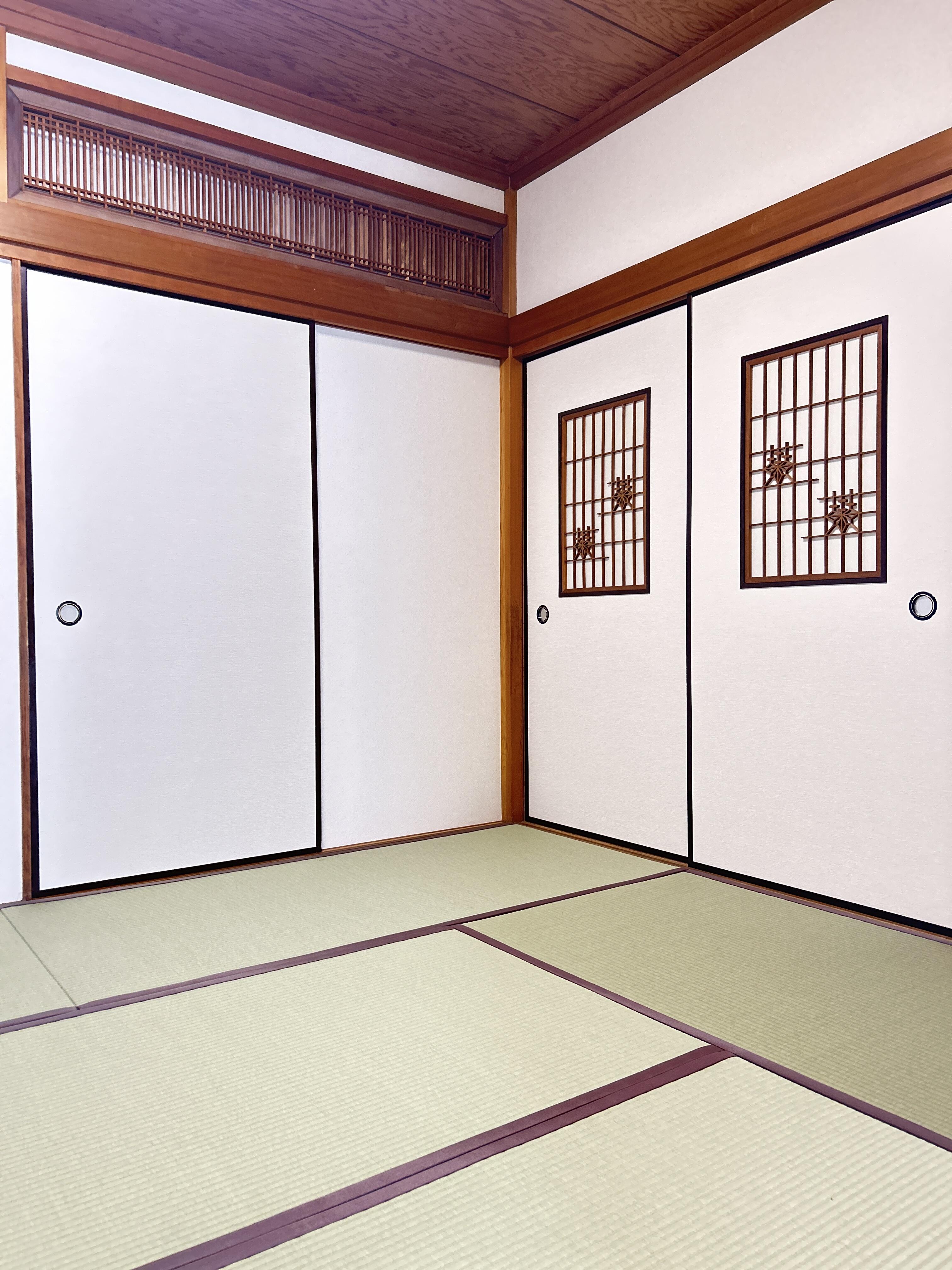下多賀にお住いのS様邸。襖で仕切る和室の2部屋。経年劣化の畳、襖、壁をリフレッシュリフォームをさせて頂きました。襖と壁を白で統一してモダンに。畳はヘリなし半畳の市松模様と、ヘリあり畳でバリエーションを楽しみます。お洒落で遊び心のある和室に生まれ変わりました。