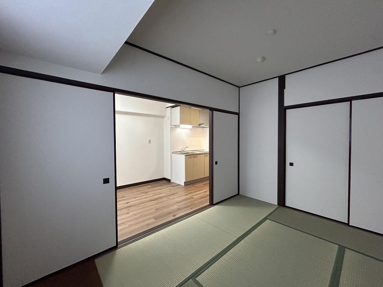 和室からキッチンまでちょうどいい距離。壁紙も白に統一。温泉を満喫した後にゴロリとできるリラックスな場所に・・・