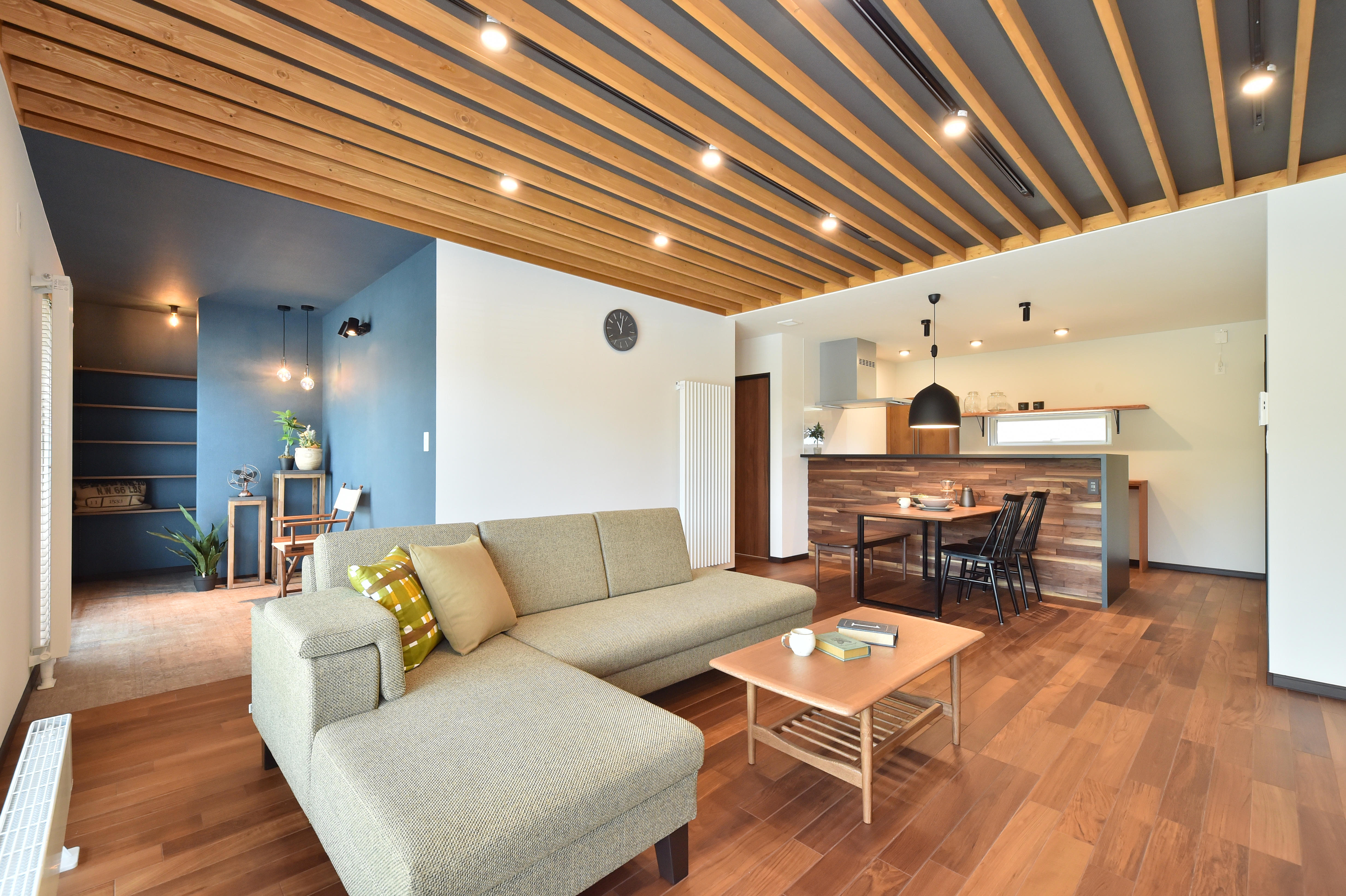 デニム生地の様なテクスチャーがオシャレで、落着いた空間のサンルーム。リビングの一角に設けているので、こちらも南西側の公園に面しています。ここで読書やお昼寝していたいですよ、私は。リビングの一部の天井はルーバー天井にして、深みを出しています。大きくとった明るいテラス窓とのコントラストがとっても美しいです。立地条件などもすごいんです。(過去のスタッフブログより一部参照)
