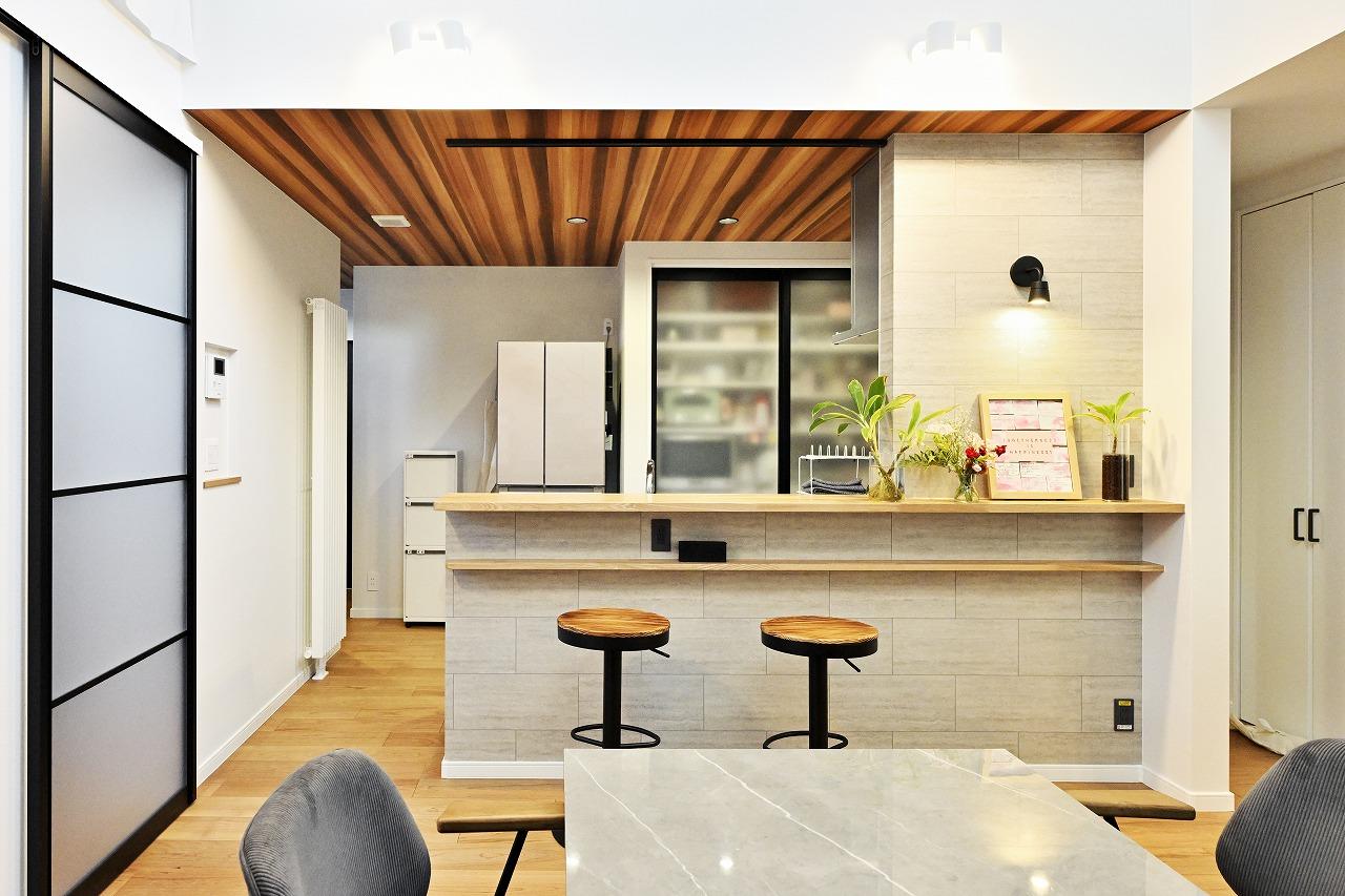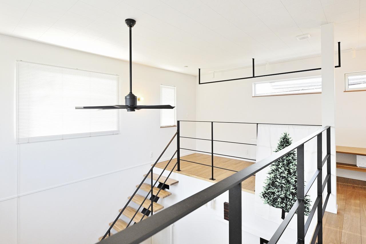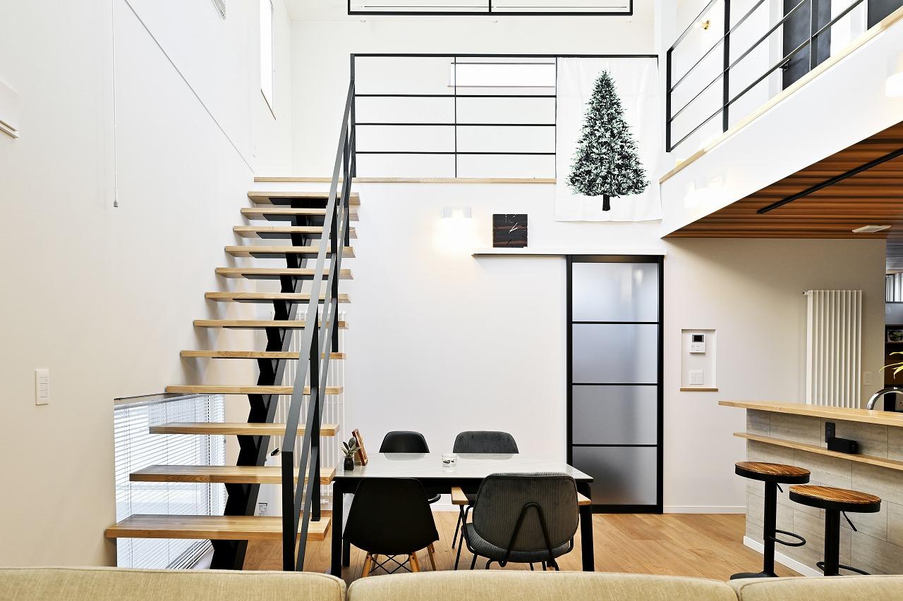 今回のプランの一番のポイントは、インナーガレージとカーポートです。敷地の広さや建物の配置などによるところが大きく、物件次第のリノベーションではなかなか実現できないプランでもあります。それ故に、より魅力的な提案ができると考え、モデルハウスとして着工を予定していました。そして偶然の出会いから、車2台分の駐車スペースと雨に当たらないアプローチというSさまの希望に合致。新居とされることになりました。もう一つのポイントは1階が70㎡ありLDKと水回り、ファミリークロークのほかに寝室を設けられたことです。さらに、既存の住宅にはなかった吹き抜けをつくり、2階には洗濯物干しにもできる広いフリースペースを設けています。2階の個室は子育て世代を意識して2部屋ご用意。Sさまはご主人がボルダリングを趣味とされていて、1部屋はボルダリングルームとして活用されると伺っています。