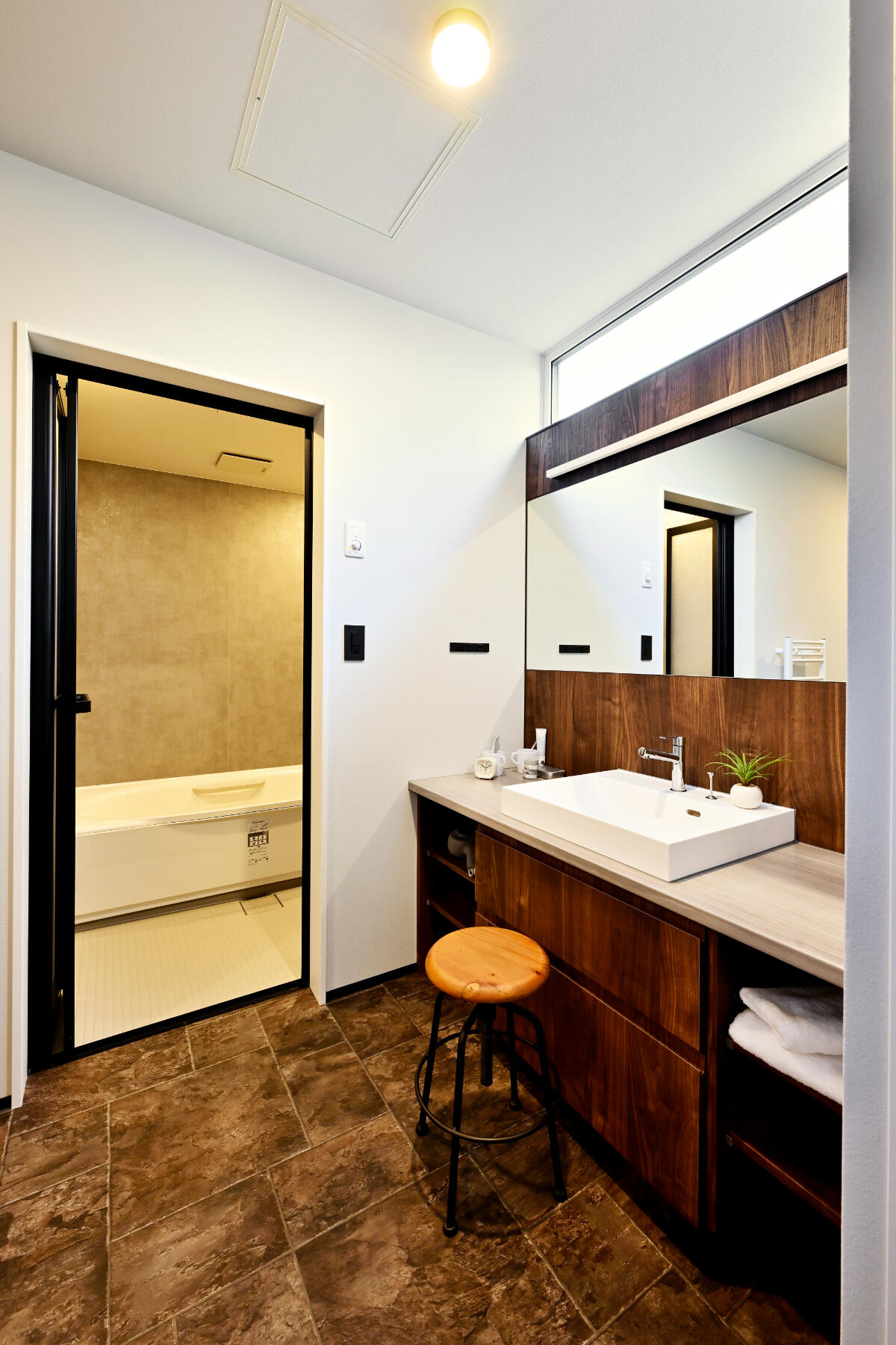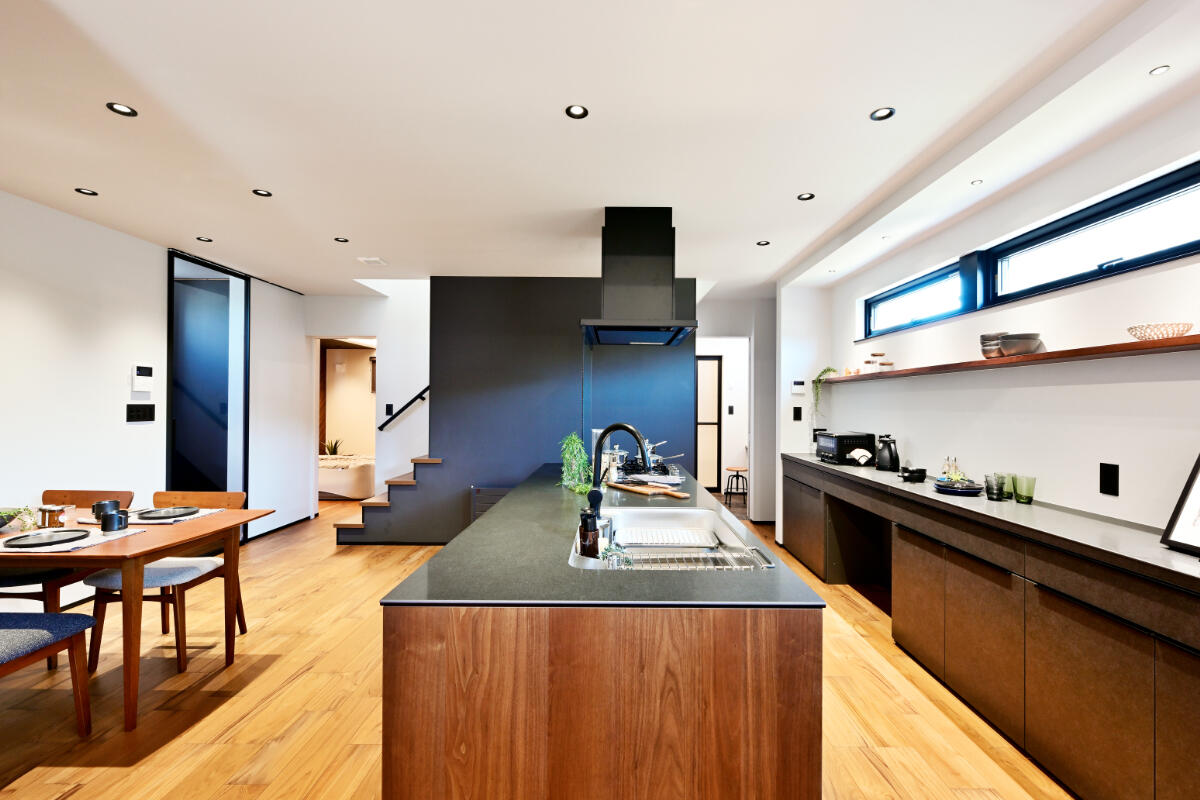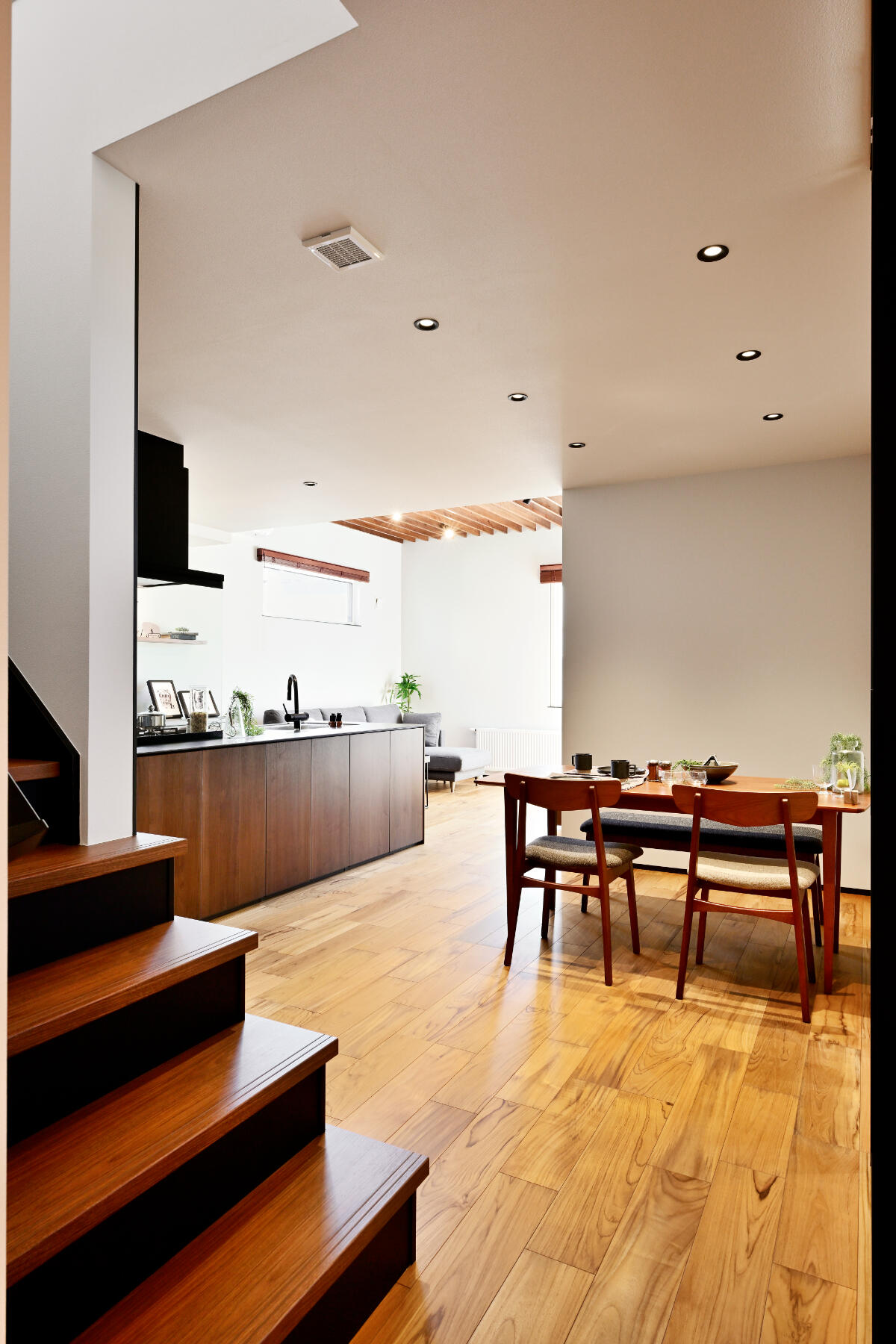 1階は主寝室を含めたすべての機能が整うと同時に、LDK~水回り~主寝室~再びLDKとぐるり1周できる回遊動線で、1階だけで暮らしが完結する平屋感覚を取り入れた設計プランになっています。