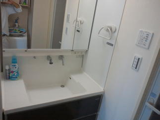 洗面化粧台はミラー裏にたっぷりの収納スペースがあるのでいつもすっきりと片付けられます。また側面の壁には、水ハネなどの汚れをガードする洗面パネルを取り付けました。もちろんお手入れ楽々です。