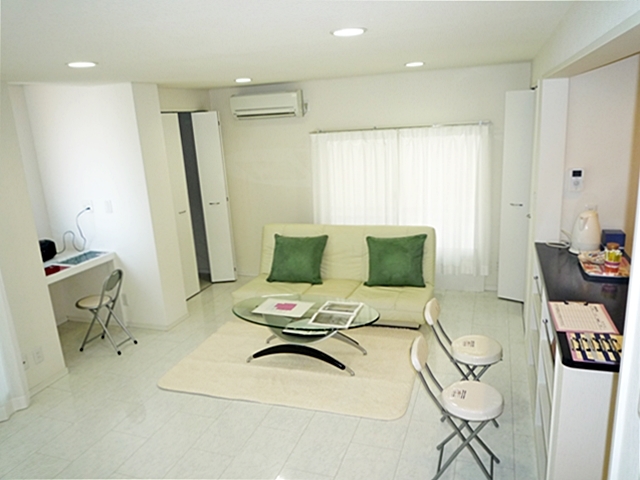 白で統一されたお部屋。クッションなどにポップカラーを取り入れ、インテリアを楽しめます。