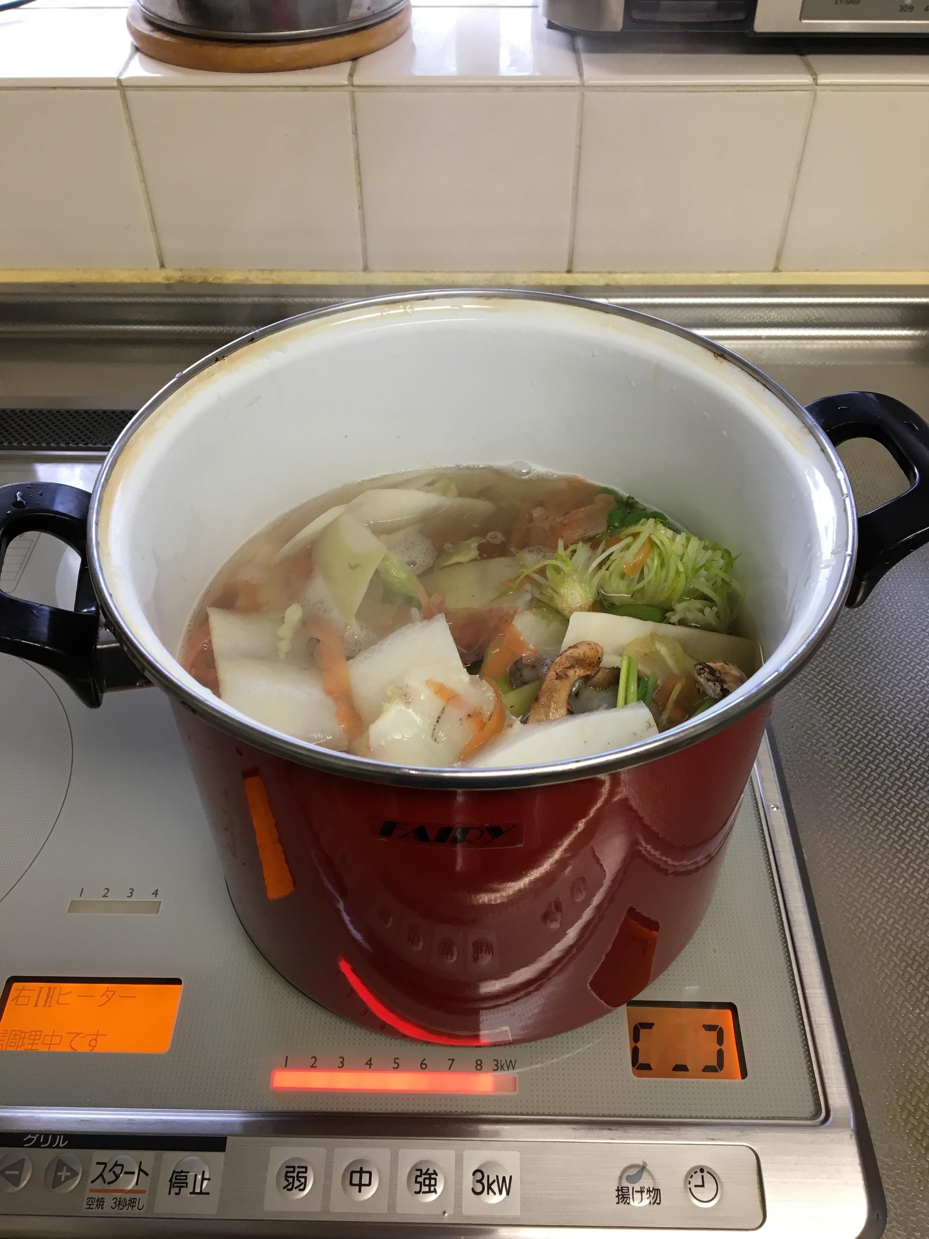 この野菜クズを鍋に入れ、水を入れてコトコト30分煮出します。