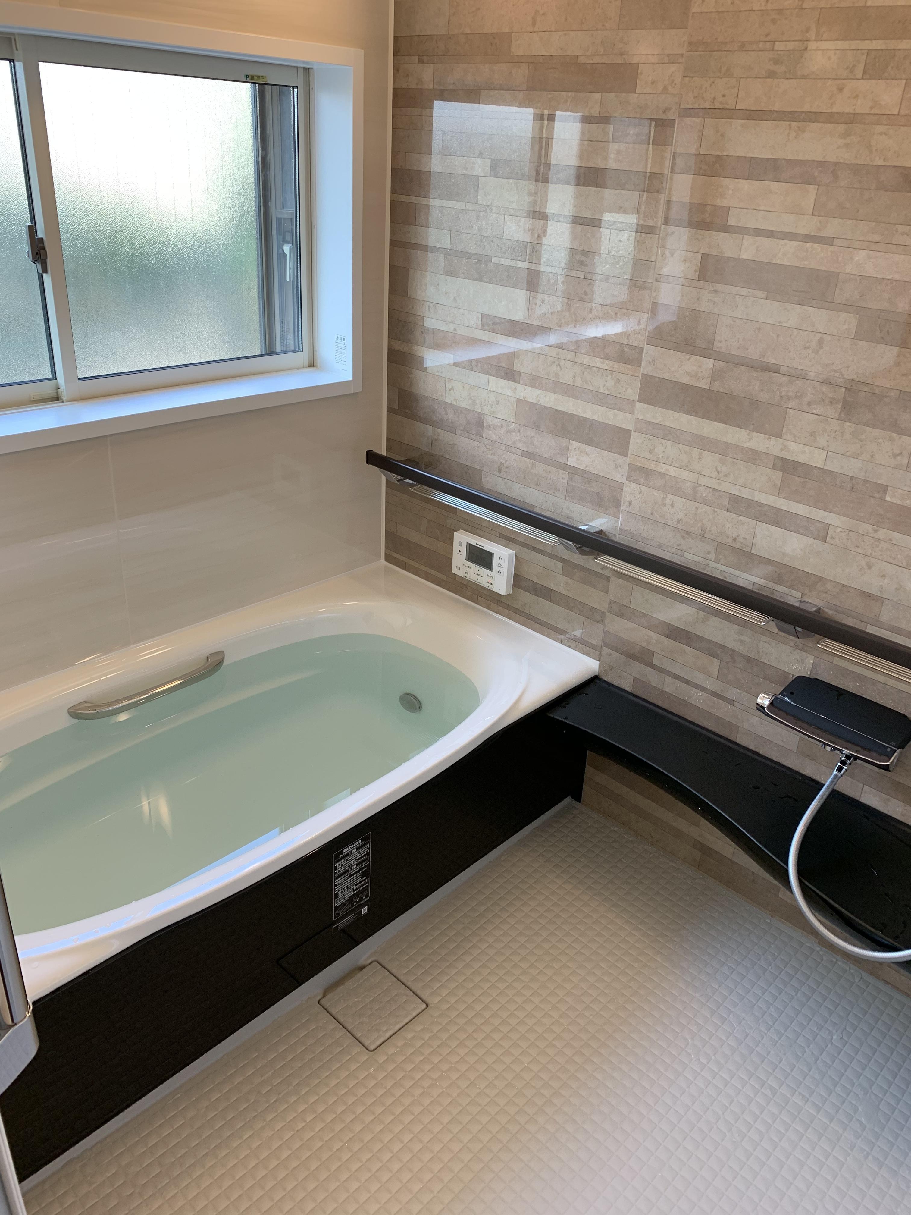 浴室改修工事をさせていただきました。落ち着いた感じで広く感じますね。お手入れも楽になり快適な浴室に生まれ変わりました。