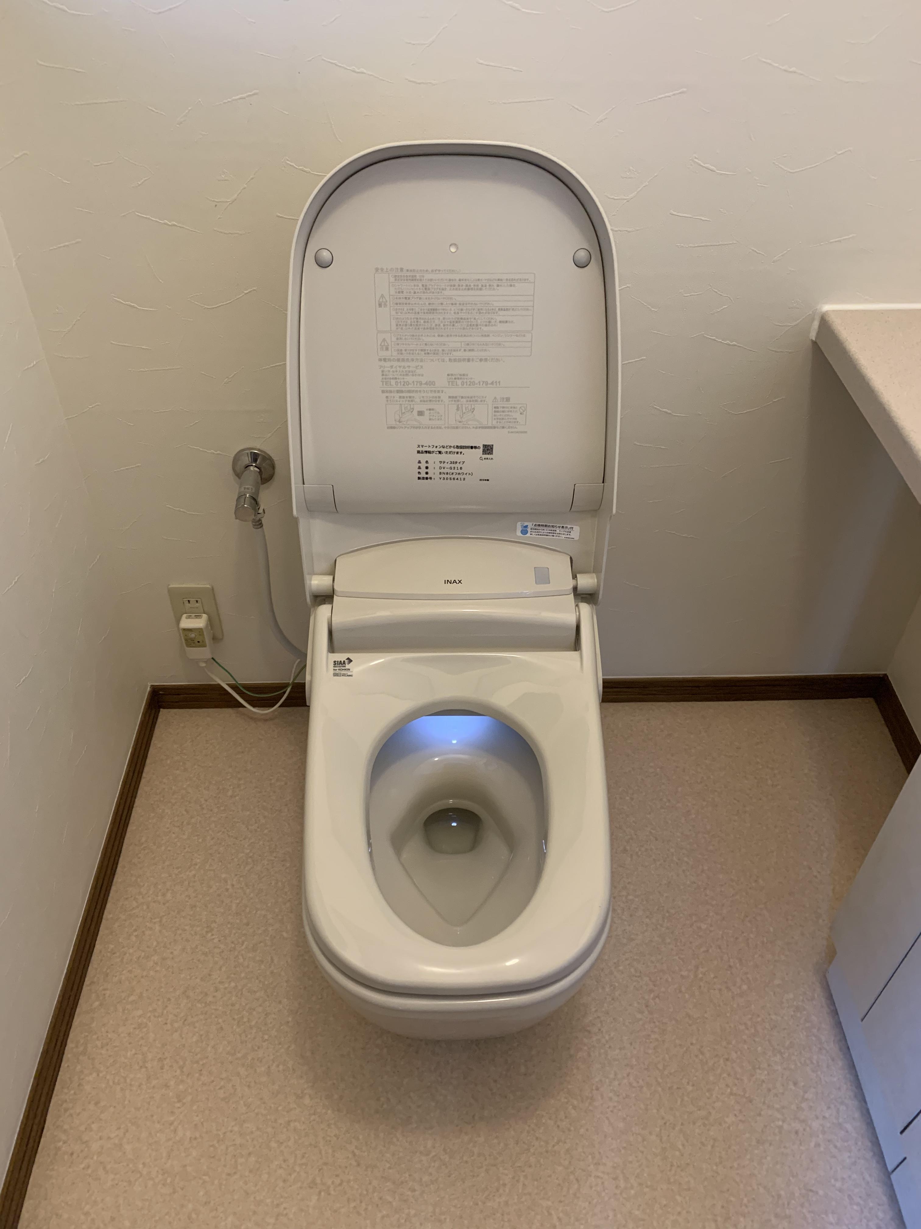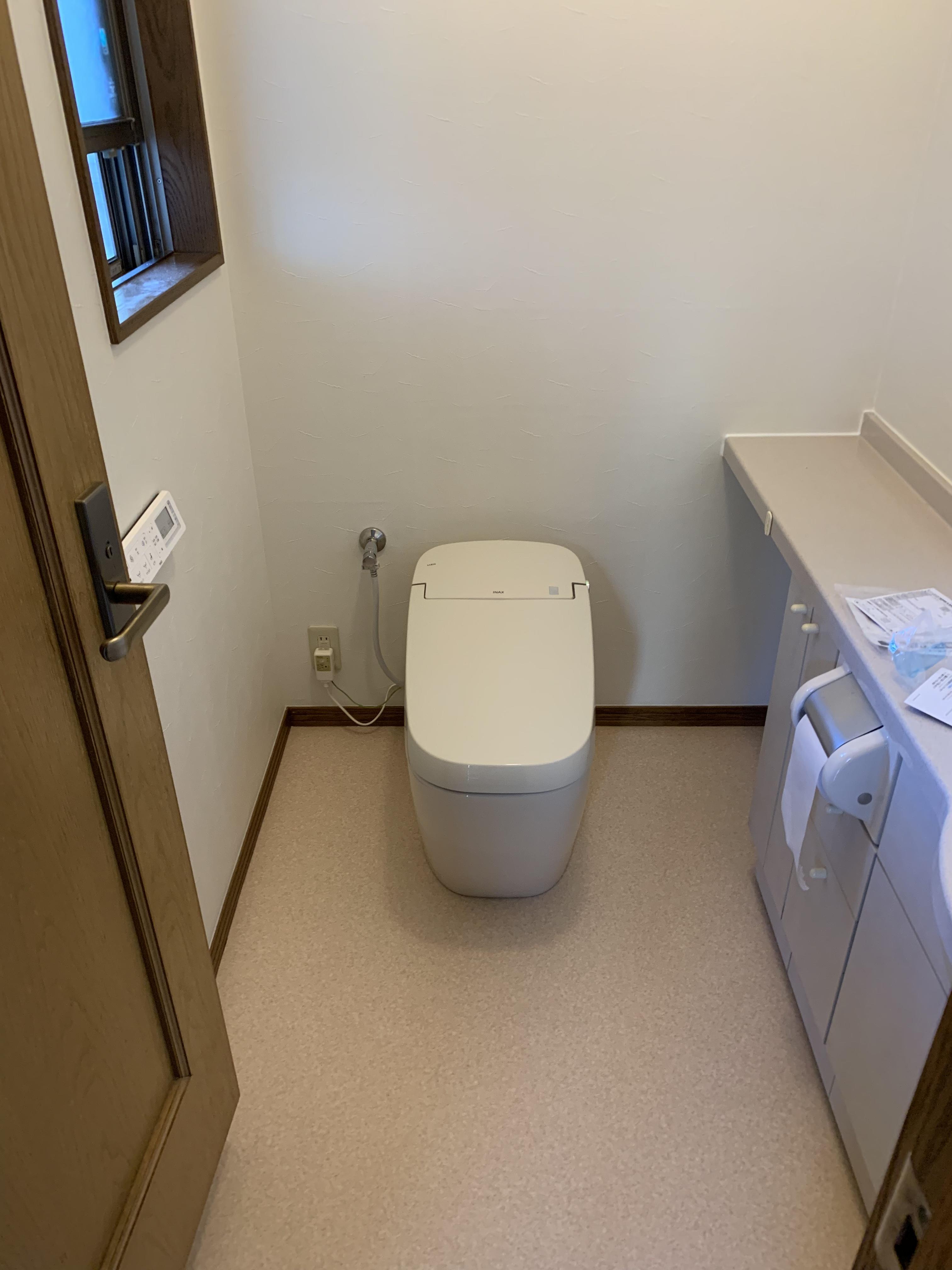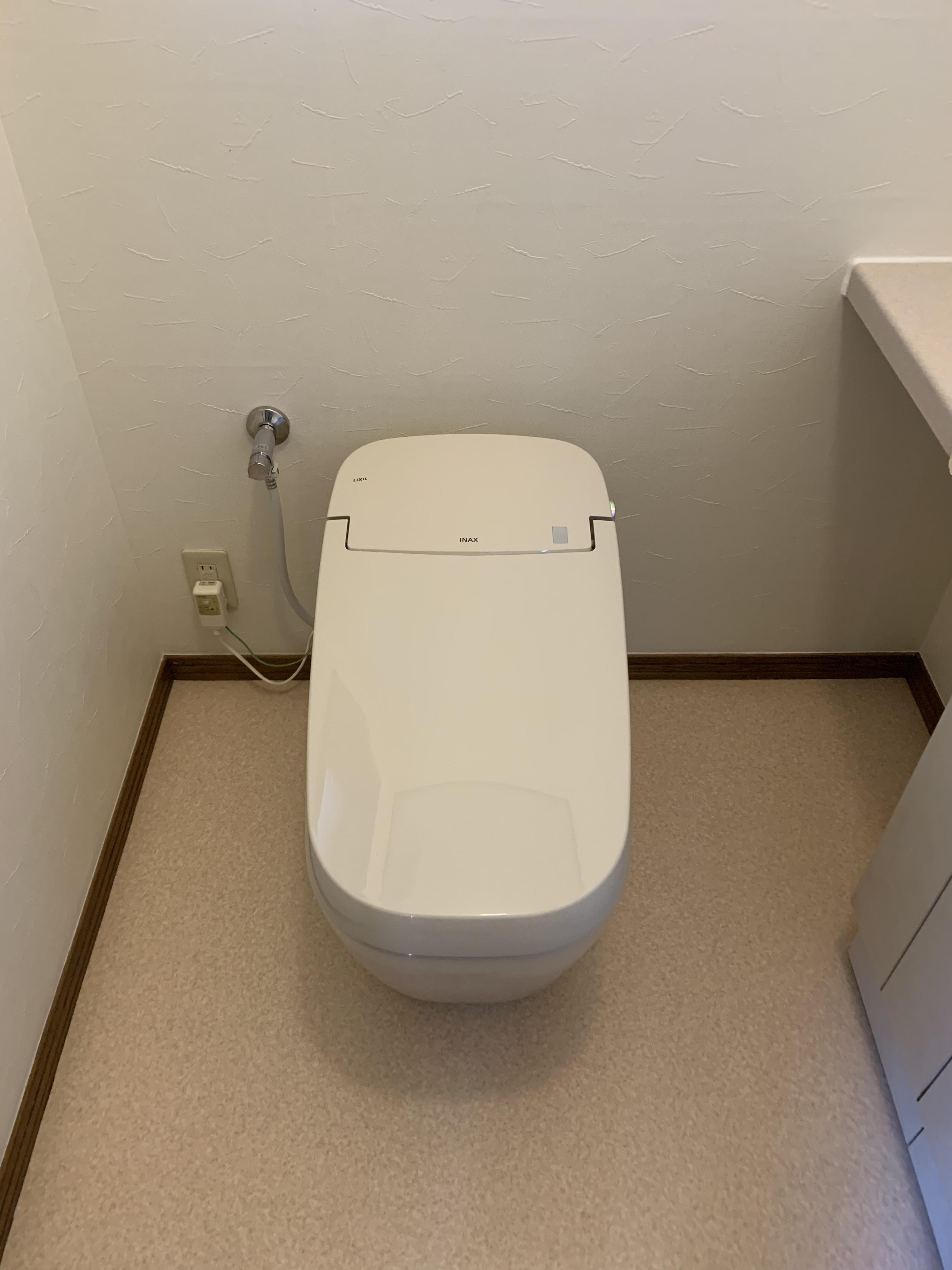 LIXILサティスGタイプのトイレを選定いただきました。床のクロスも張替えました。タンクがなくなった分、スッキリしてお掃除もしやすくなりました。コンパクトなタンクレストイレになって、より広く清潔感のある空間になりました。