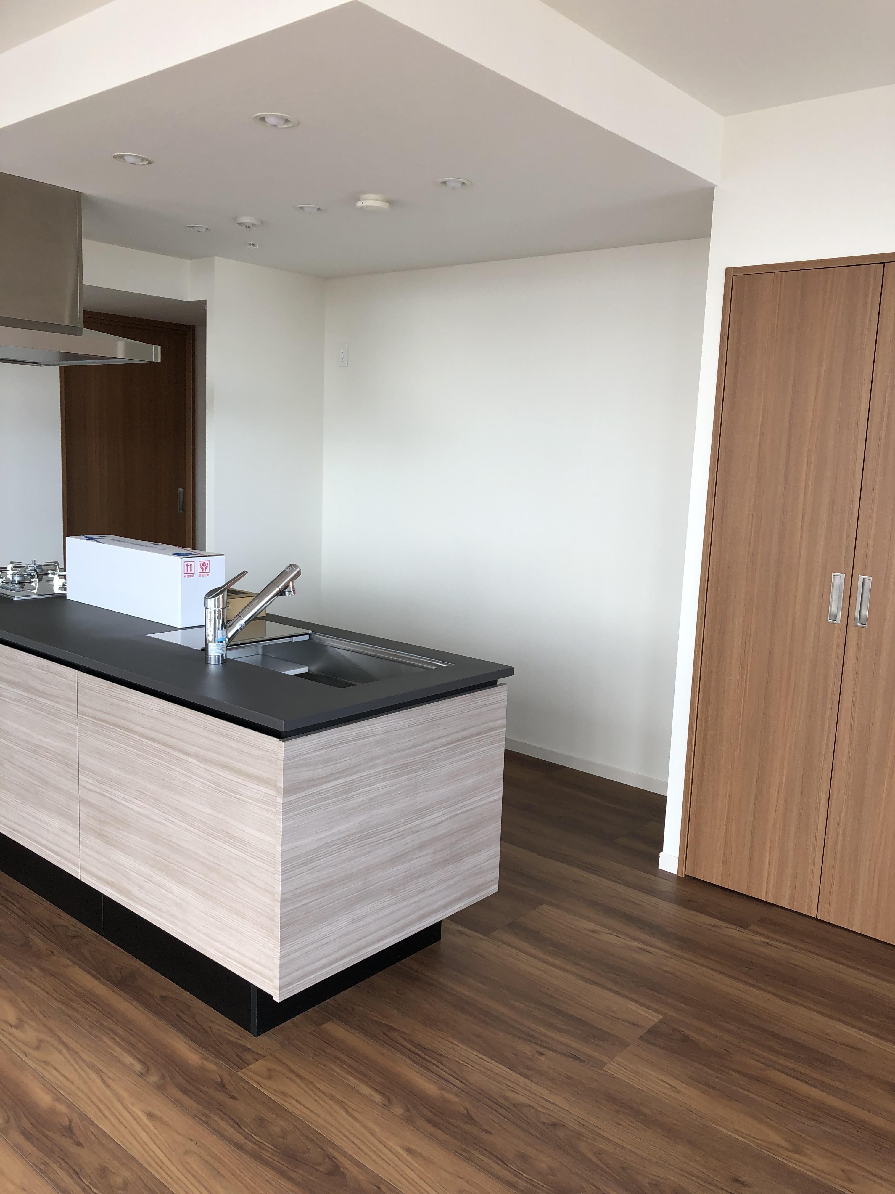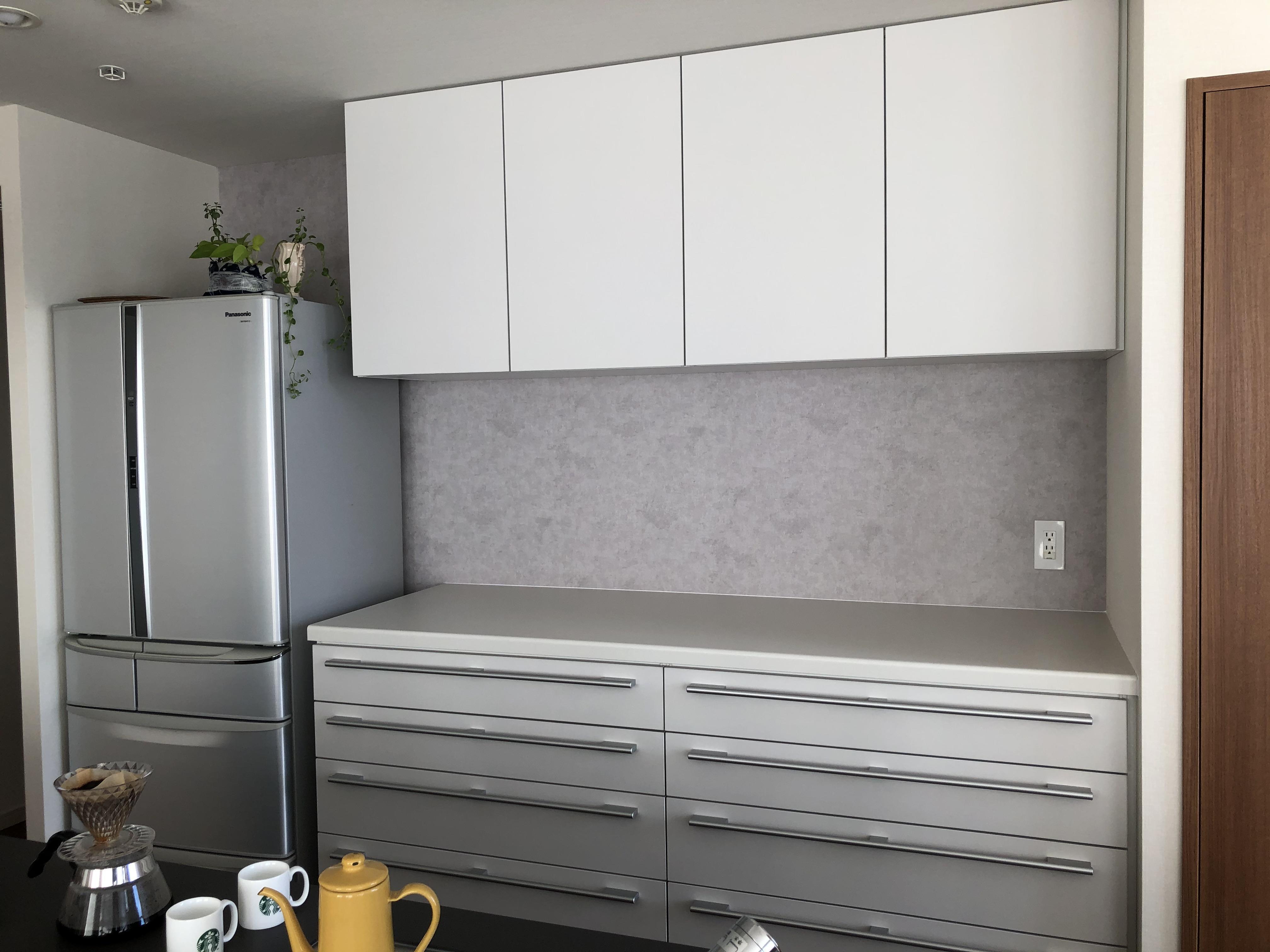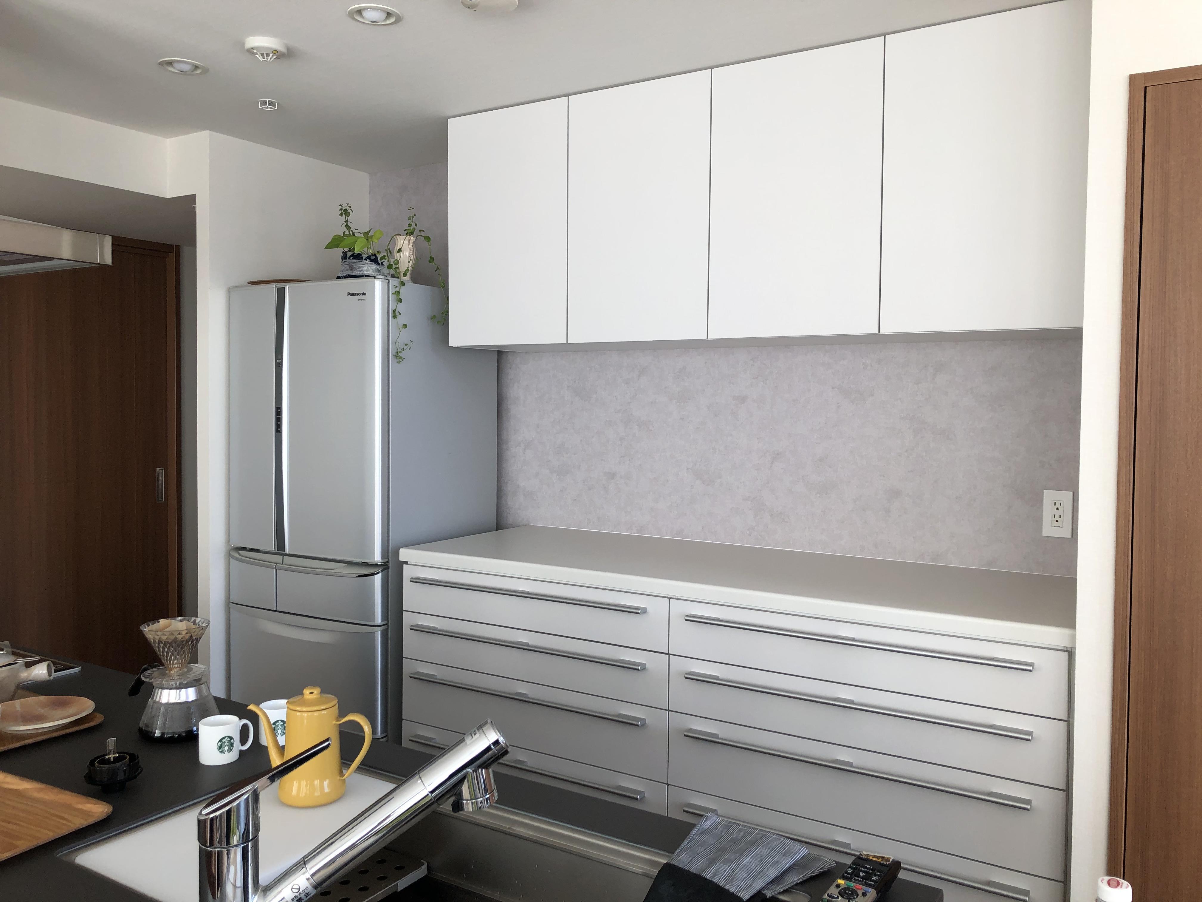 お嬢様と一緒にキッチンに立つ事を考えて、背面カウンターでの作業スペースを確保したいとのお考えでした。窓が多く明るいリビングダイニイングキッチン,存在感のあるアイランドキッチンは2人で作業出来る広さが十分にあったので、収納力抜群のリシェルSIをお選びいただきました。冷蔵庫の奥行きと合わせスッキリとした空間になりました。壁、クロス、ブラインドが白なので奥様の提案で背面収納部分のところだけクロス貼り雰囲気を変えました。扉カラーはマットホワイトです。マットな質感が上品さを醸し出し、清潔感を引き立て、さらに明るく気持ちのよいキッチンになりました。