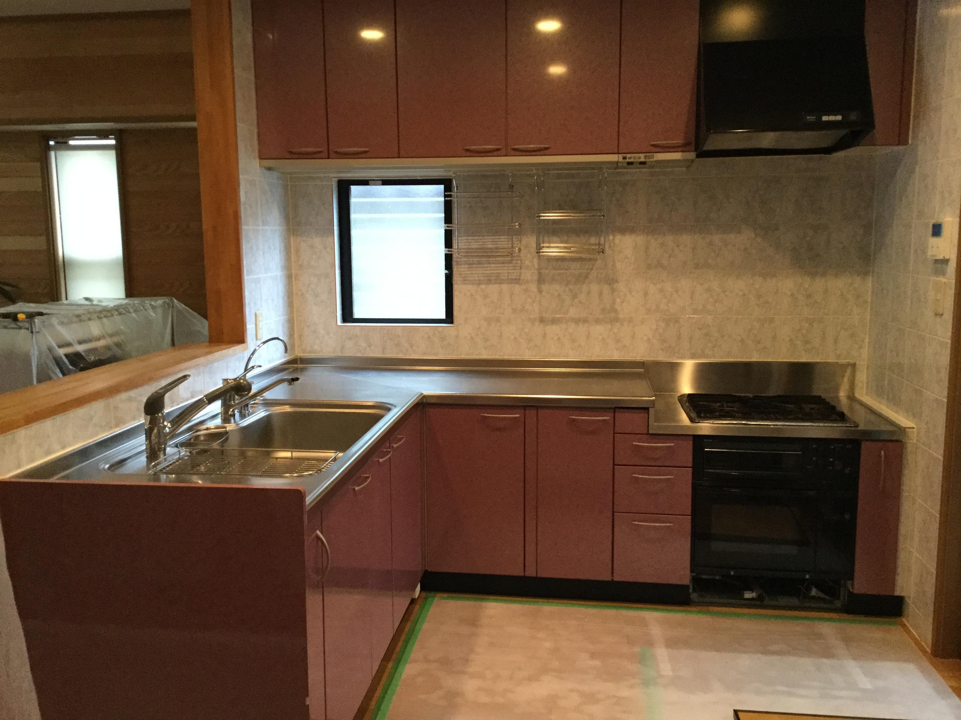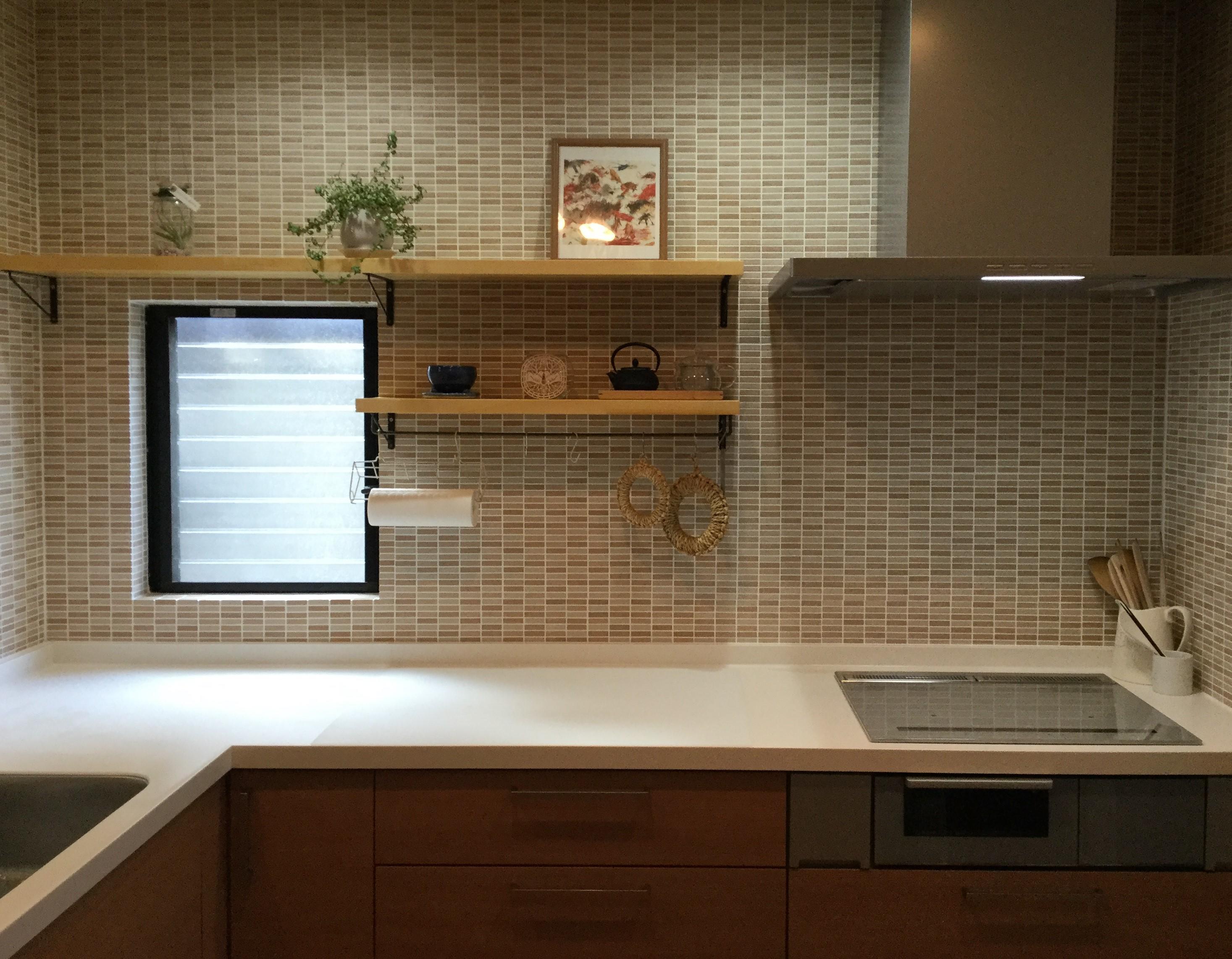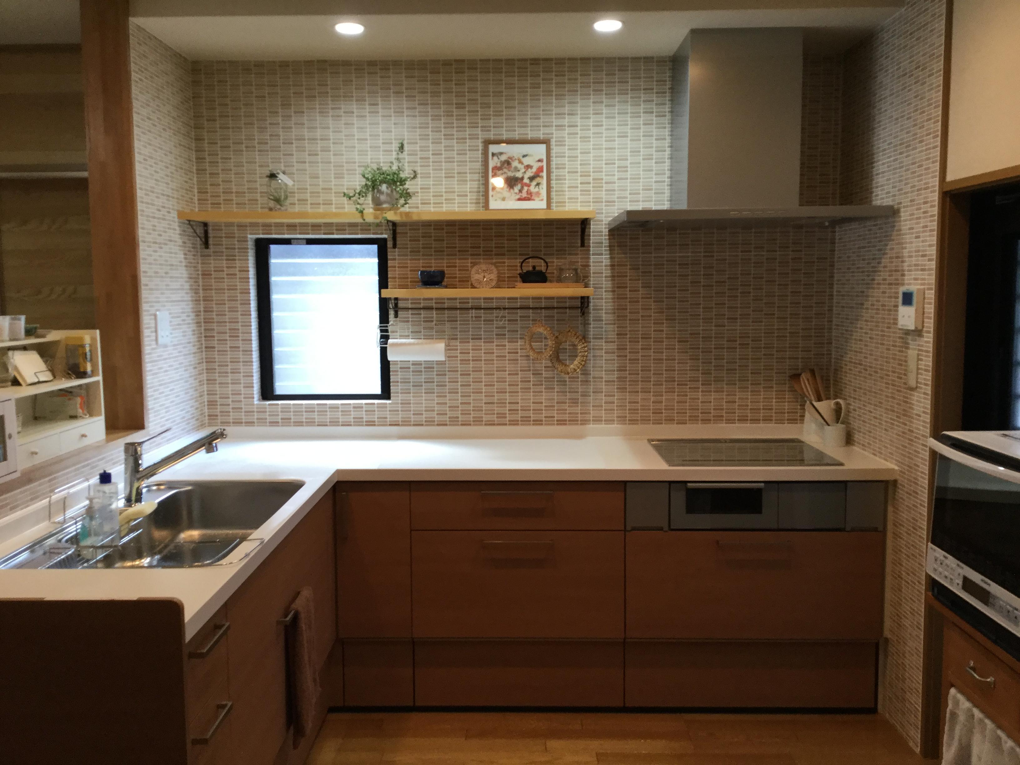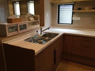 キッチンの取替工事をさせていただきました。L型かI型か悩まれましたが、LIXIL アレスタL型をお選びいただきました。内装壁タイルも取り替えて、温かみのあるやさしい色合いになりました。
