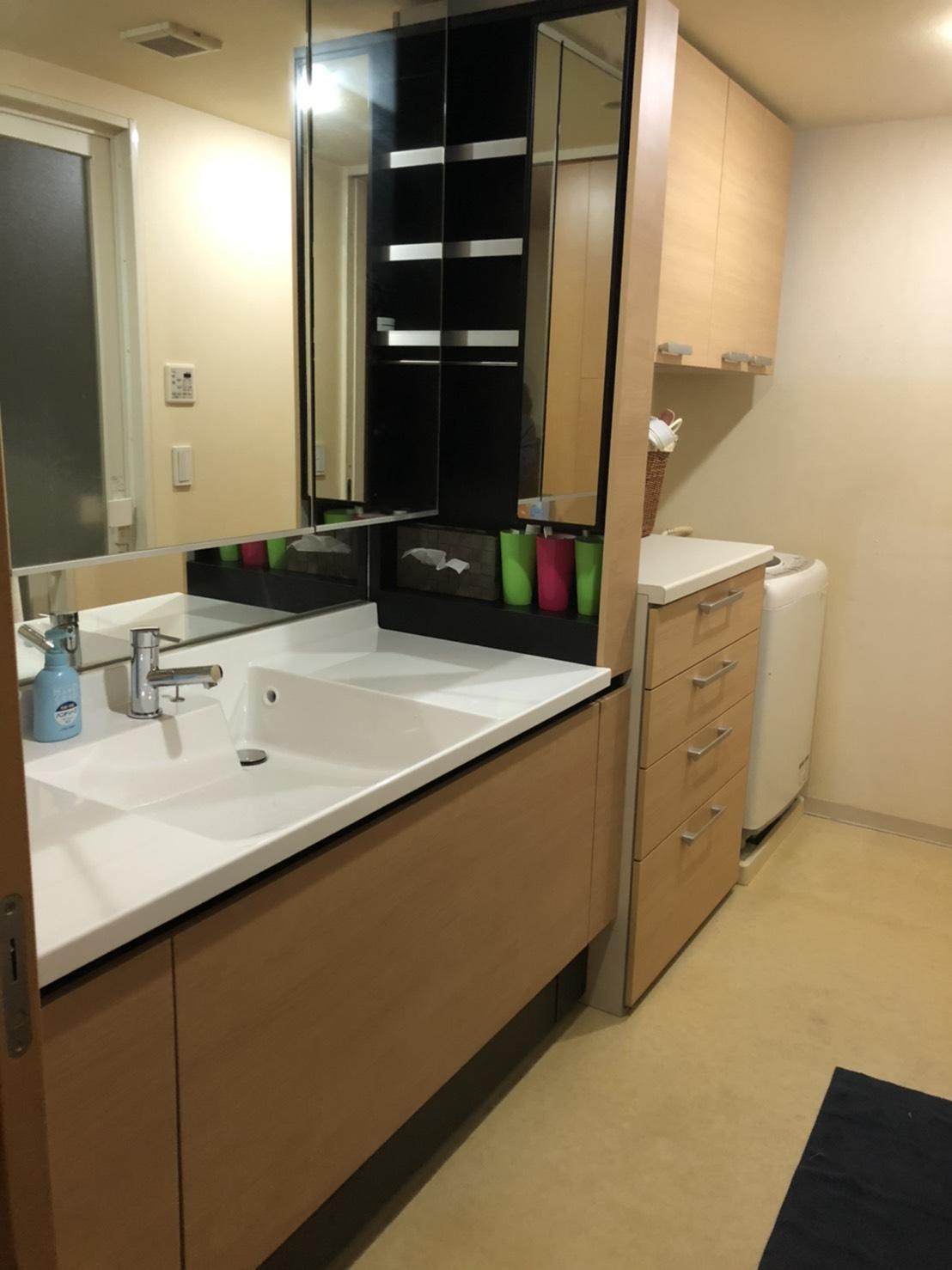 以前の洗面台と同じサイズですが、広々としたゆとりある空間に感じます。 化粧台横には薄型のトールキャビネットを取付け小物も収納できます! 洗濯機とキャビネットもピッタリ収まり使いやすい洗面化粧室になりました。