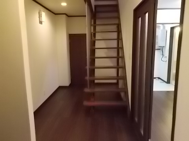 1階ホール改修工事を行いました。階段の塗装、壁・床・天井の貼替、建具や照明の交換を行い新築のように綺麗になりました。