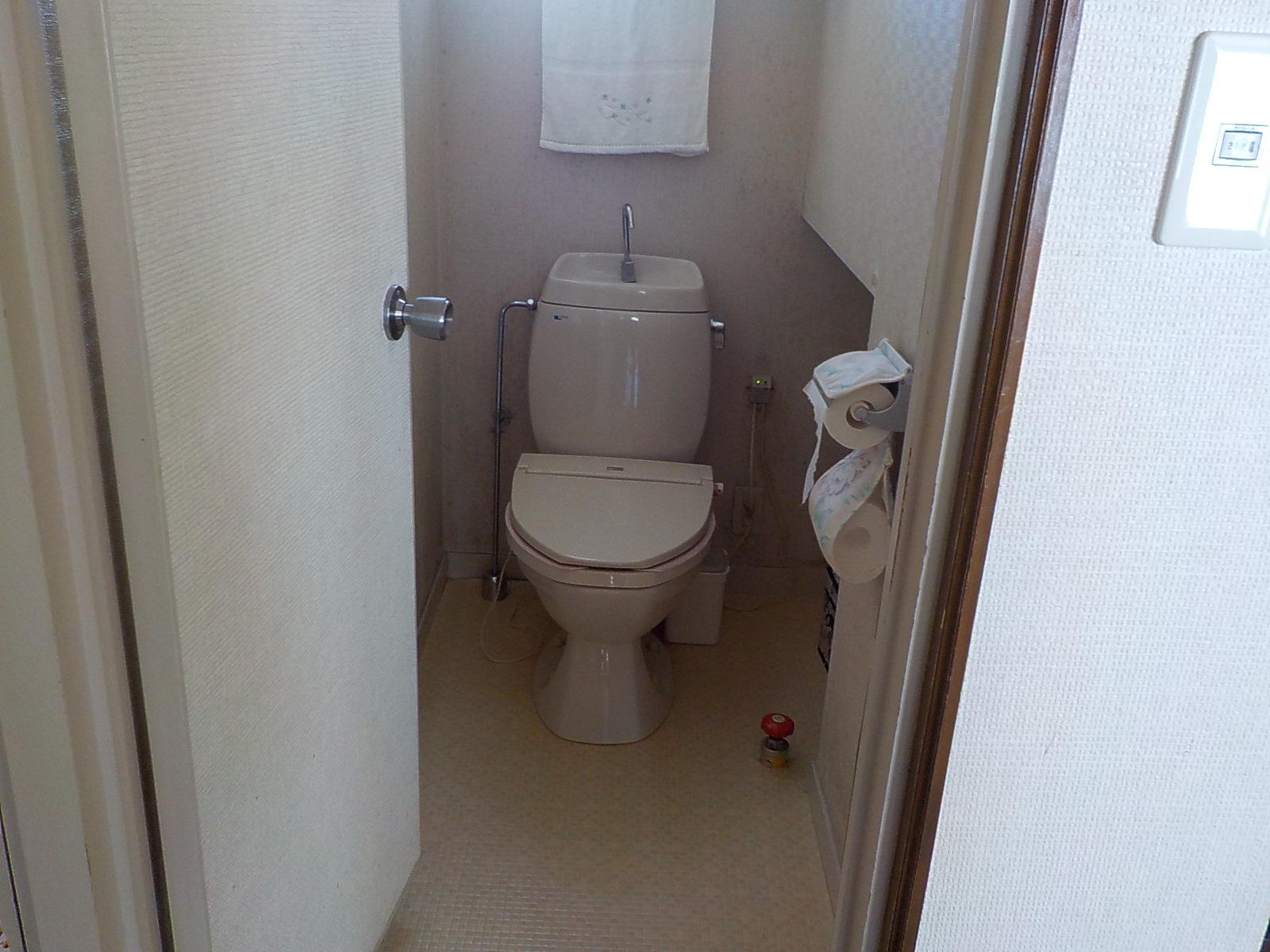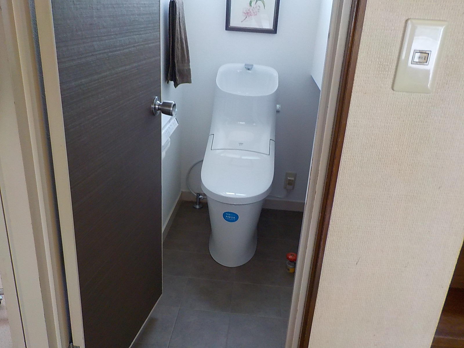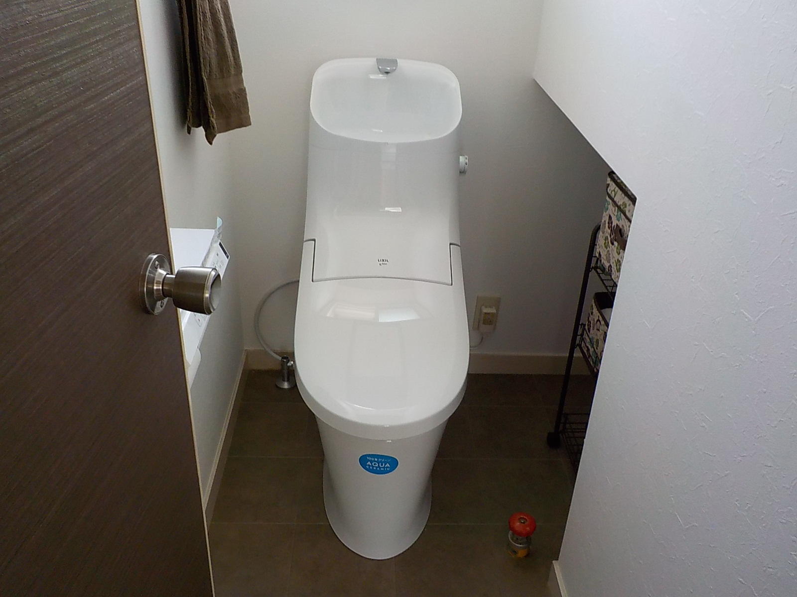まず、トイレの形がお気に入りです。手洗部分もシャワーみたいに水が出るので、飛び散らず良いと思います。 ドアのクロスと、床のクッションフロアーを同系色にしてかっこいいトイレになったと思います。