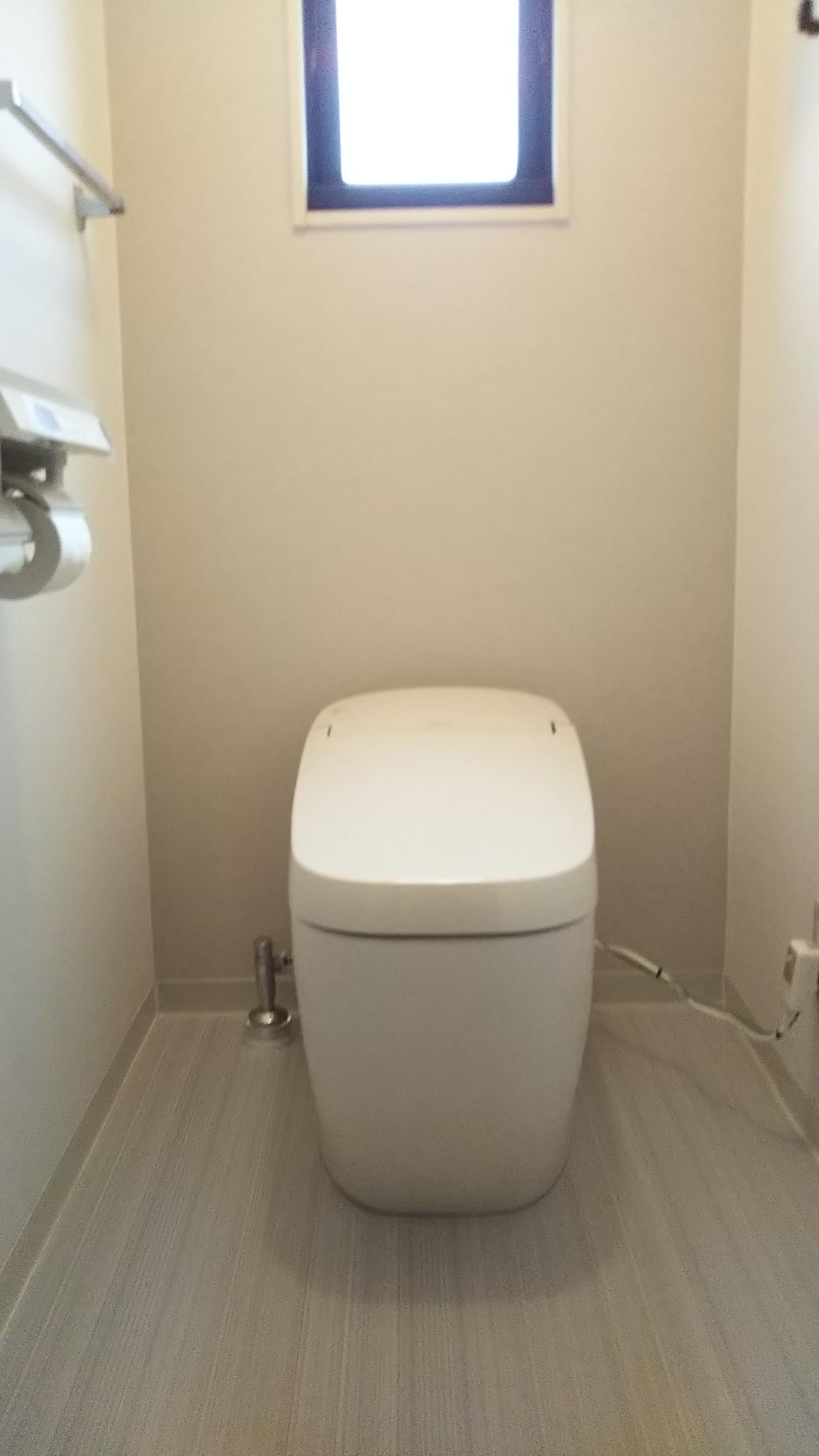 多機能なトイレをご希望ということで、サティスGをご採用いただきました。背面のみ色を変えることもできるとご提案させていただき、クロスの貼り替えも行いました。タンクが無くなりスッキリとした空間になりました。この度はありがとうございました。