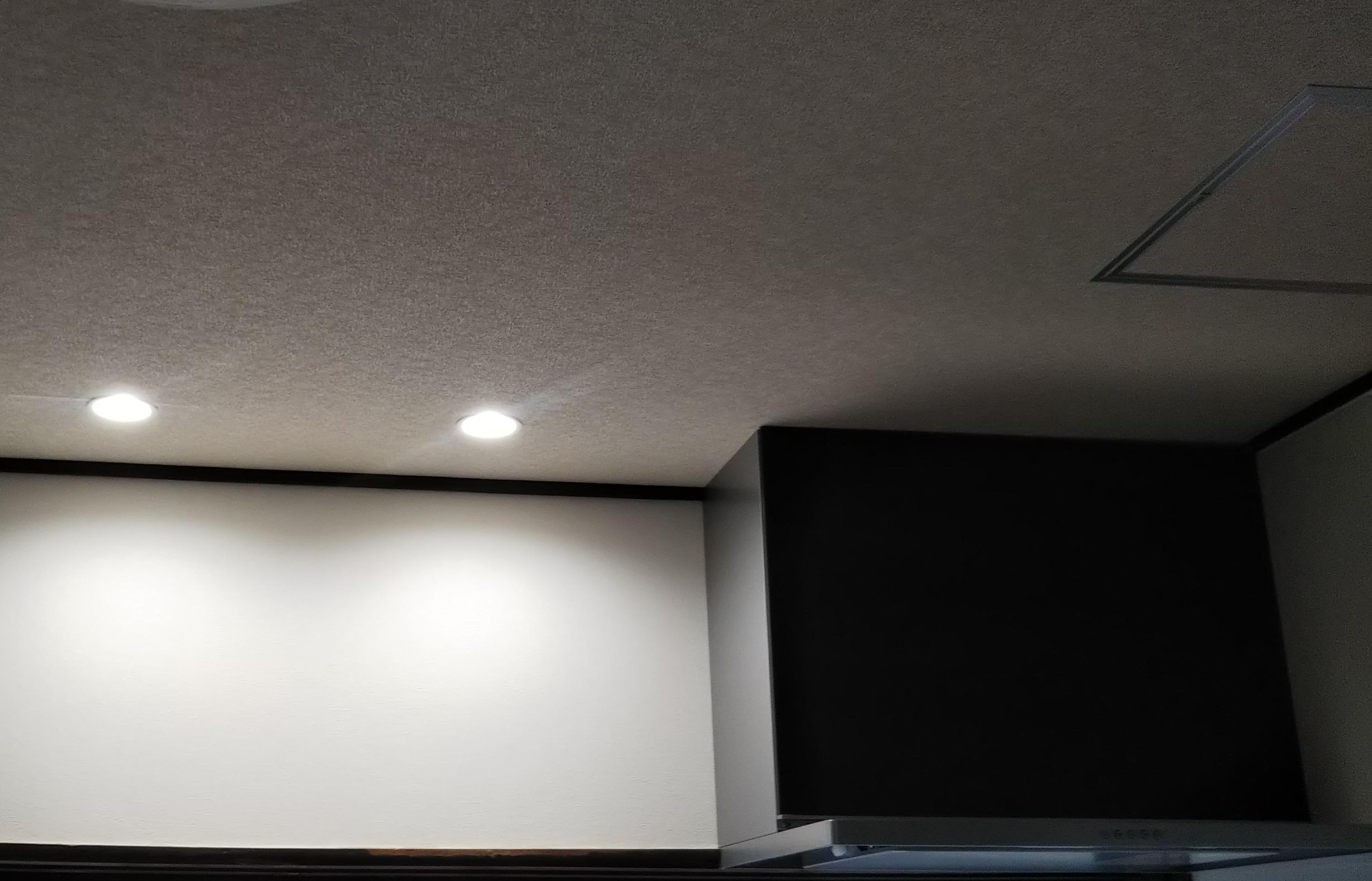 キッチンの取り替えで、キッチン自体に収納がたっぷりだったのでこれまであった吊戸を取り外し照明を取付け明るくなりました。